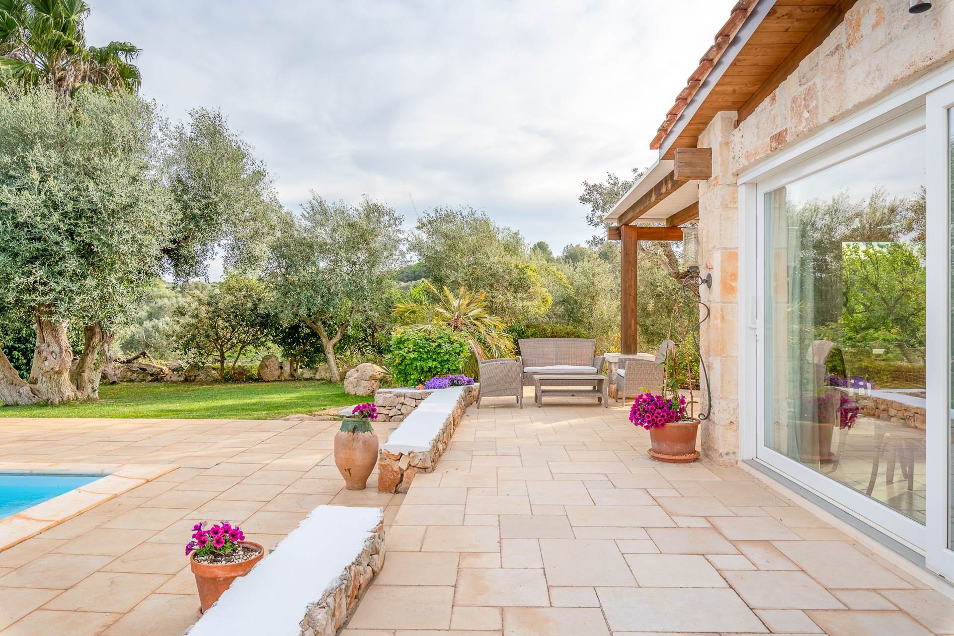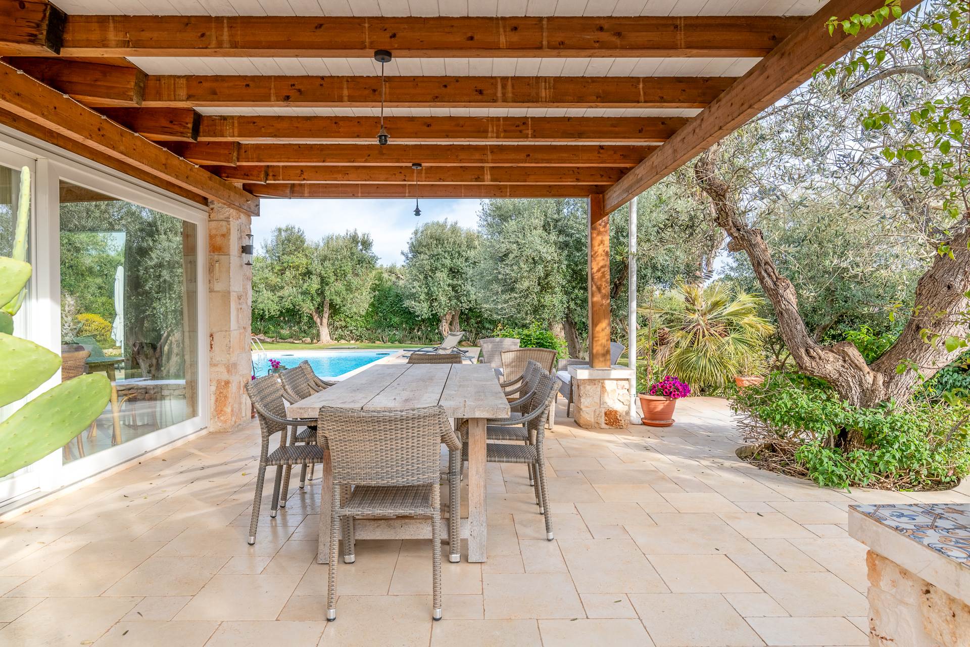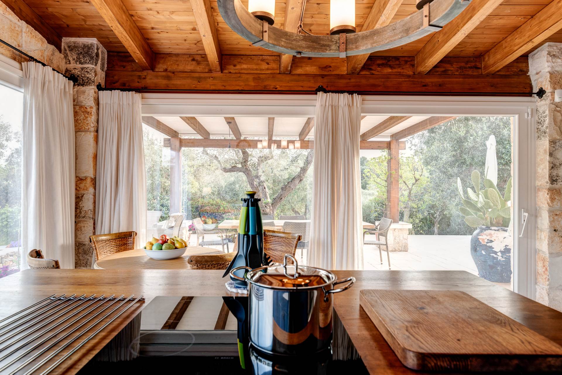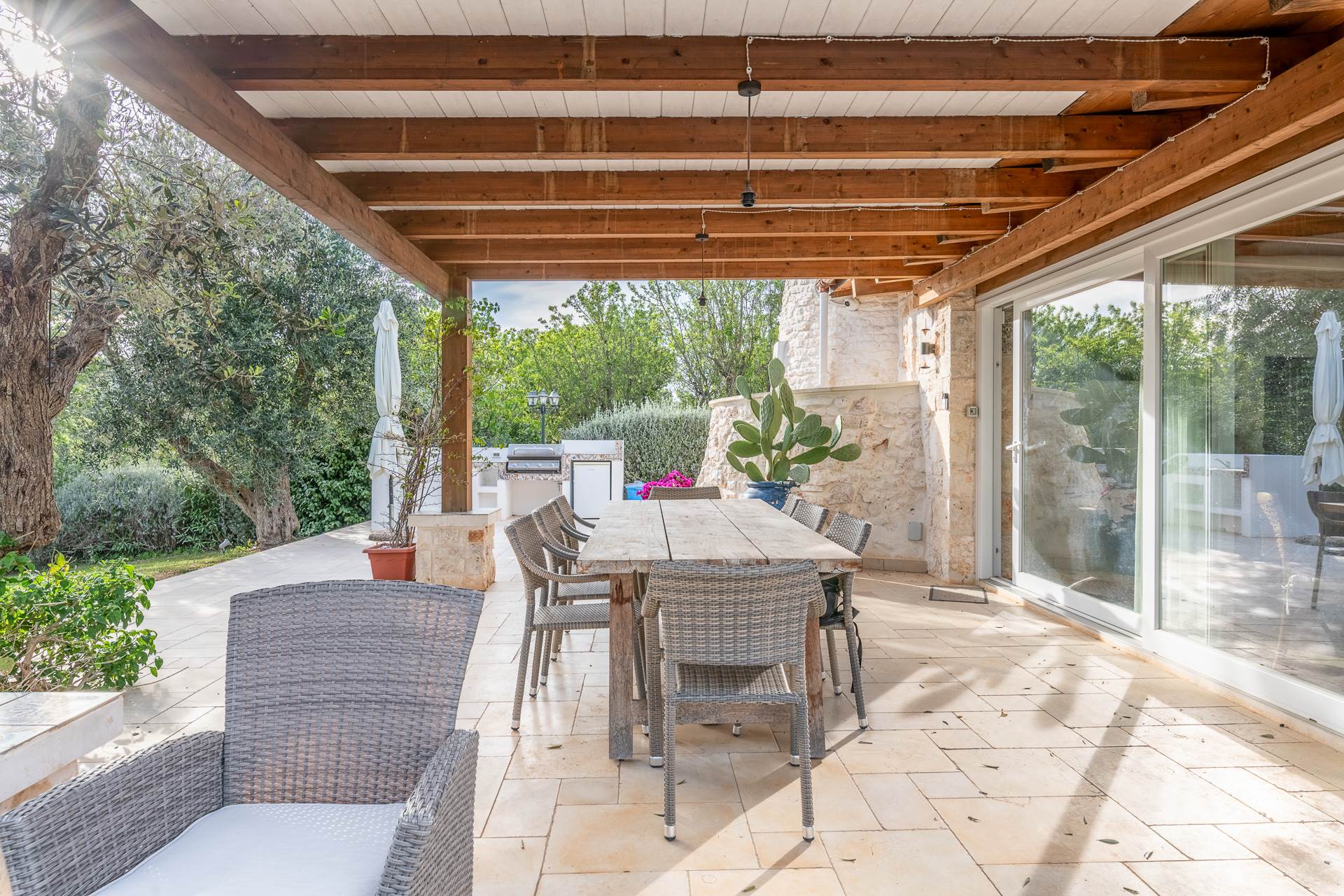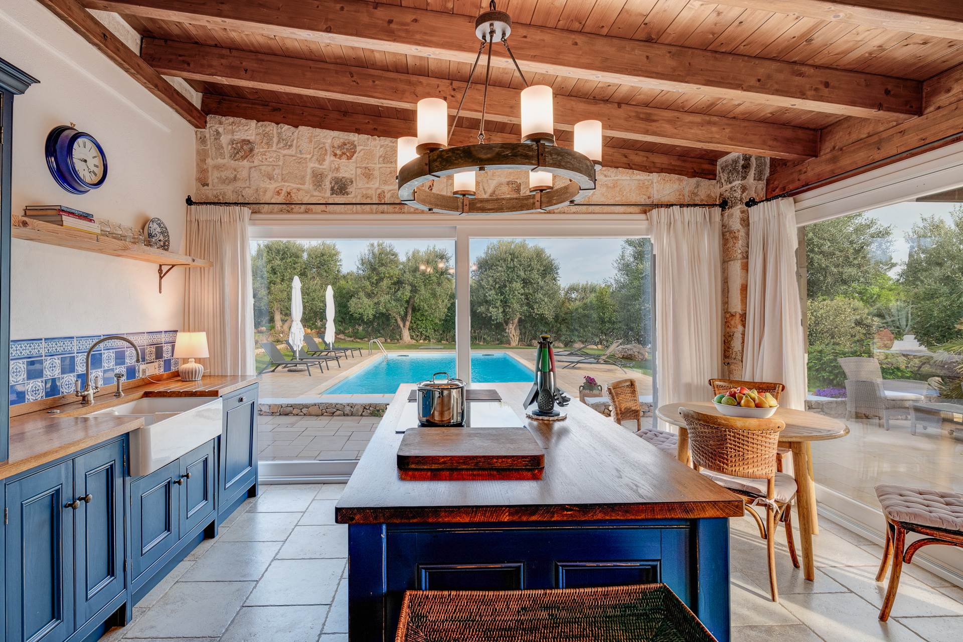 Si accede alla proprietà attraverso la cucina completamente attrezzata, dotata di doppi vetri e porte finestre su due lati che si aprono direttamente sulla zona piscina, sulla veranda esterna e sulla cucina esterna.