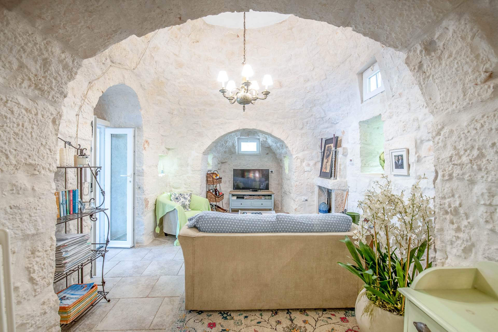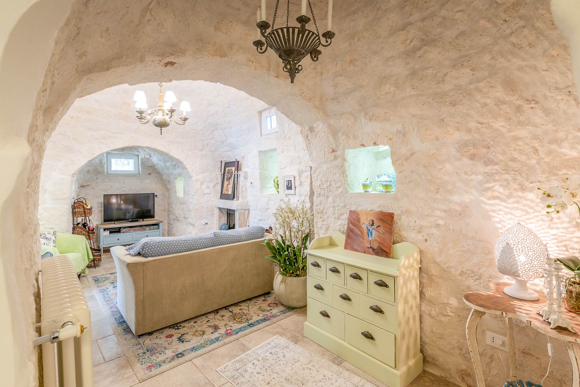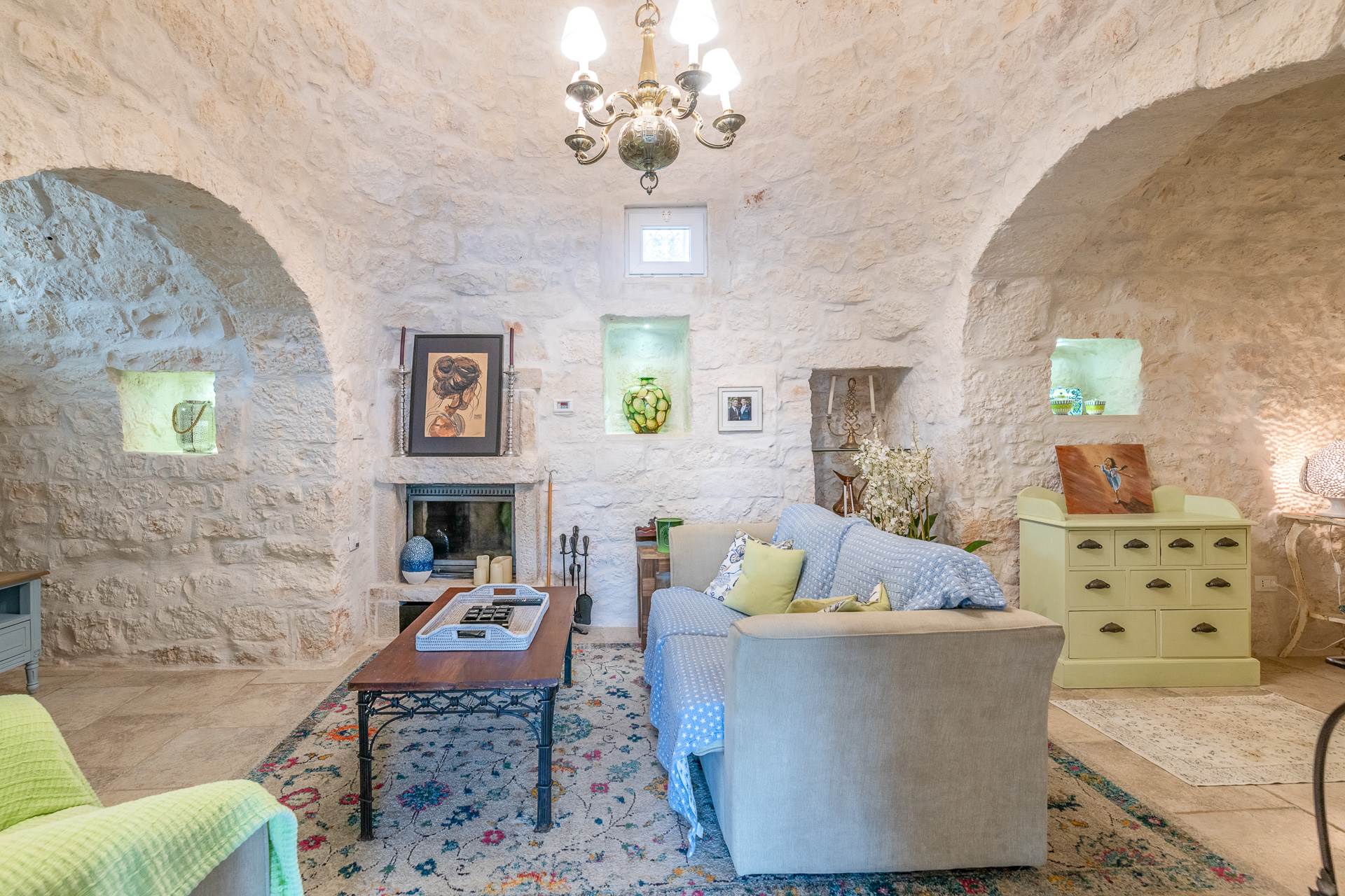 Dalla cucina si accede al trullo, che trasmette una sensazione accogliente grazie all'arco in pietra a vista, all'alcova e al camino con stufa a legna che riscalda anche i radiatori e l'acqua calda.