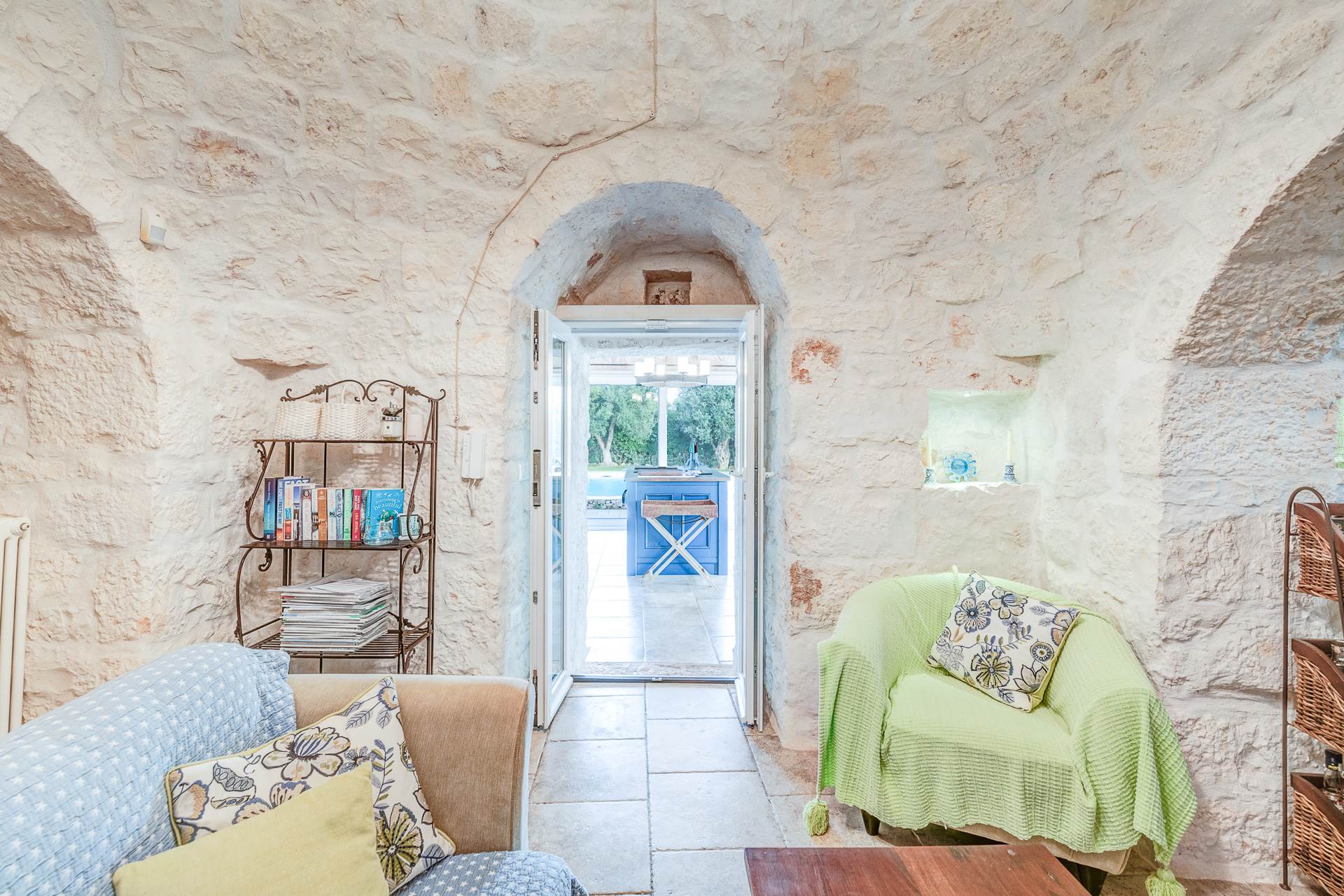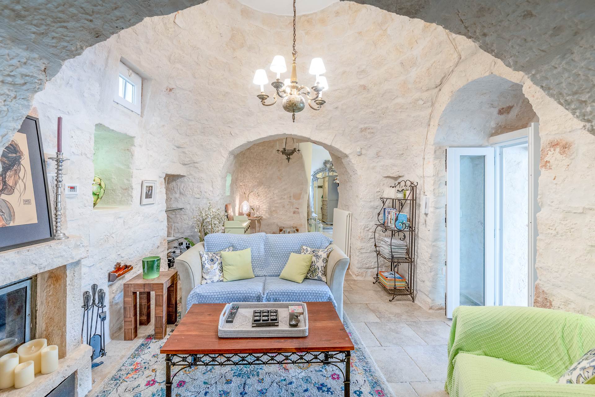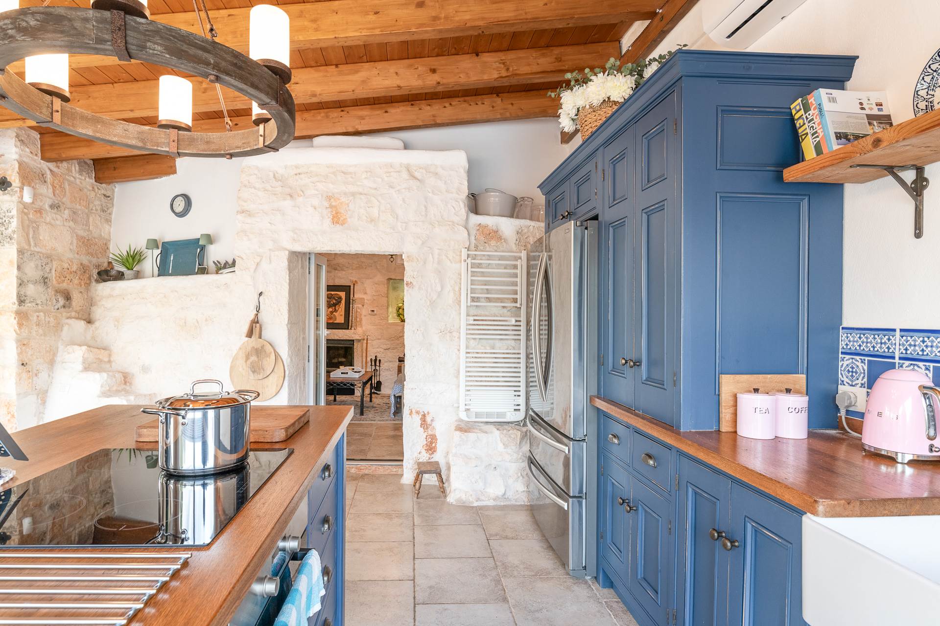 Dalla cucina si accede al trullo, che trasmette una sensazione accogliente grazie all'arco in pietra a vista, all'alcova e al camino con stufa a legna che riscalda anche i radiatori e l'acqua calda.