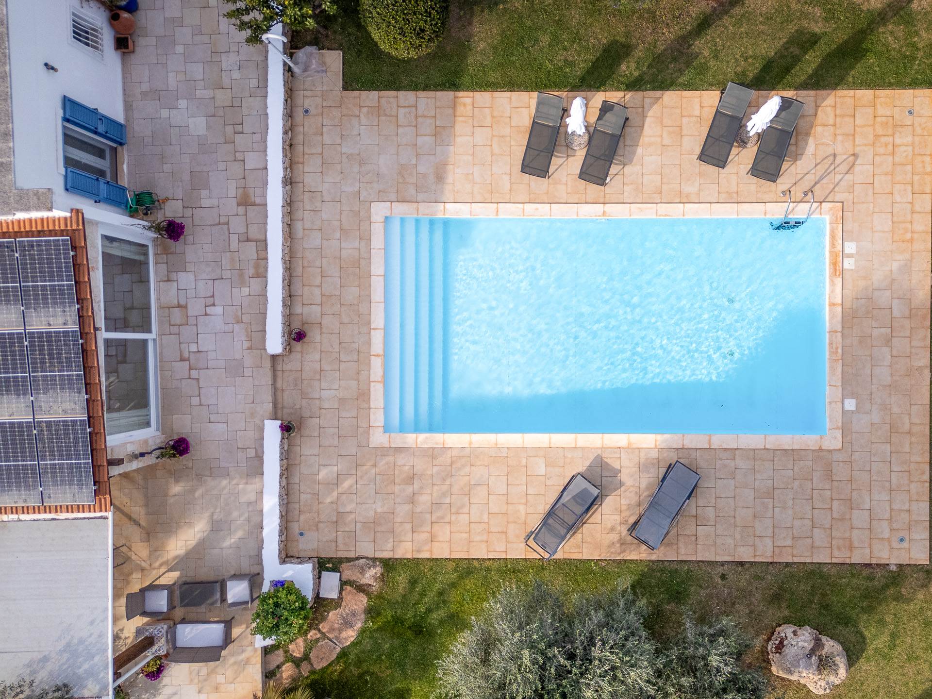 L'ampio spazio esterno intorno alla villa consente di godersi cene all'aperto o semplicemente di rilassarsi vicino alla piscina, che misura circa 10 x 5 metri con una profondità di 1,0 - 1,5 metri, dotata di un sistema automatico di riempimento/rabbocco dell'acqua.
