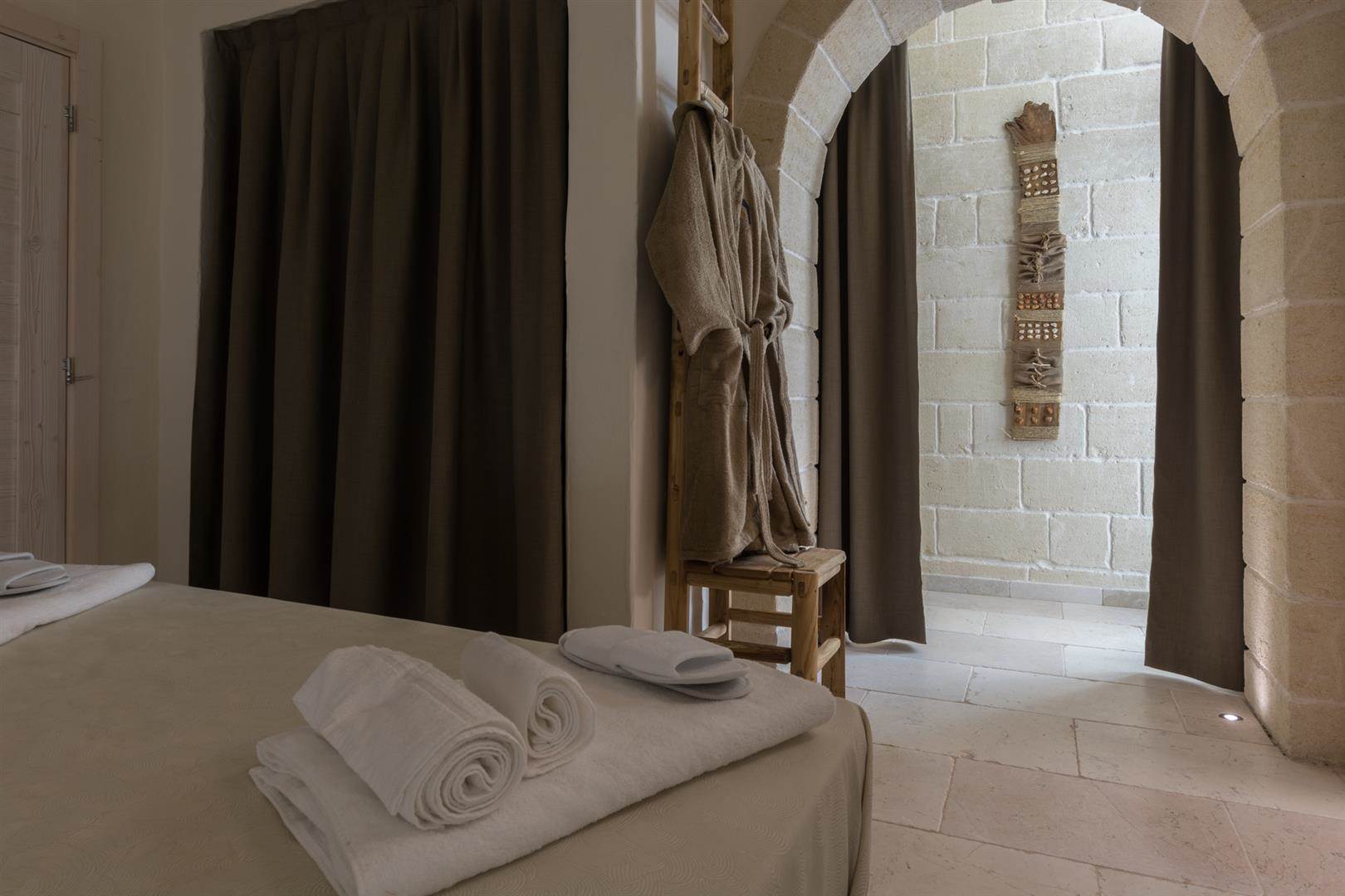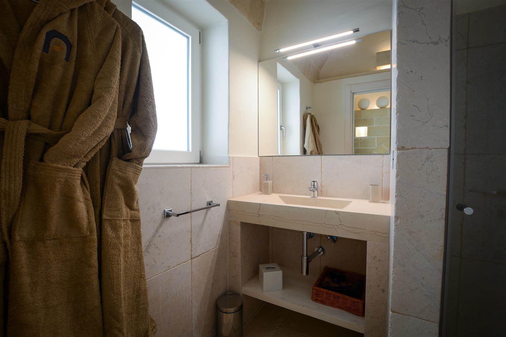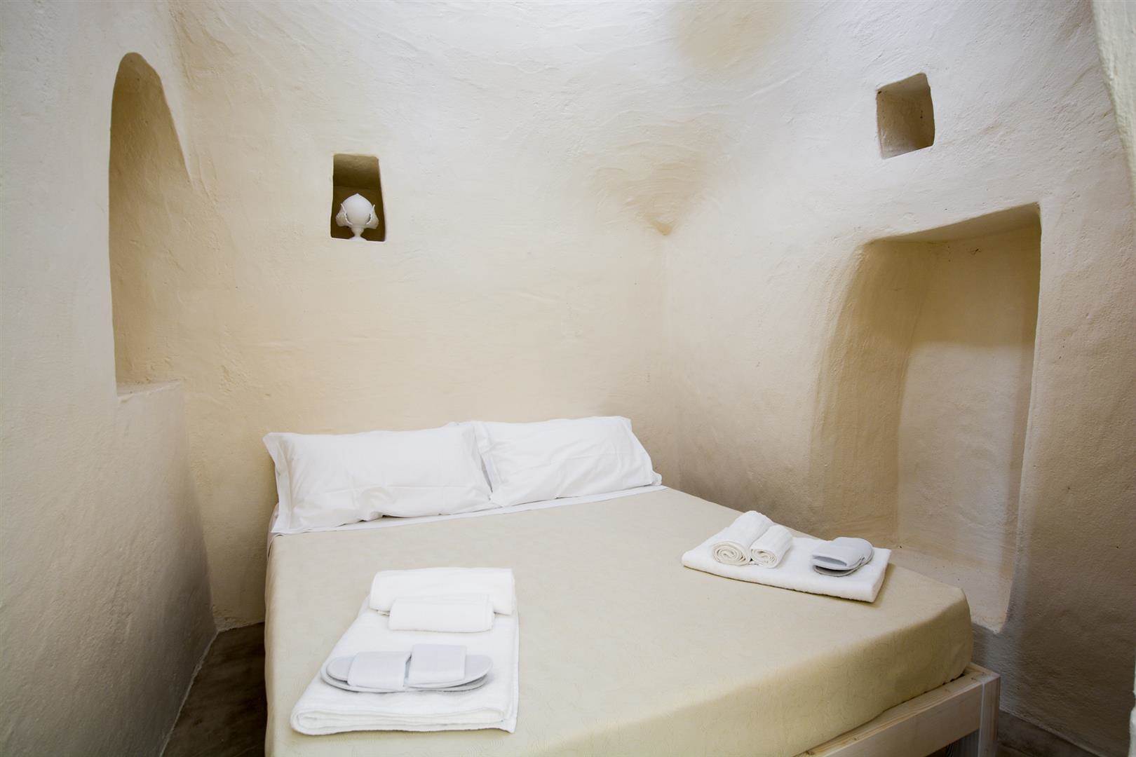 Inoltre è presente una camera da letto con bagno privato. Questa zona è molto fresca grazie alla conformazione stessa del trullo, il quale ha delle mura molto spesse che mantengono le zone fresche in estate.