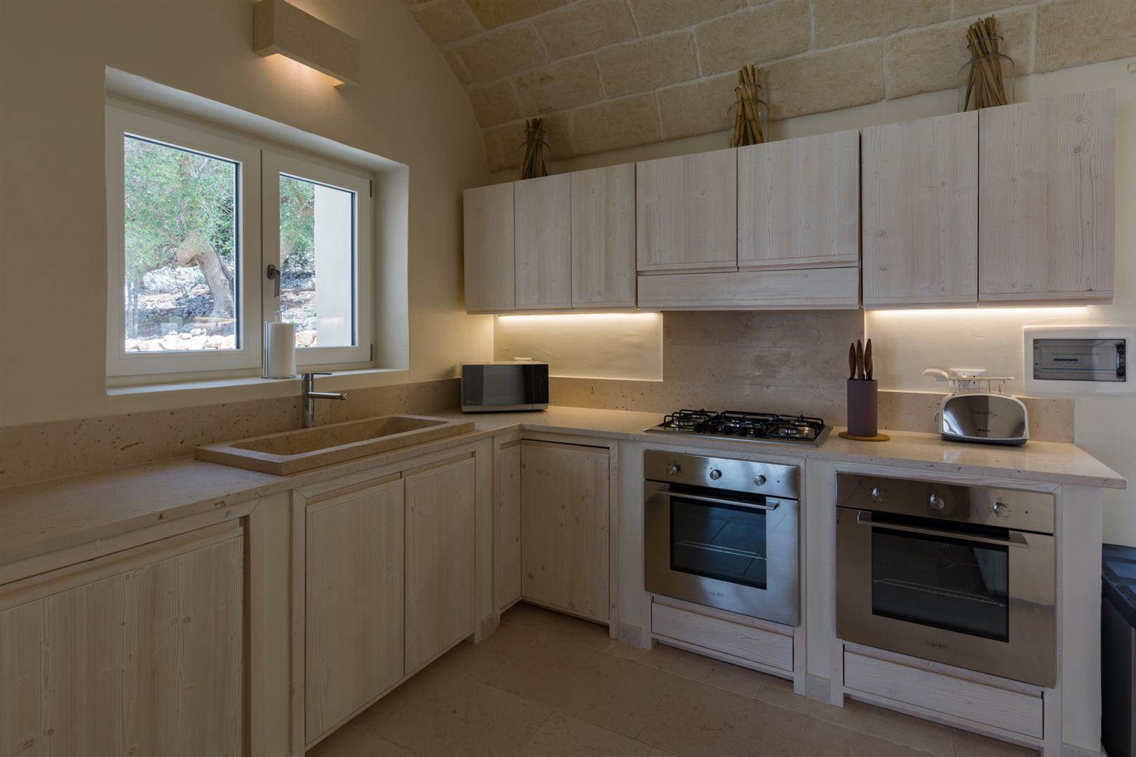 A questo punto una scala porterà al primo piano dove c'è un ampio salone e zona pranzo con cucina a vista. La cucina è totalmente attrezzata e fornita di un grande frigorifero con freezer americano, due forni elettrici e un piano cottura a 5 fuochi. Molto particolare e caratteristico è il grande lavandino in pietra e sopratutto c'è una finestra proprio sul piano cucina che affaccia sulla meravigliosa zona esterna, avendo quindi la vista sugli splendidi ulivi. Il tavolo da pranzo è realizzato a mano come del resto tutti gli arredi della villa. La cucina è realizzata in legno naturale.
