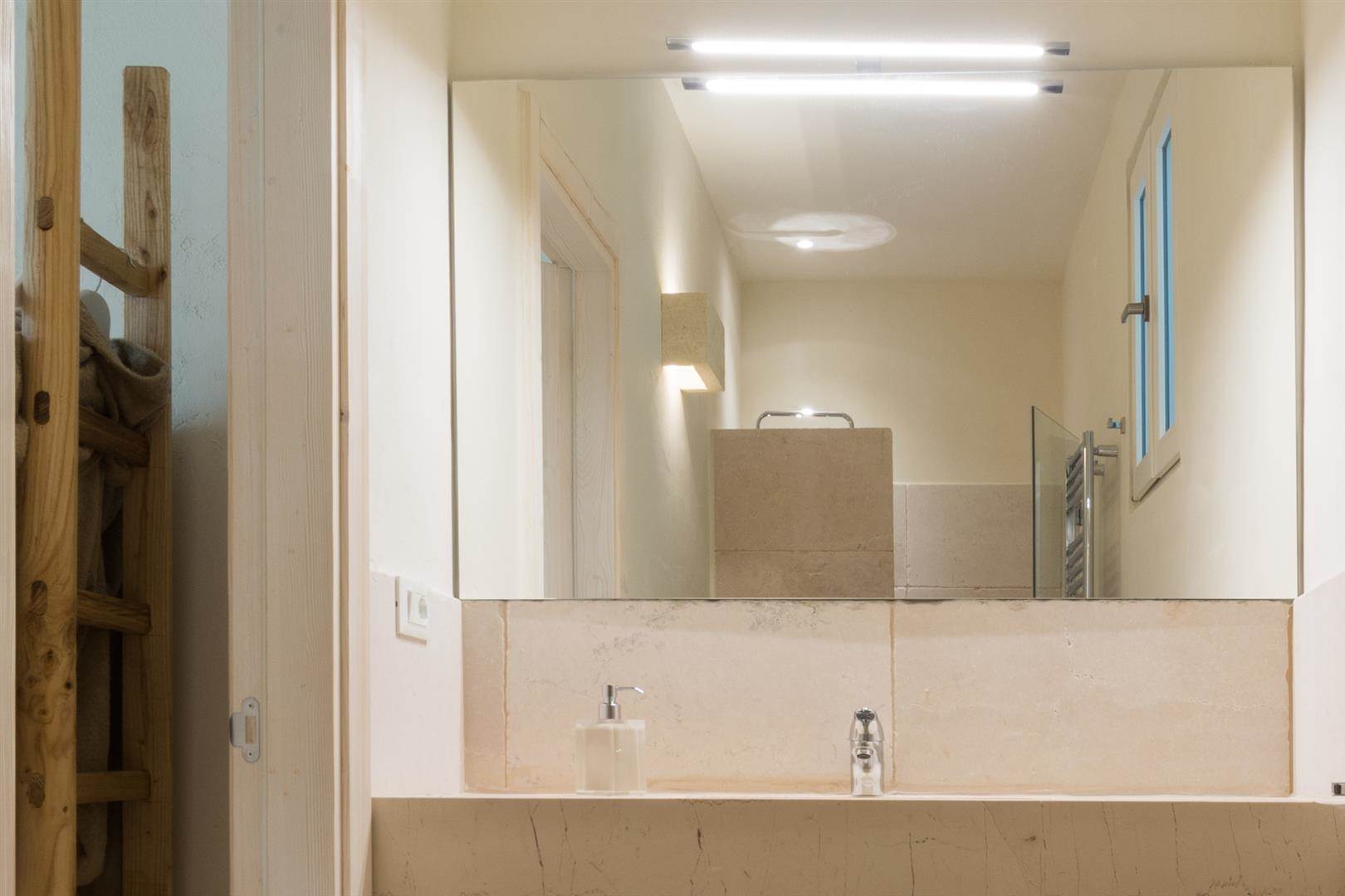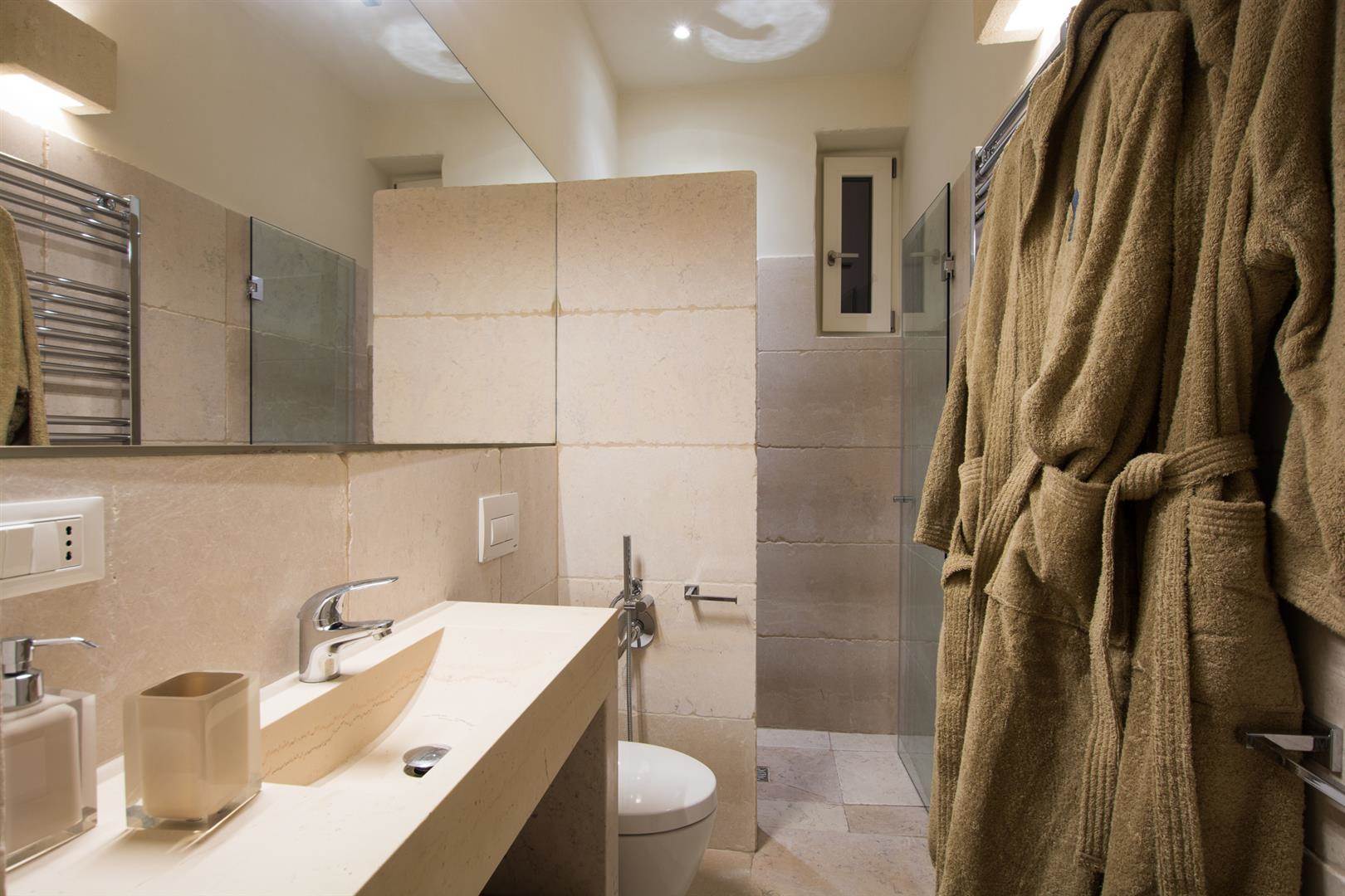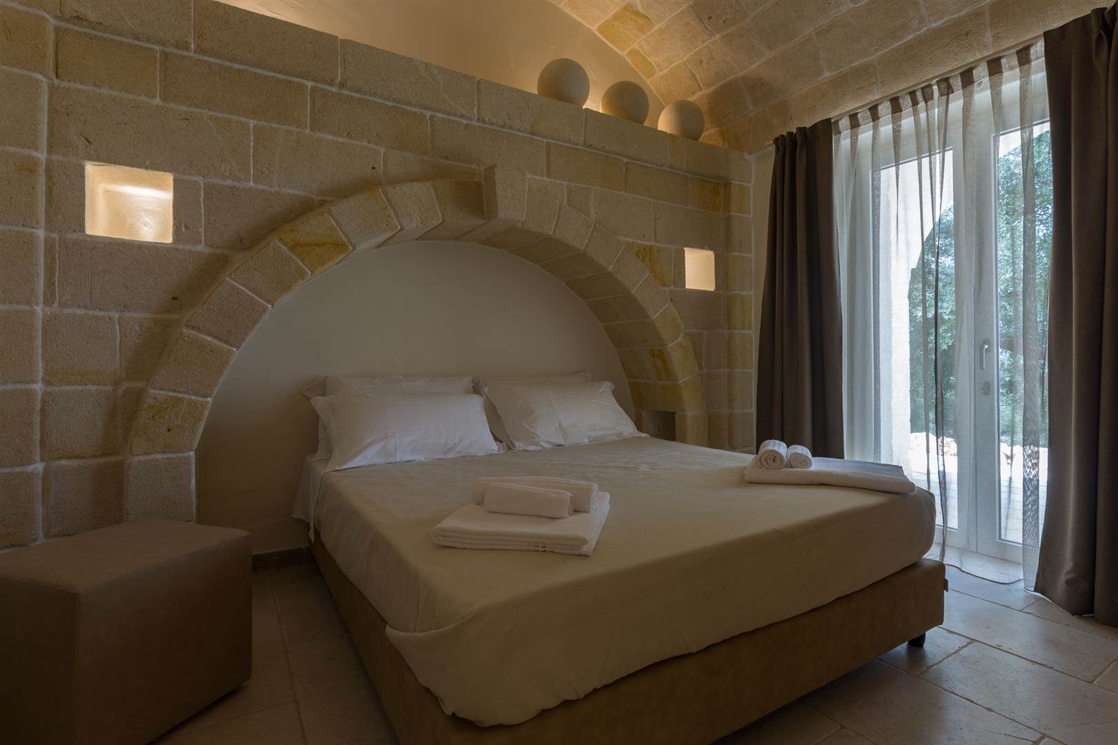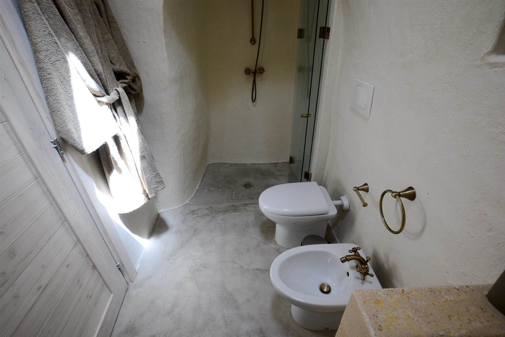 Tutte e tre le camere da letto hanno delle porte finestre che affacciano sullo stesso cortile, da una delle camere da letto è possibile accedere alla quarta camera da letto che è la più grande, ha un ampio bagno con doccia, wc, bidet e lavandino in pietra.