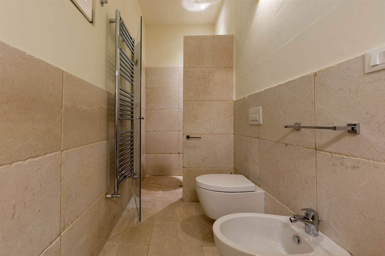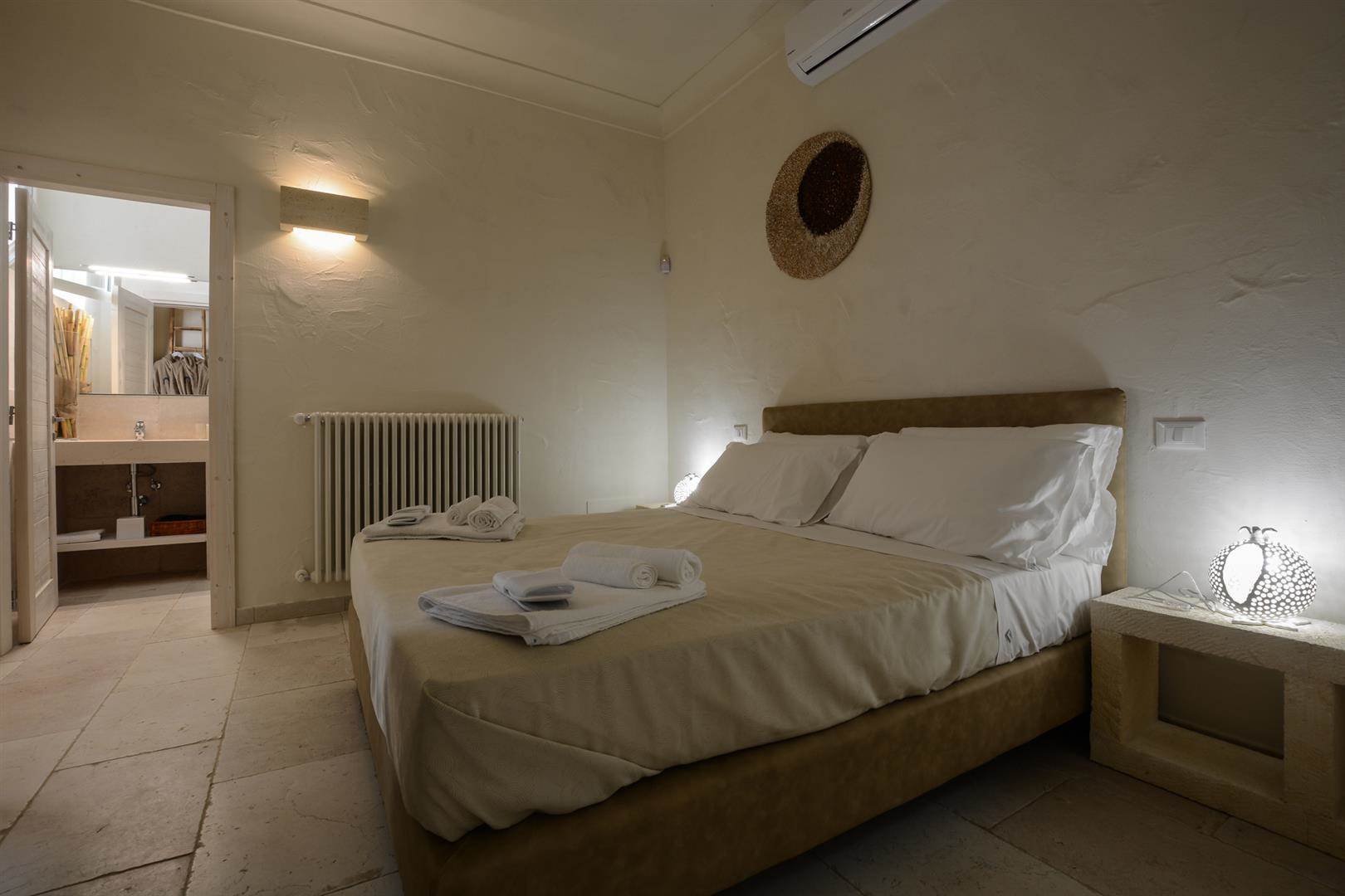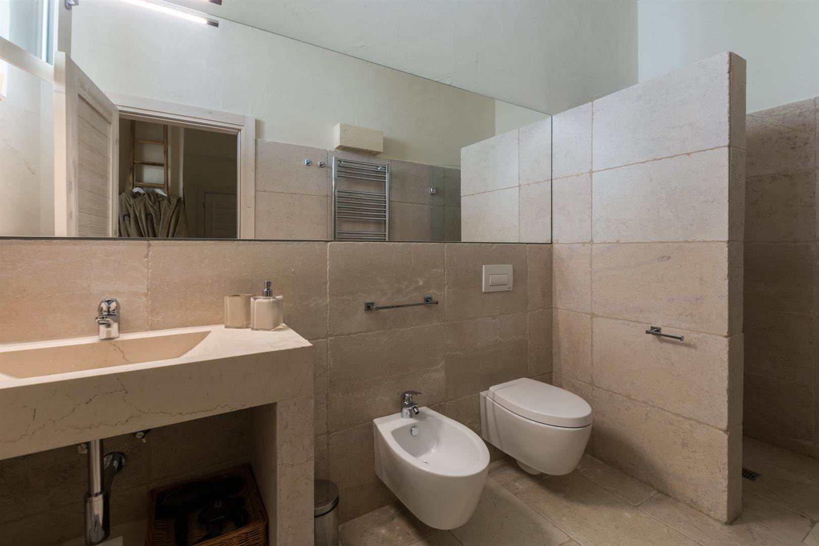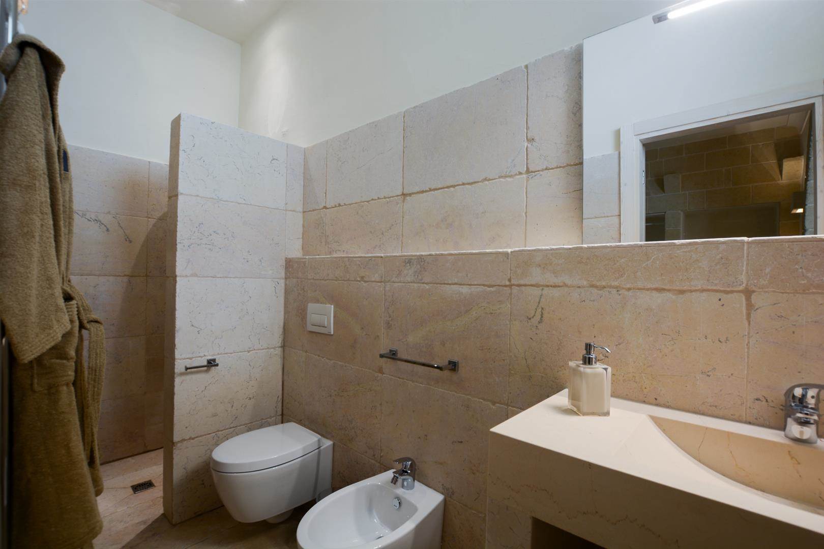 Tutte e tre le camere da letto hanno delle porte finestre che affacciano sullo stesso cortile, da una delle camere da letto è possibile accedere alla quarta camera da letto che è la più grande, ha un ampio bagno con doccia, wc, bidet e lavandino in pietra.