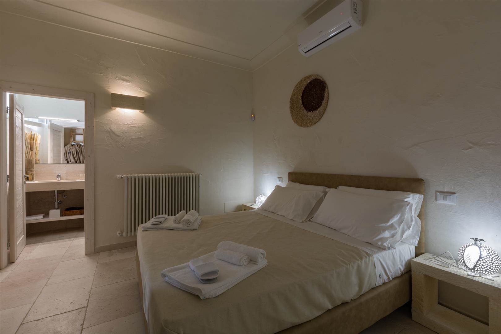 Da questa zona salotto si accede tramite un corridoio alle tre camere, con letto king size, tutte con bagno en suite, doccia, doccia a mano e doccia a testa, lavandini splendidi in pietra, accappatoi e pantofole.