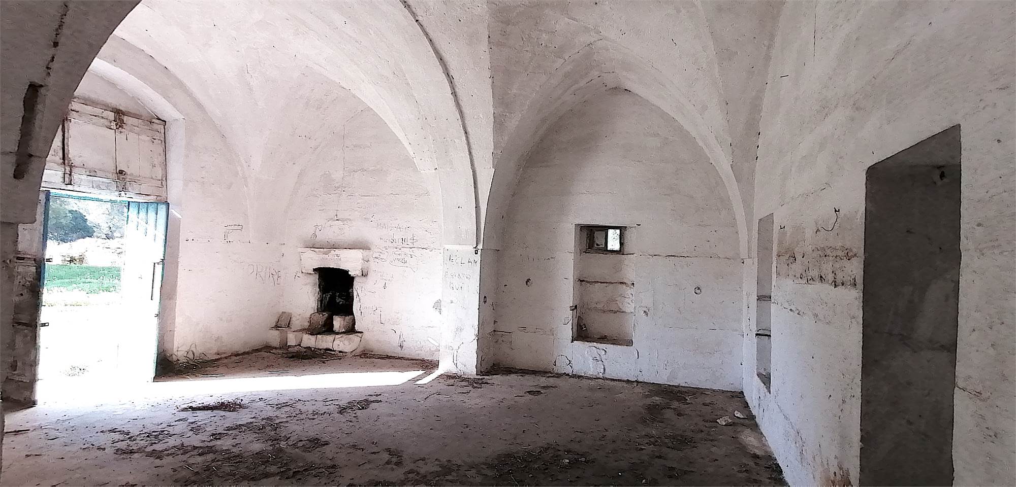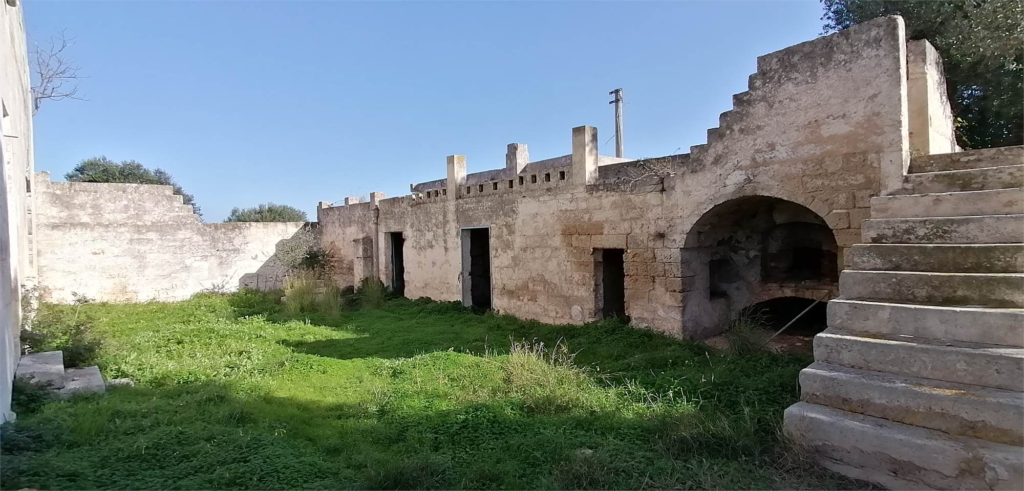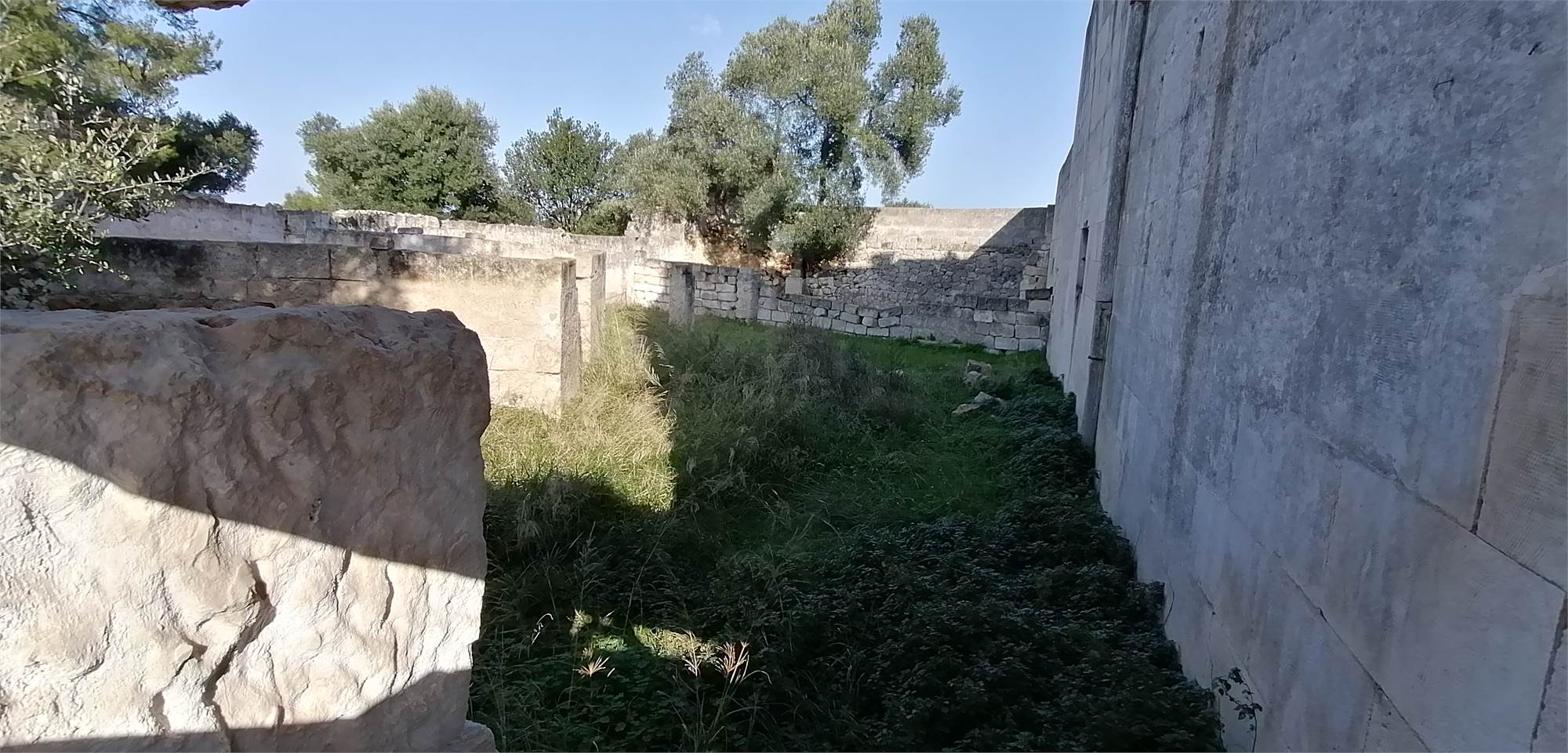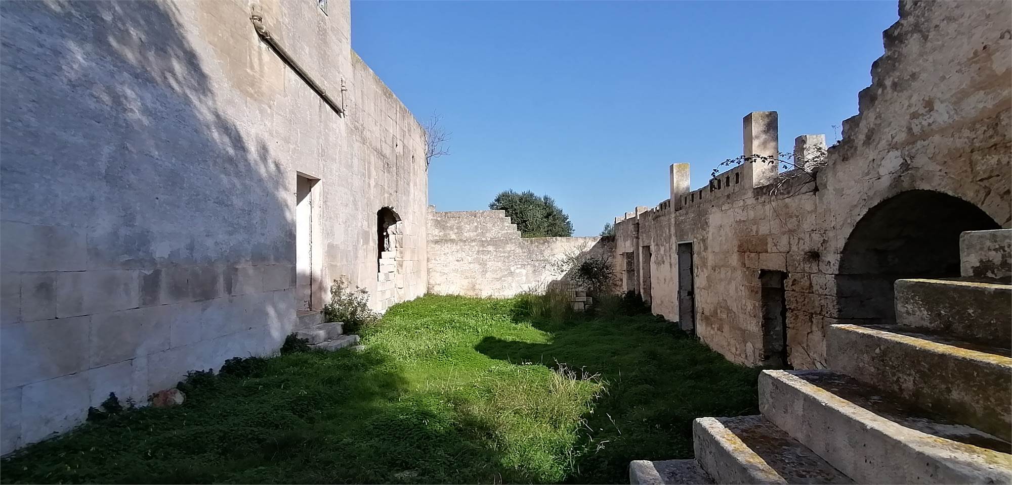 Il cortile posteriore della masseria ospita ambienti voltati che un tempo fungevano da stalle, oltre a un suggestivo agrumeto circondato da alte mura.