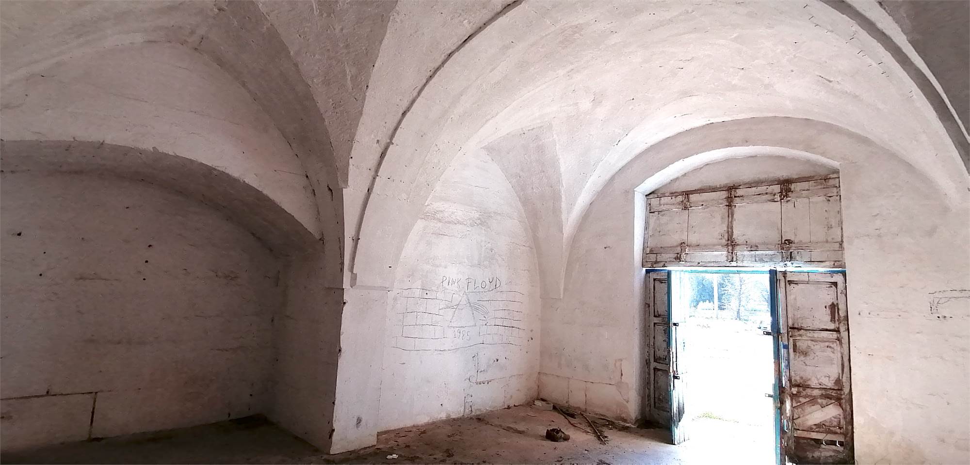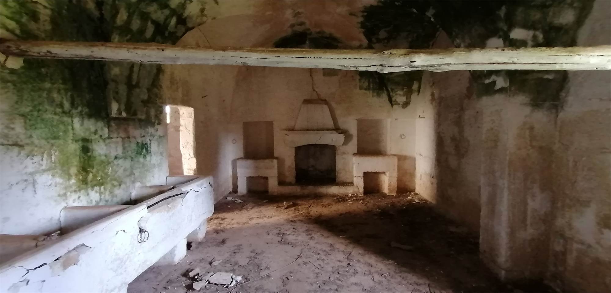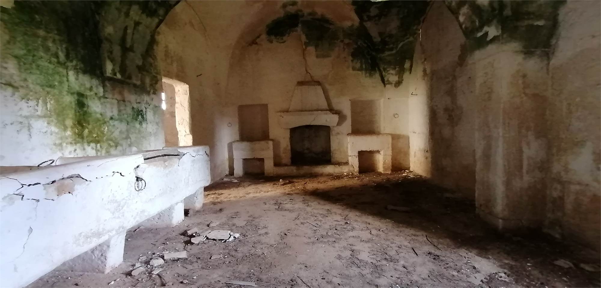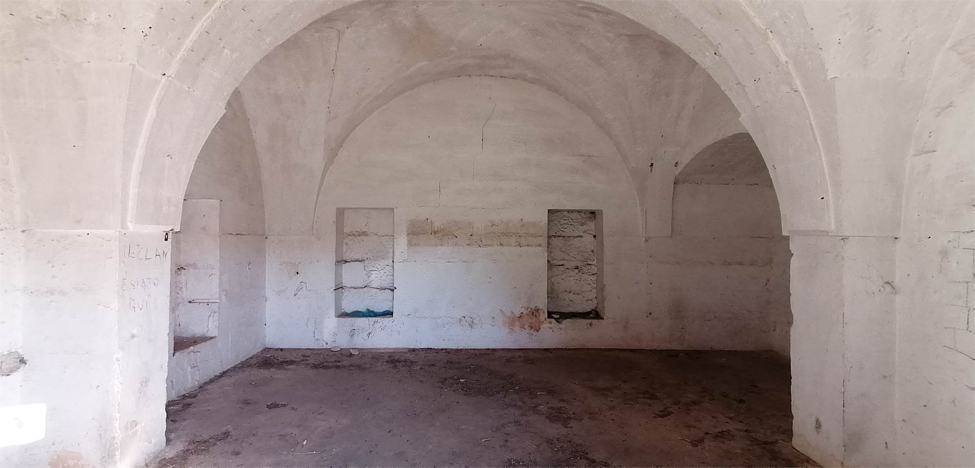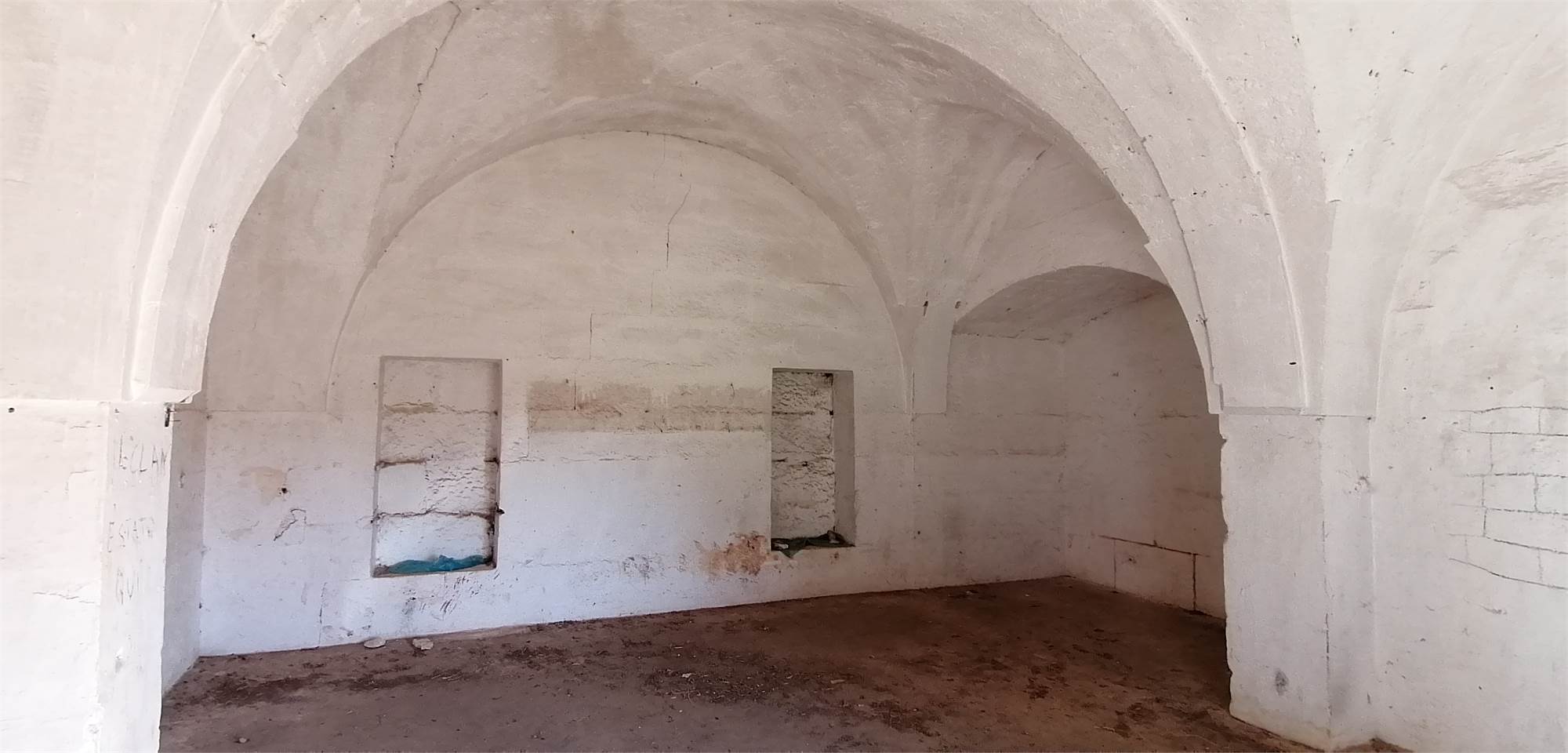 Il cortile posteriore della masseria ospita ambienti voltati che un tempo fungevano da stalle, oltre a un suggestivo agrumeto circondato da alte mura.