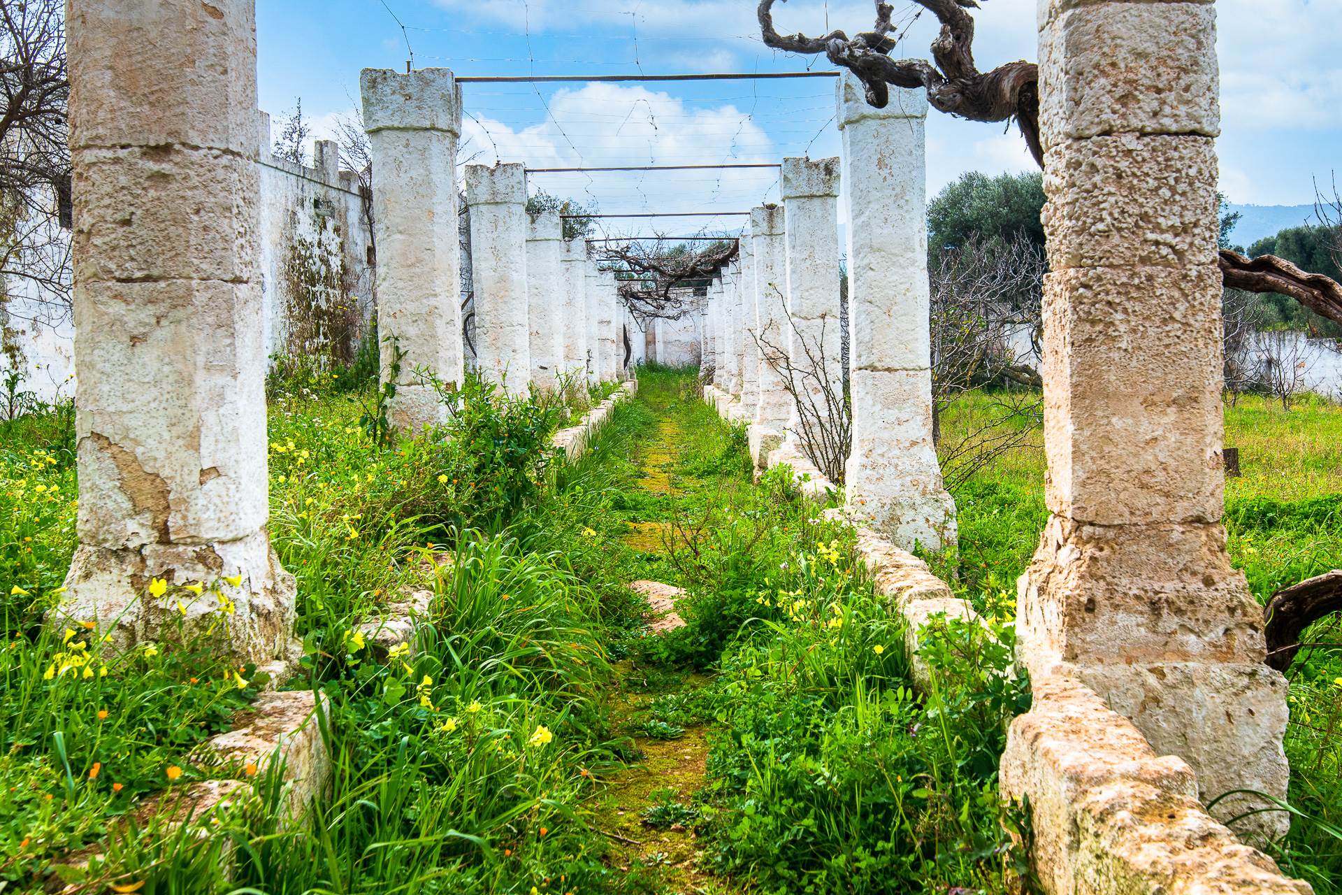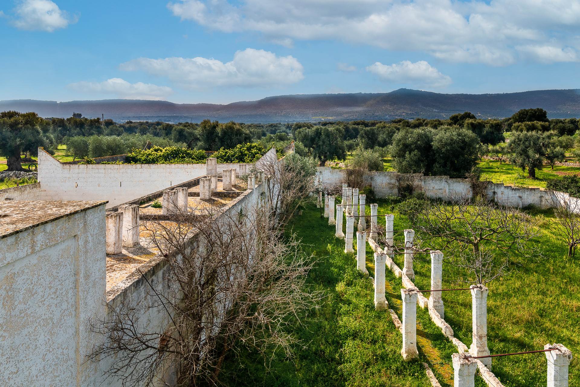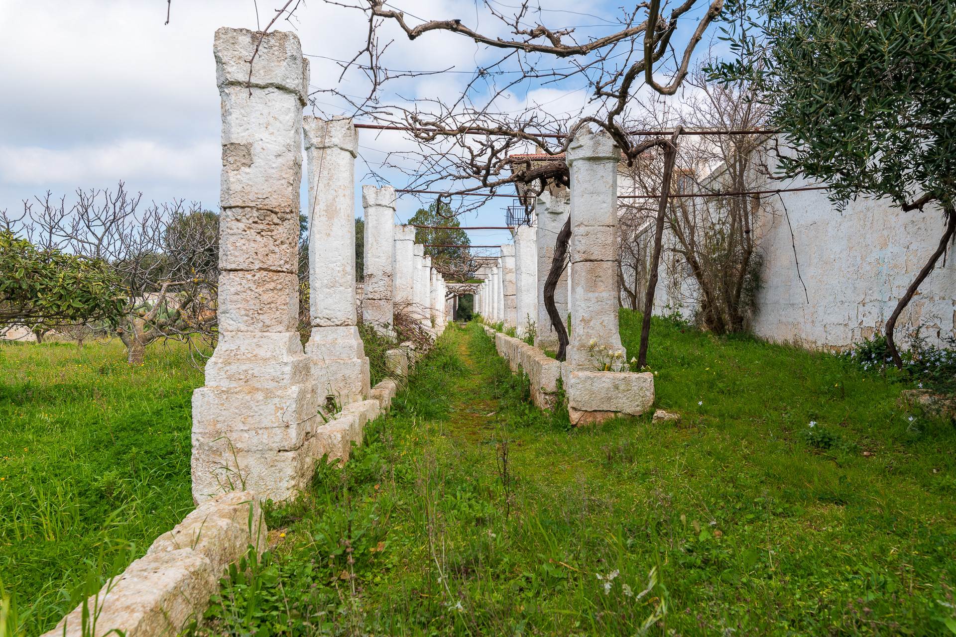 Nel cortile posteriore della Masseria si trovano degli ambienti voltati, un tempo adibiti a stalle e un bellissimo agrumeto, racchiuso da alte mura che conserva l'impianto originale di irrigazione realizzato in pietra. All'agrumeto si arriva percorrendo la lunga pergola con colonne di pietra che caratterizza e da il nome alla Masseria.