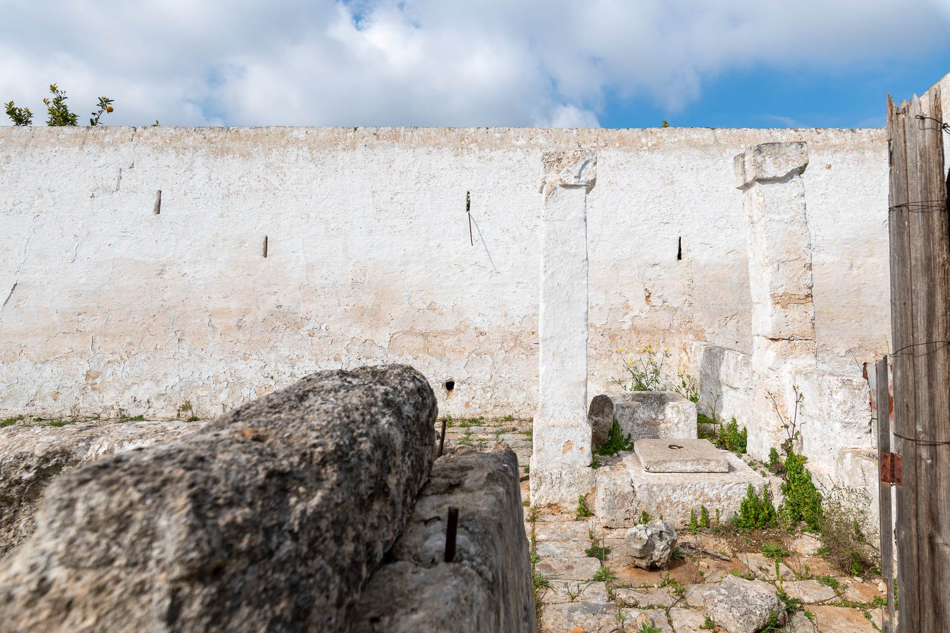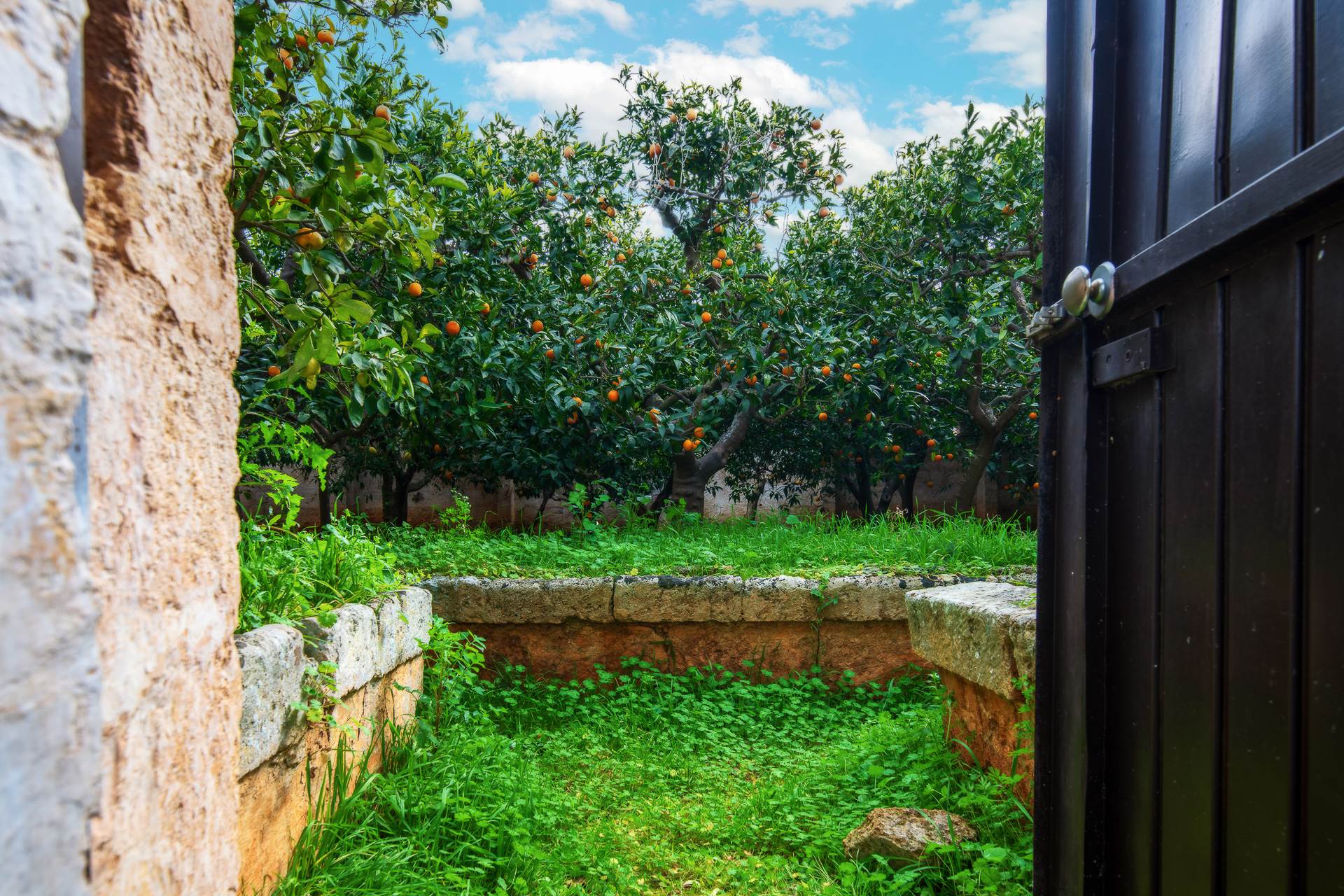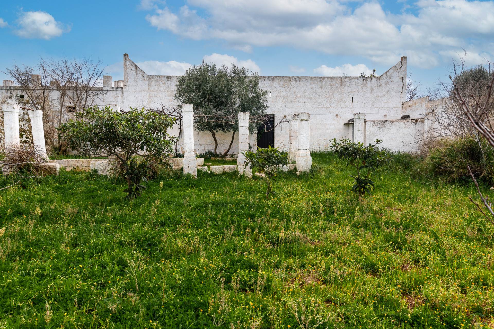 Nel cortile posteriore della Masseria si trovano degli ambienti voltati, un tempo adibiti a stalle e un bellissimo agrumeto, racchiuso da alte mura che conserva l'impianto originale di irrigazione realizzato in pietra. All'agrumeto si arriva percorrendo la lunga pergola con colonne di pietra che caratterizza e da il nome alla Masseria.