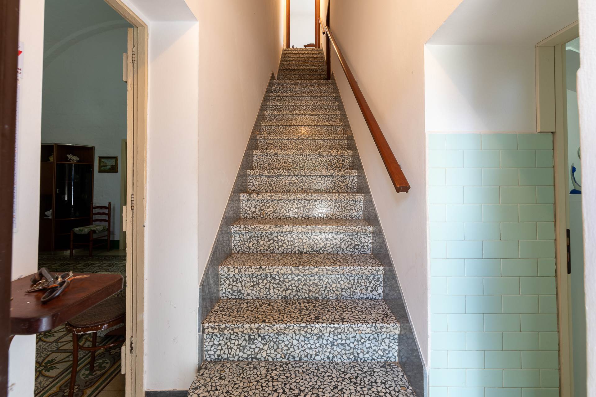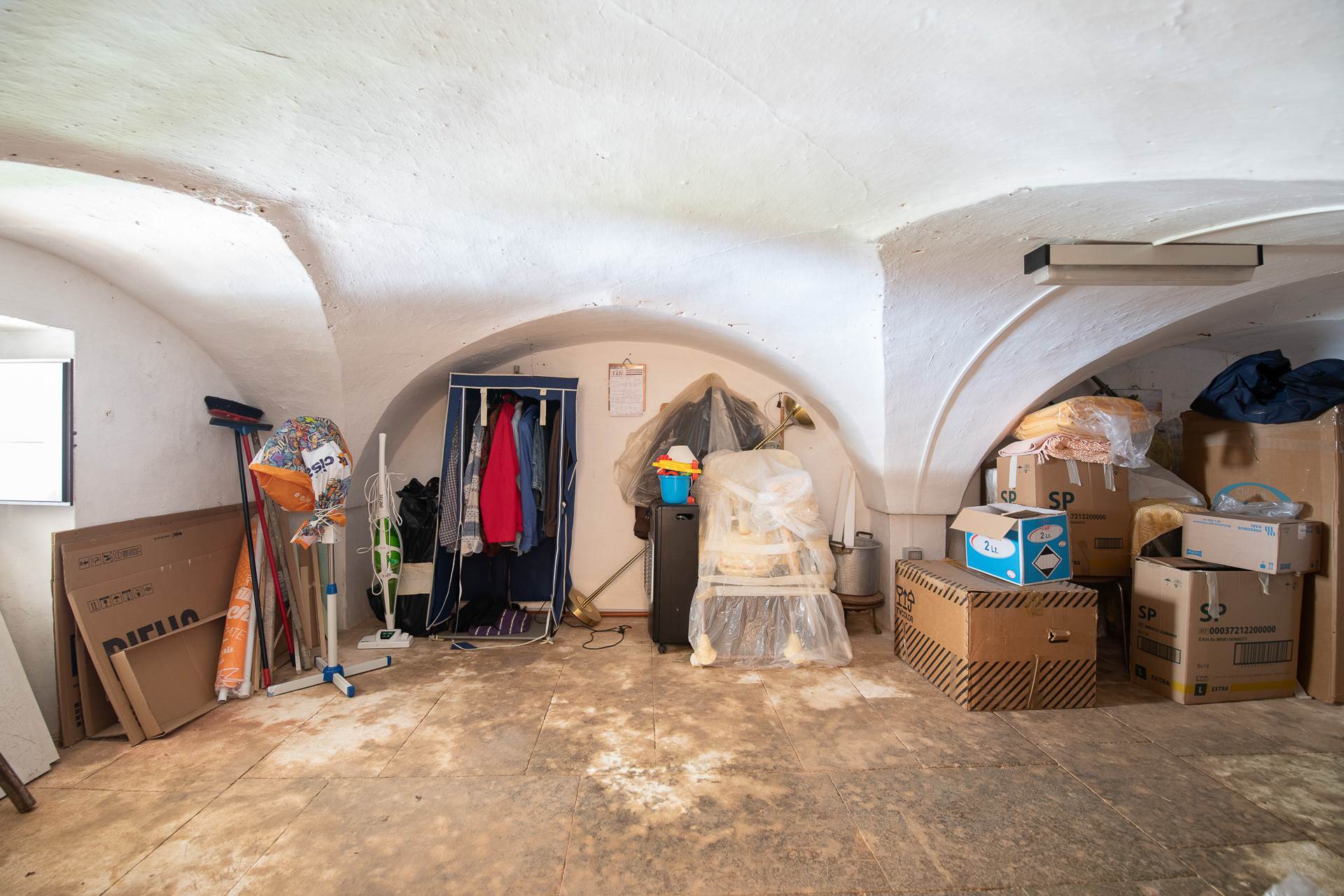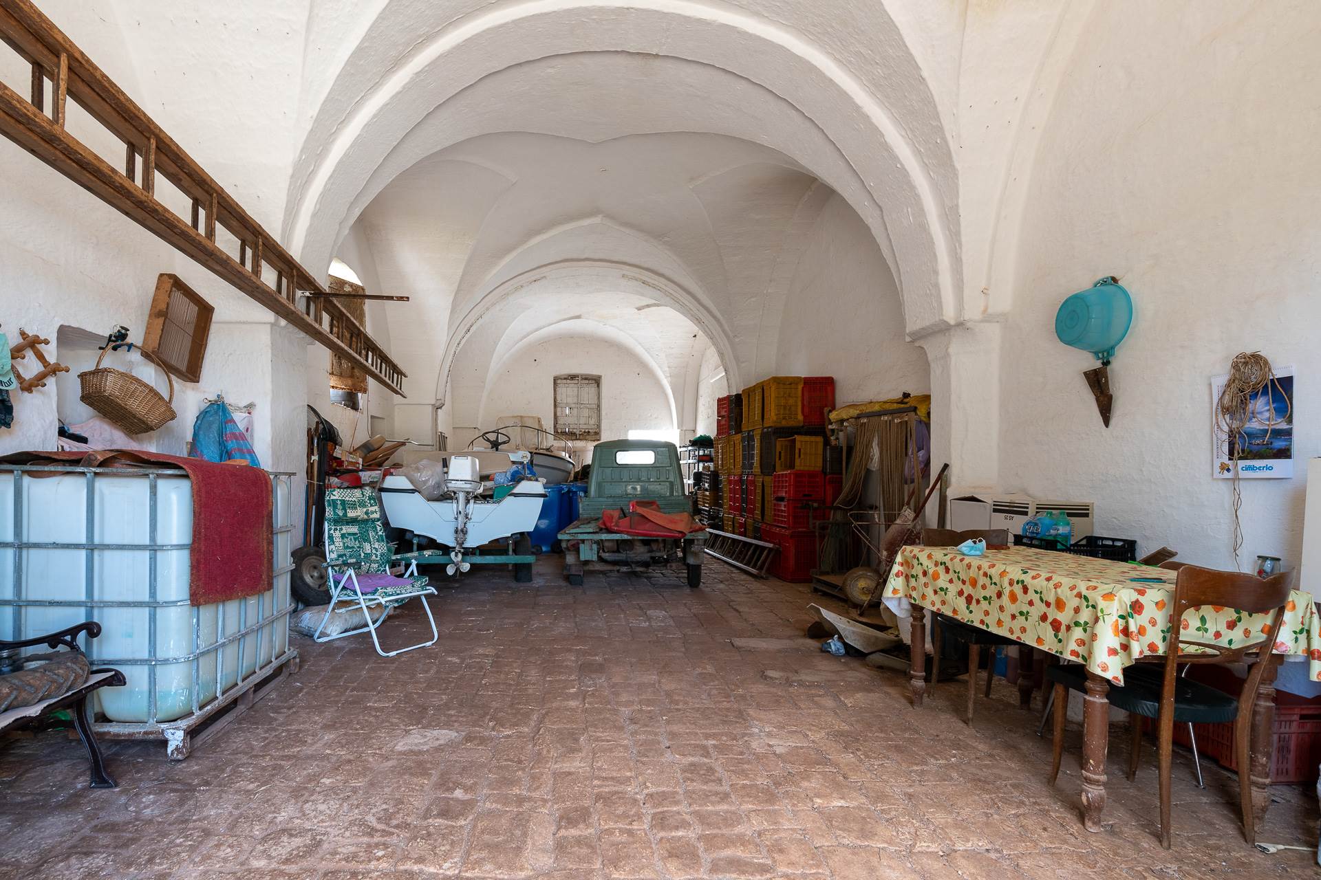 Al piano terra si trova un grande deposito con volte a stella e pavimento in pietra, con uscita sulla corte posteriore. Sempre al piano terra, con accesso indipendente e separati dalla rampa di accesso al primo piano, si trovano due appartamenti. Il primo ha un soggiorno cucina, un bagno e due grandi camere da letto. Il secondo appartamento si articola in una cucina, una camera da letto e un bagno. A lato del secondo appartamento c'è un garage. Tutti gli ambienti del piano terra hanno volte in pietra e molti conservano i pavimenti originali con le caratteristiche cementine.
