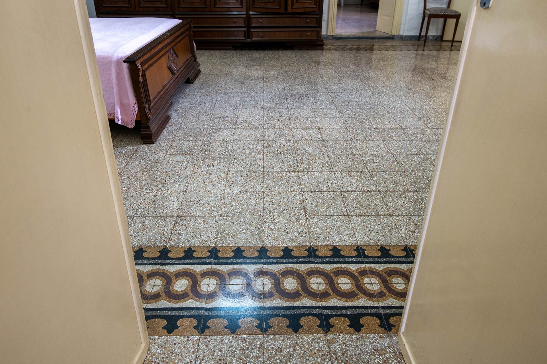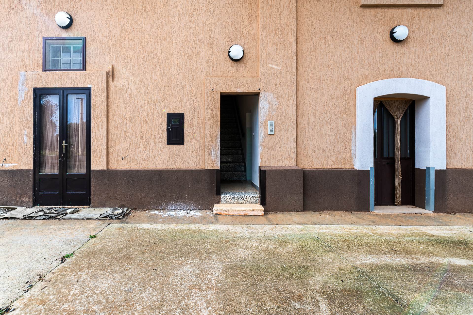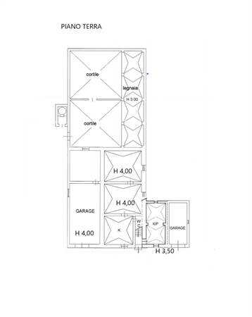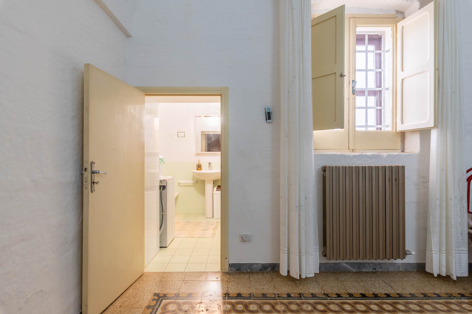 Al piano terra si trova un grande deposito con volte a stella e pavimento in pietra, con uscita sulla corte posteriore. Sempre al piano terra, con accesso indipendente e separati dalla rampa di accesso al primo piano, si trovano due appartamenti. Il primo ha un soggiorno cucina, un bagno e due grandi camere da letto. Il secondo appartamento si articola in una cucina, una camera da letto e un bagno. A lato del secondo appartamento c'è un garage. Tutti gli ambienti del piano terra hanno volte in pietra e molti conservano i pavimenti originali con le caratteristiche cementine.
