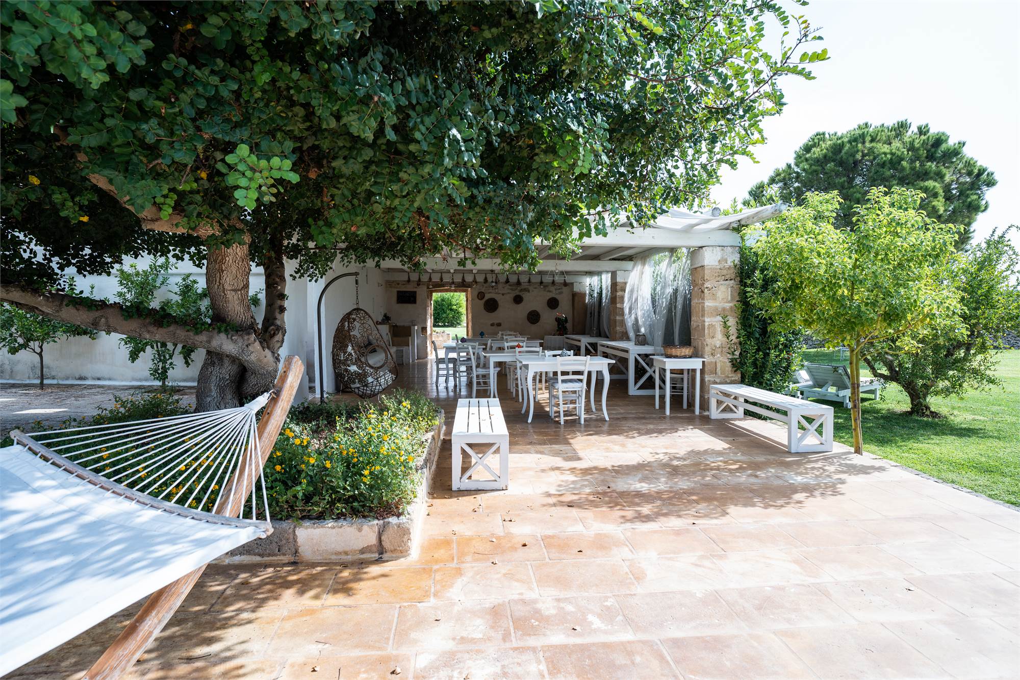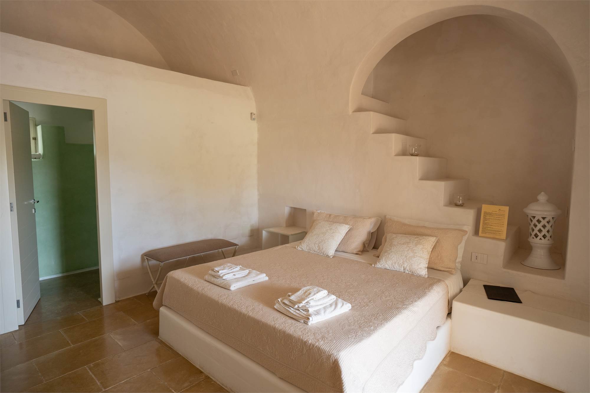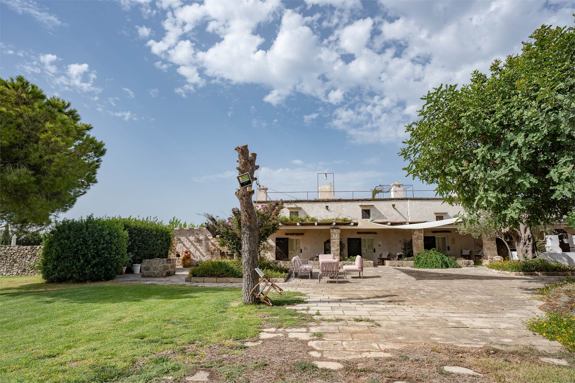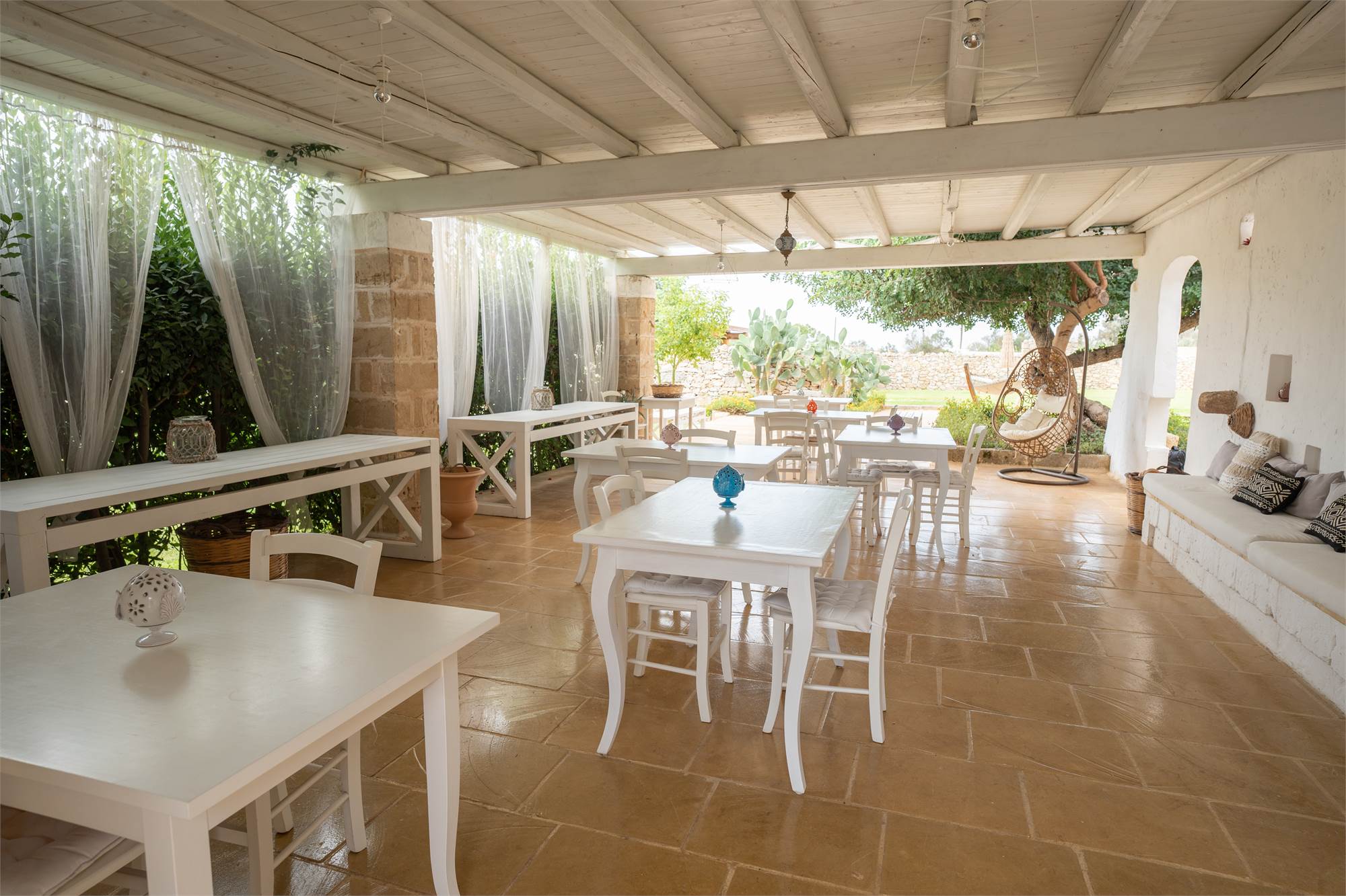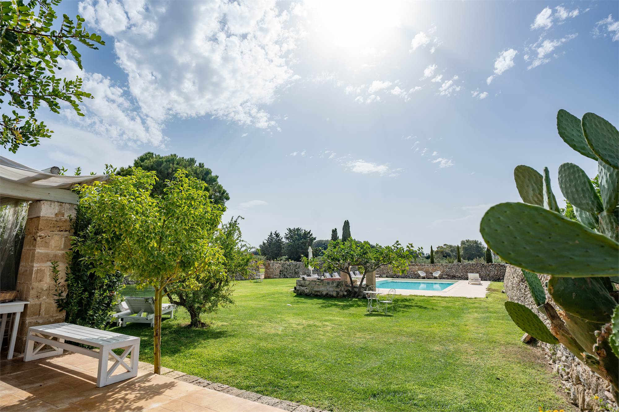 Situata in una zona tranquilla e pittoresca del Salento, la masseria garantisce privacy e serenità, diventando veramente "la quiete dell'anima". Gli ampi spazi esterni, arricchiti da angoli dedicati al relax, sottolineano la magia di questa proprietà dai tratti storici. Le nicchie, i complementi d'arredo in pietra leccese e le tipiche volte a stella e botte in carparo contribuiscono a creare un'atmosfera unica.
