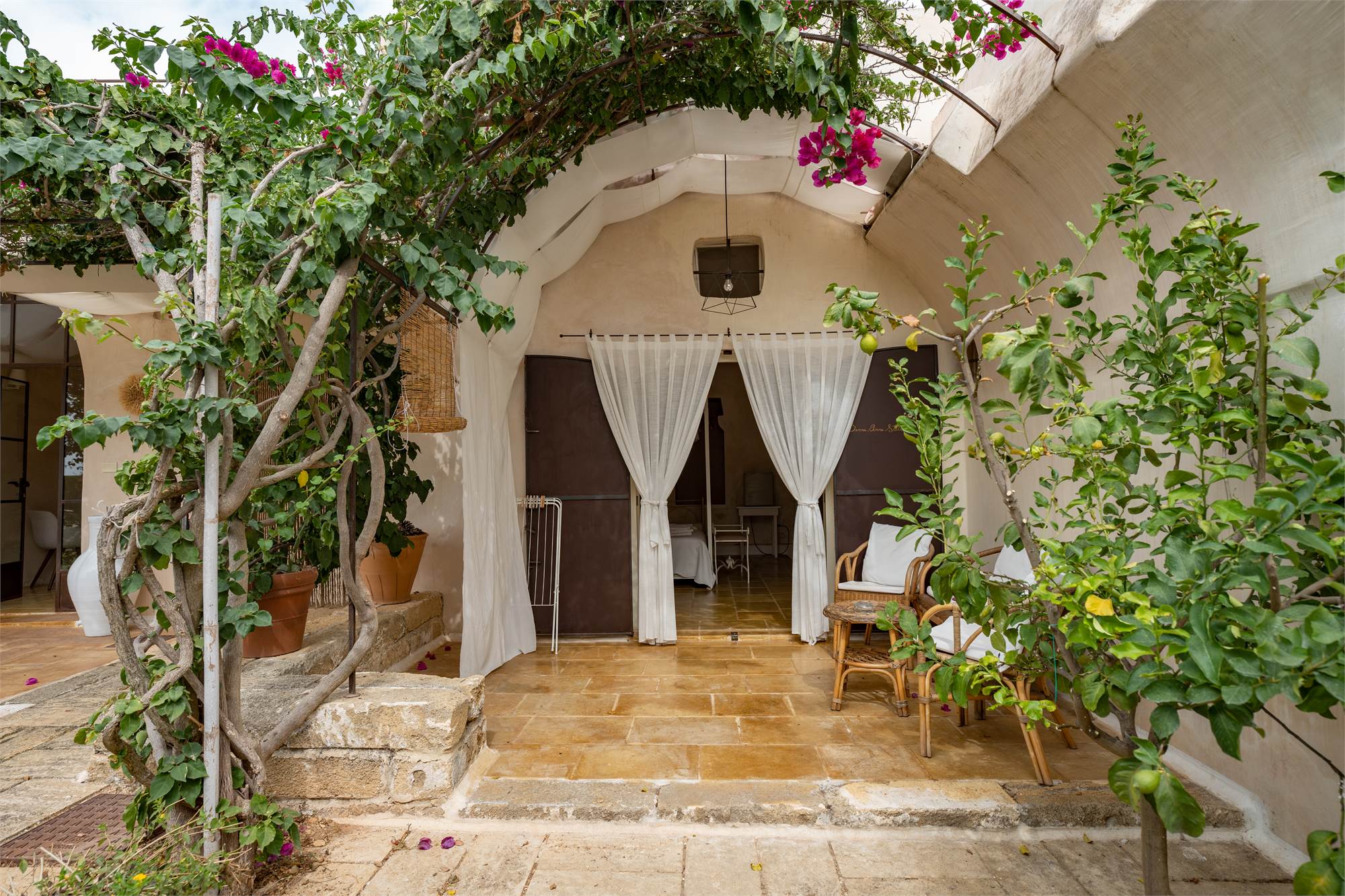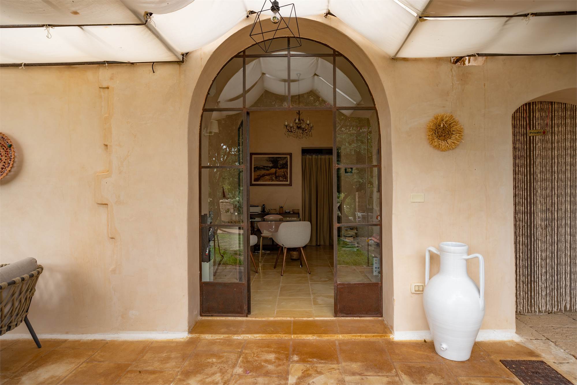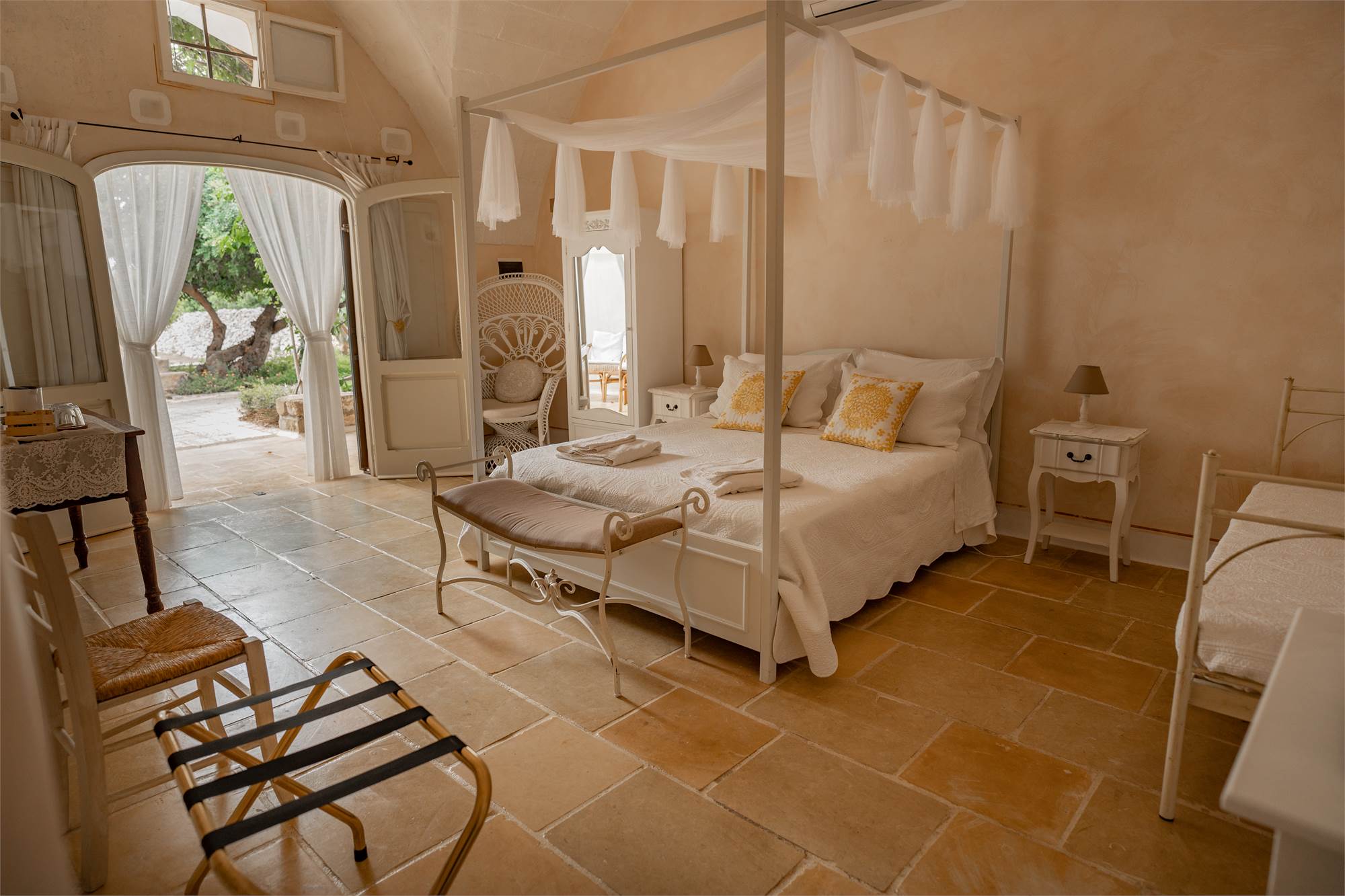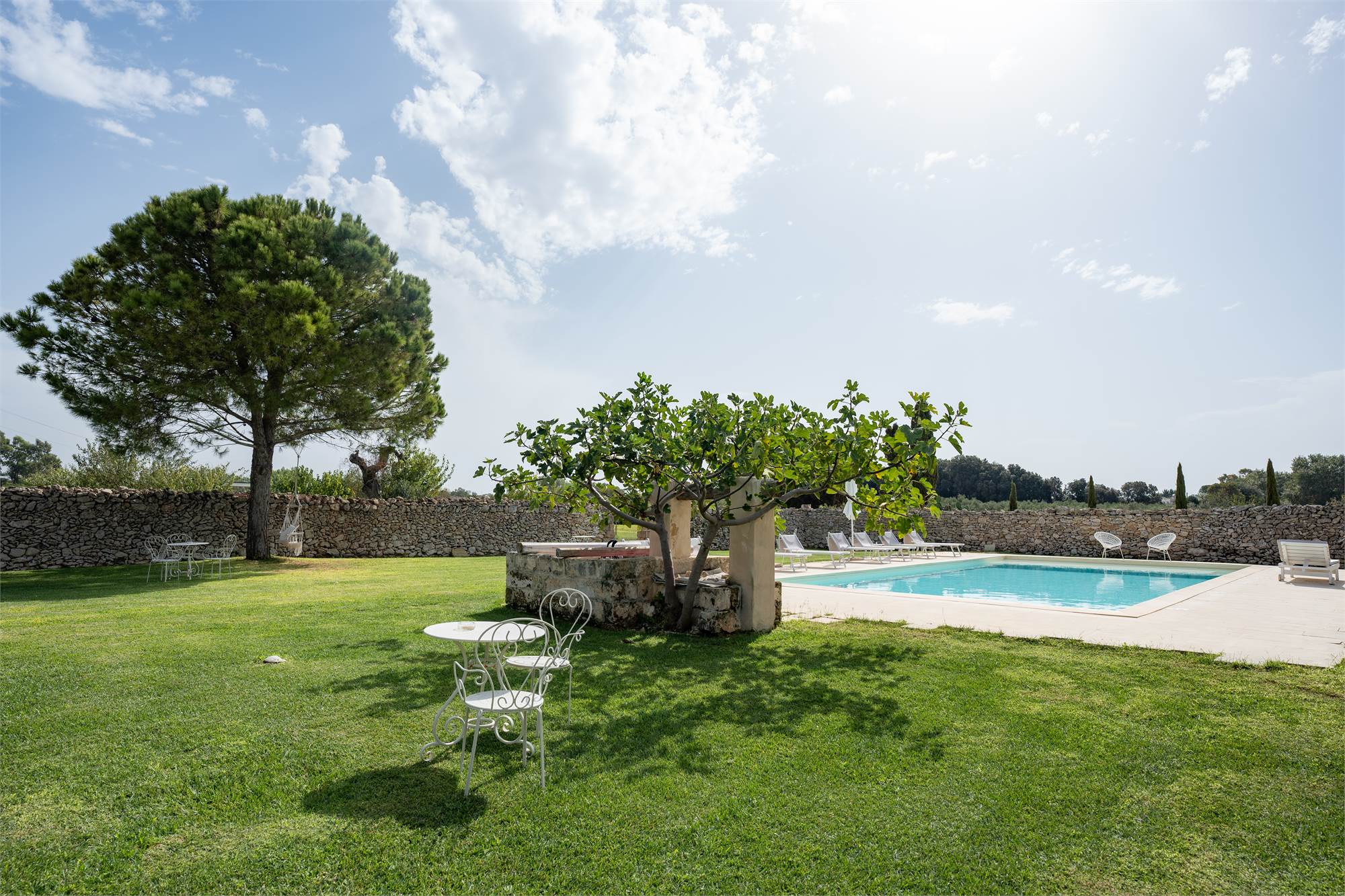 Situata in una zona tranquilla e pittoresca del Salento, la masseria garantisce privacy e serenità, diventando veramente "la quiete dell'anima". Gli ampi spazi esterni, arricchiti da angoli dedicati al relax, sottolineano la magia di questa proprietà dai tratti storici. Le nicchie, i complementi d'arredo in pietra leccese e le tipiche volte a stella e botte in carparo contribuiscono a creare un'atmosfera unica.