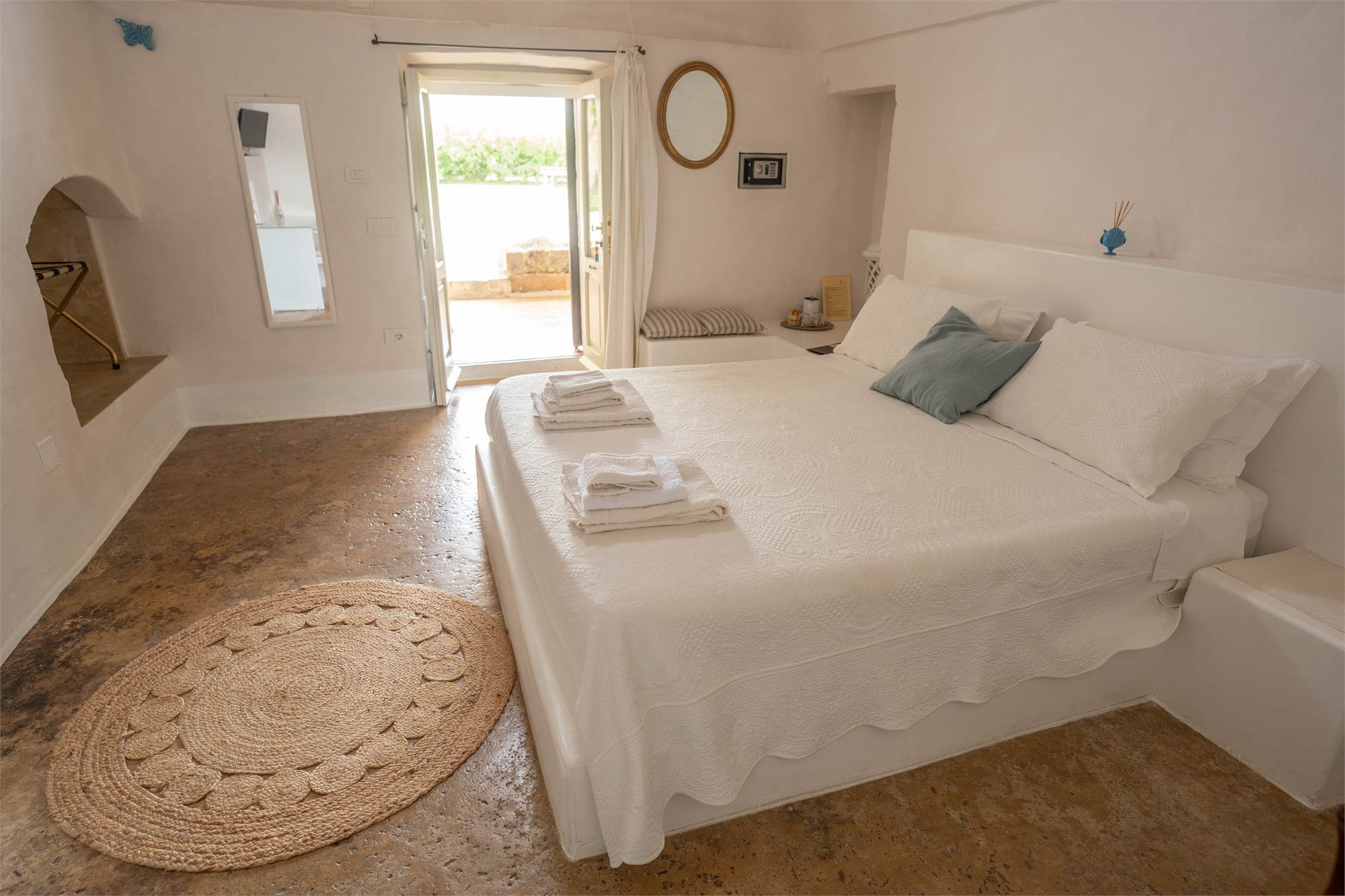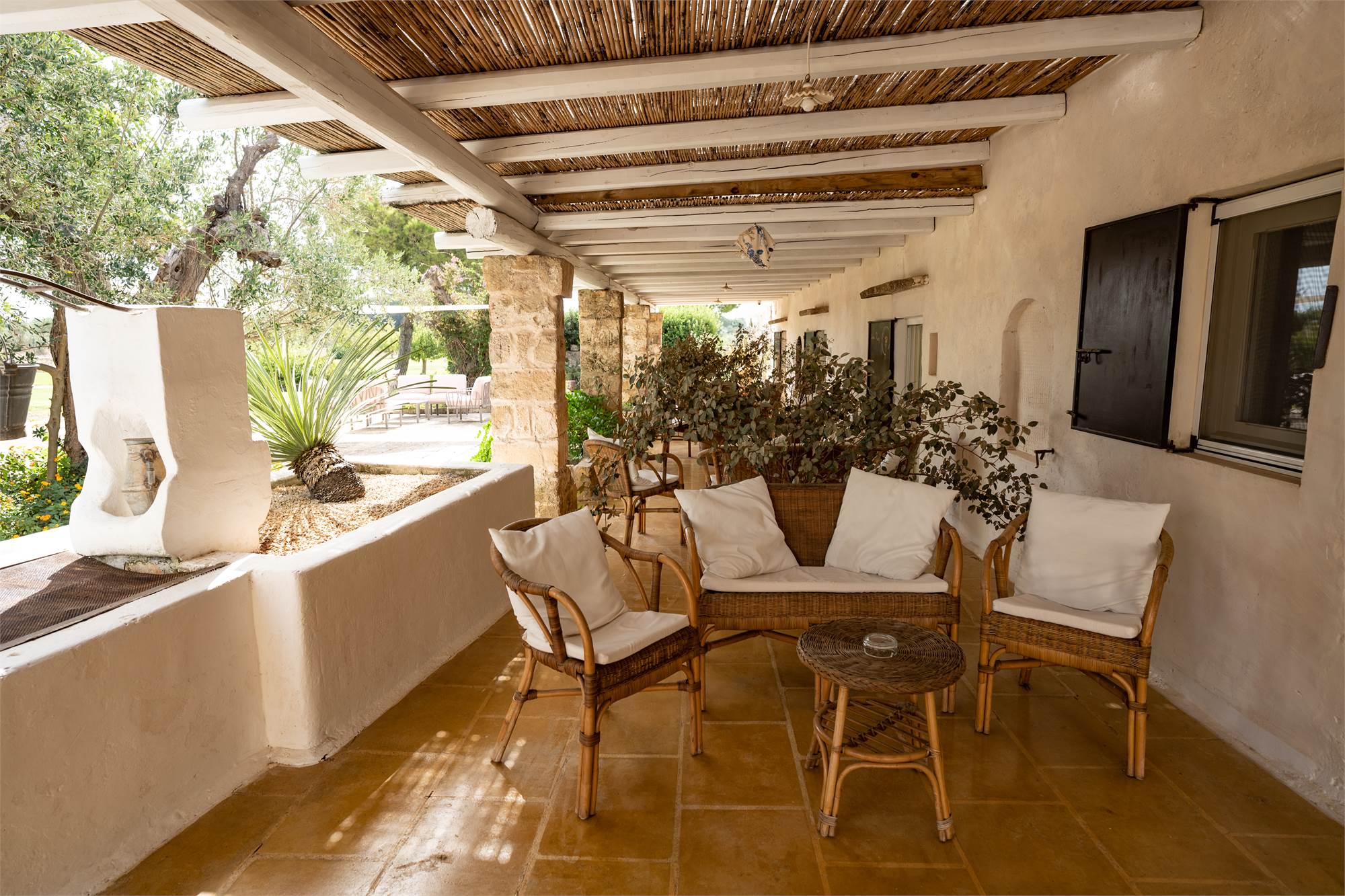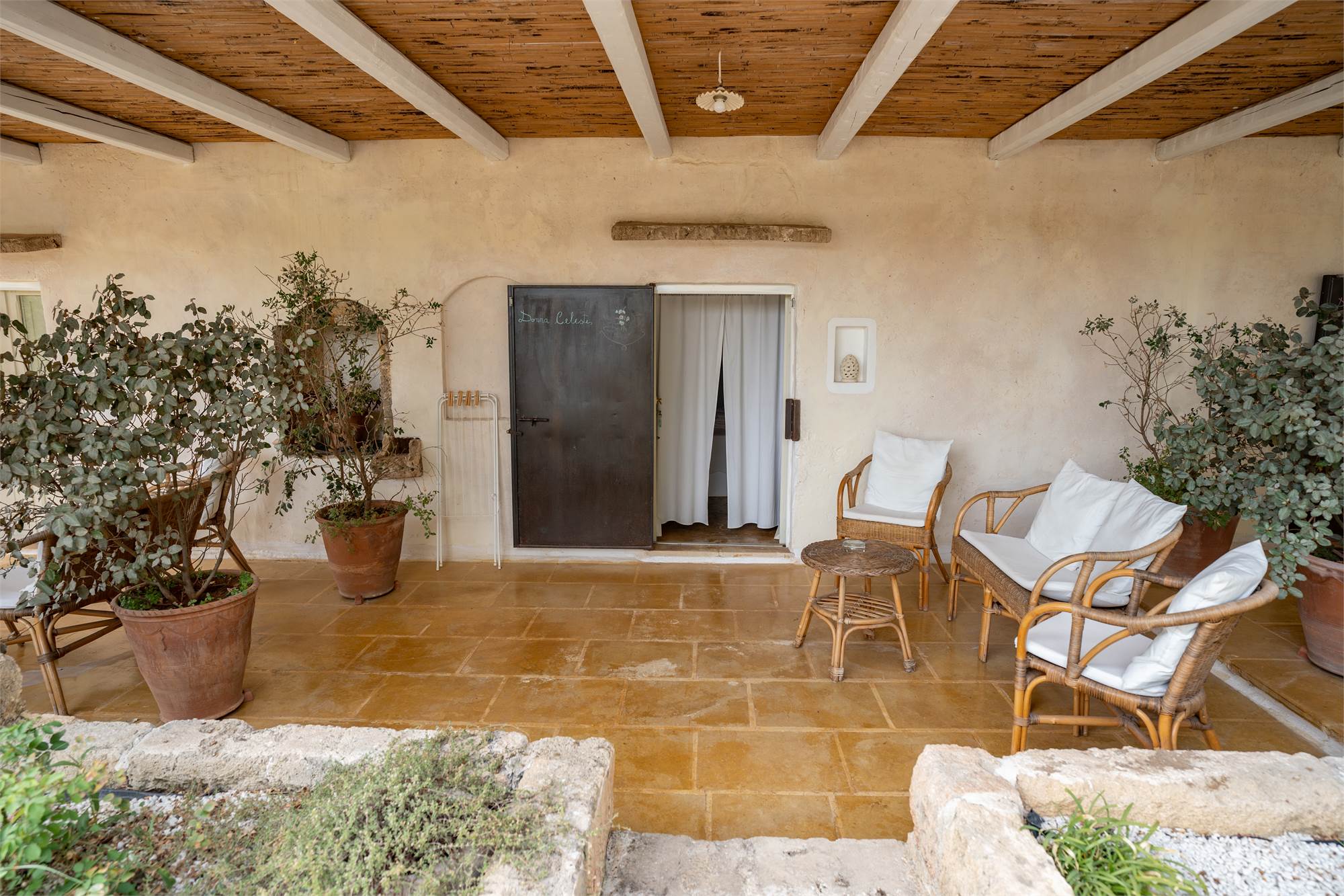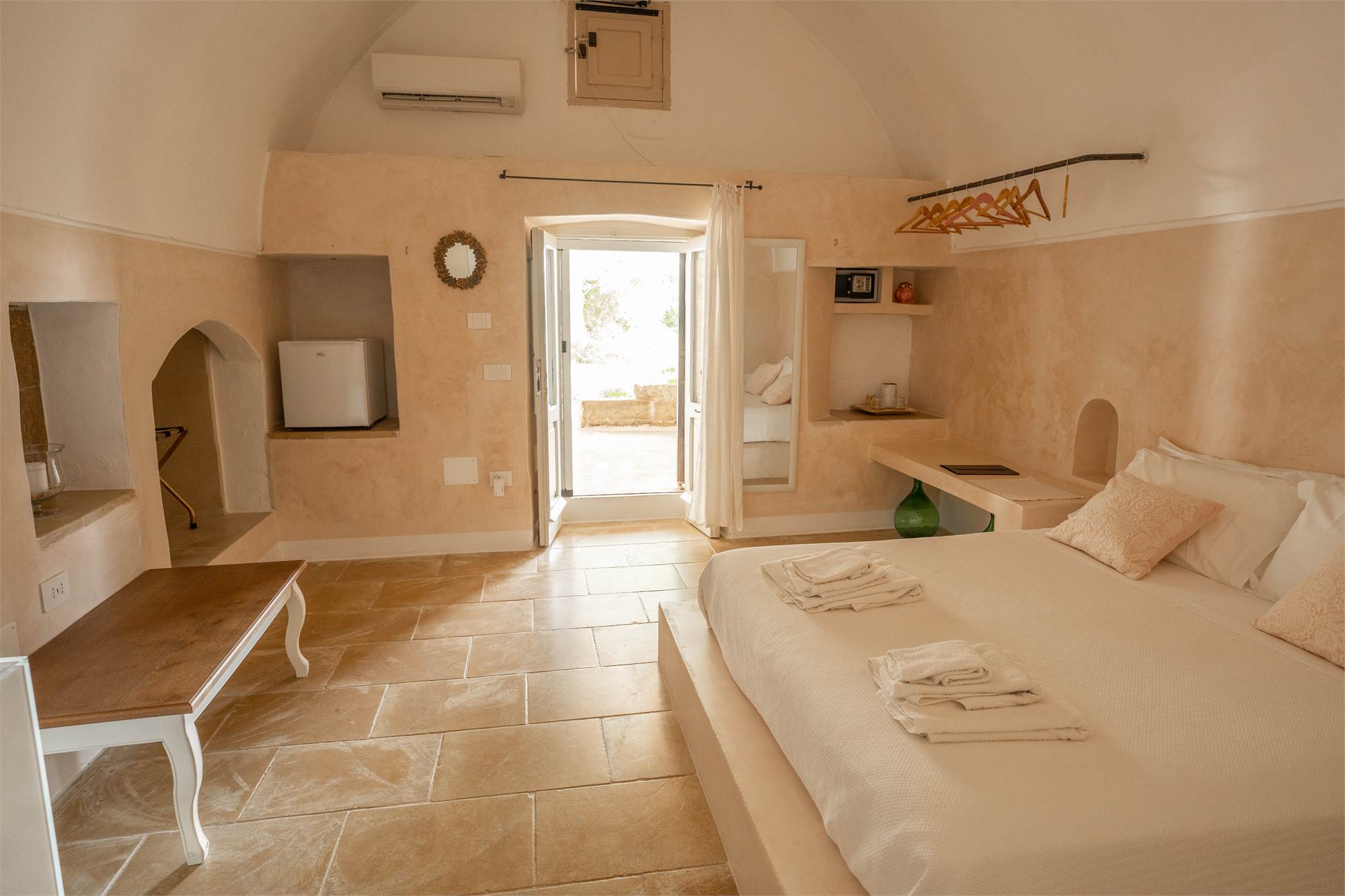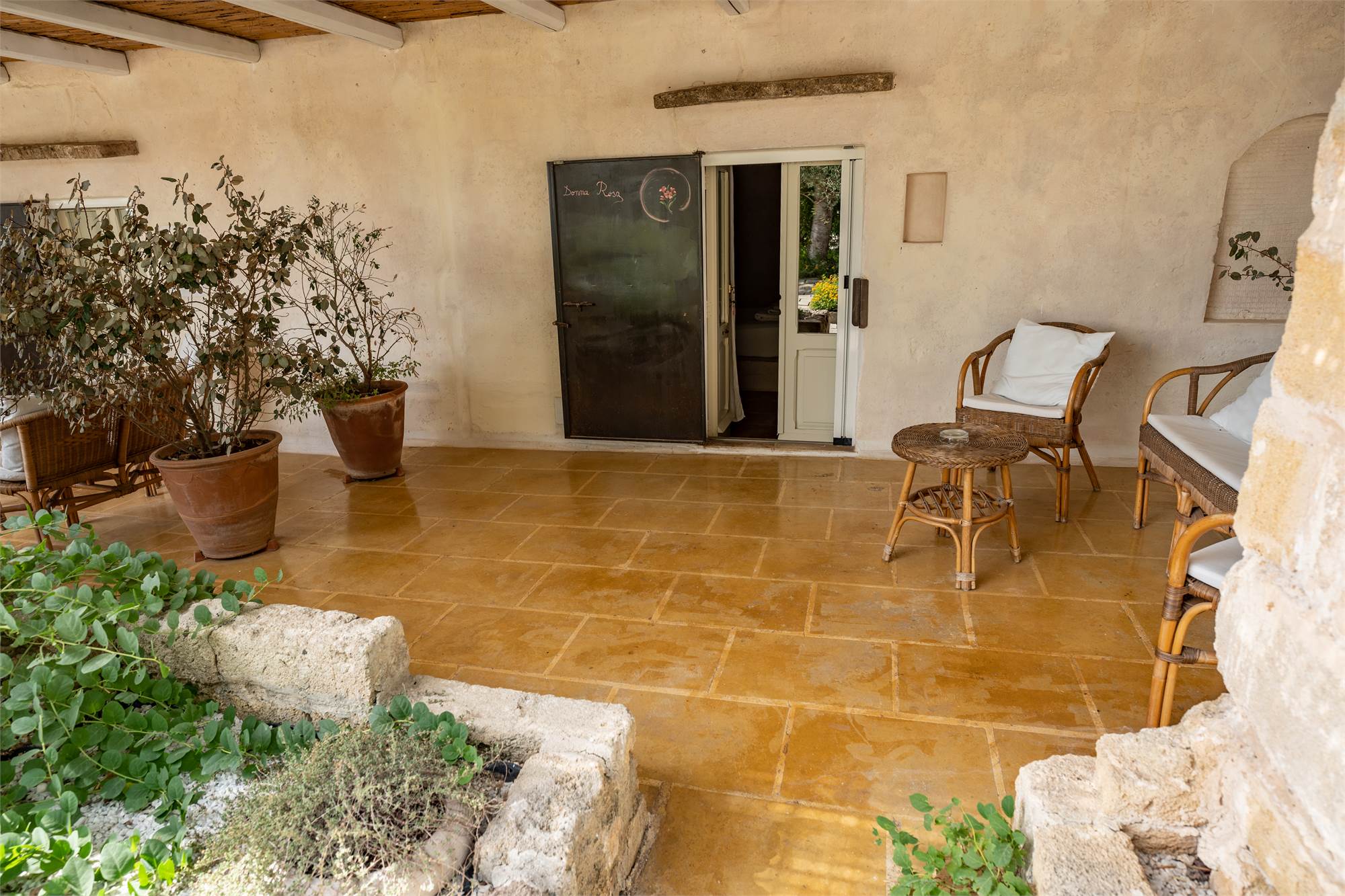 Situata in una zona tranquilla e pittoresca del Salento, la masseria garantisce privacy e serenità, diventando veramente "la quiete dell'anima". Gli ampi spazi esterni, arricchiti da angoli dedicati al relax, sottolineano la magia di questa proprietà dai tratti storici. Le nicchie, i complementi d'arredo in pietra leccese e le tipiche volte a stella e botte in carparo contribuiscono a creare un'atmosfera unica.