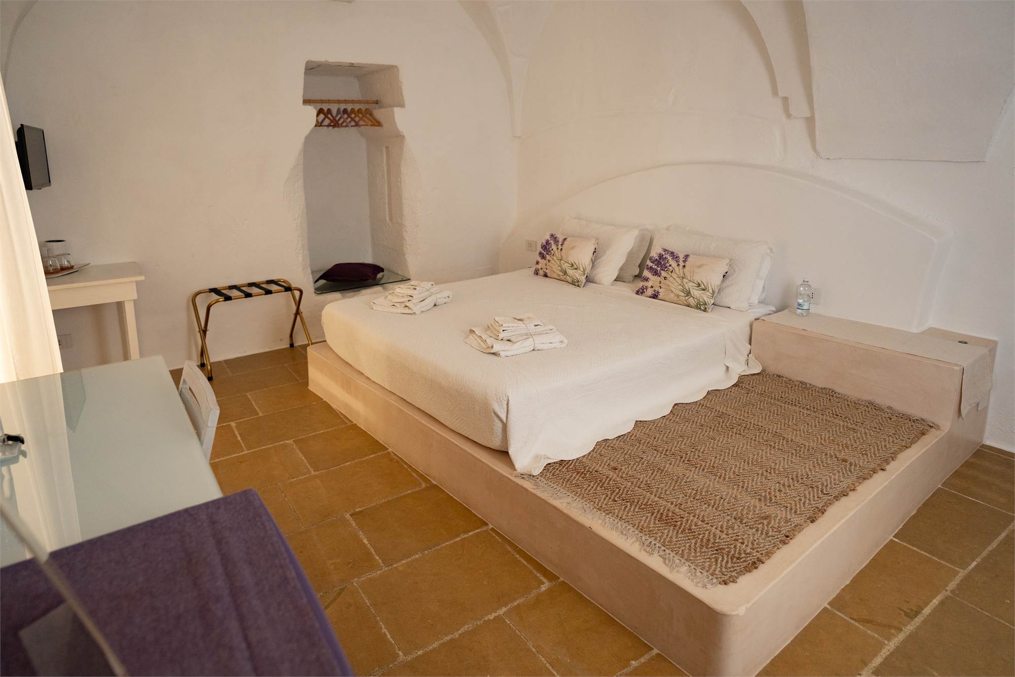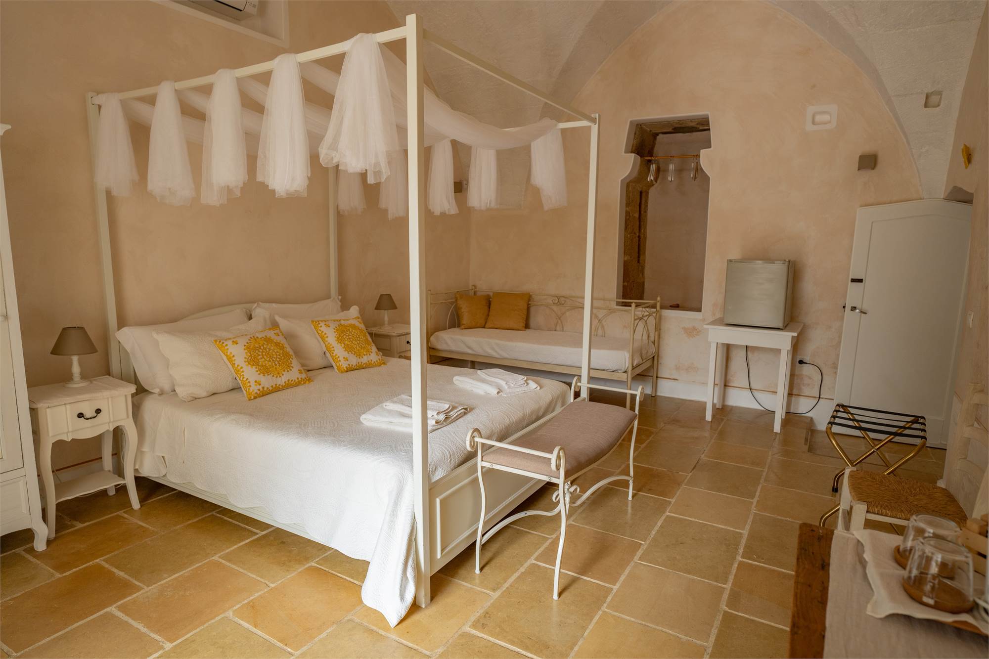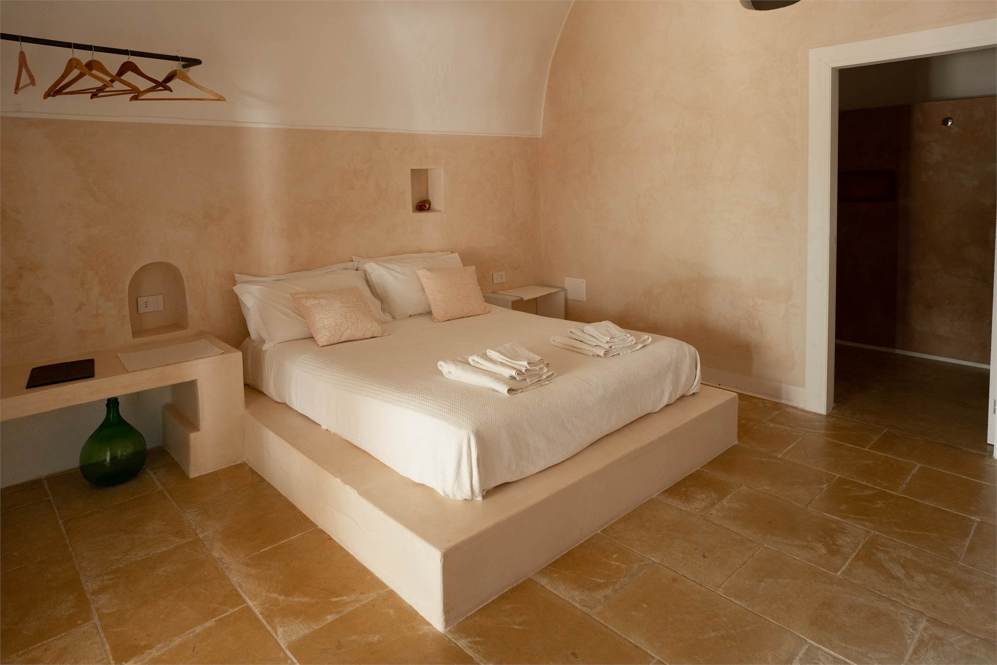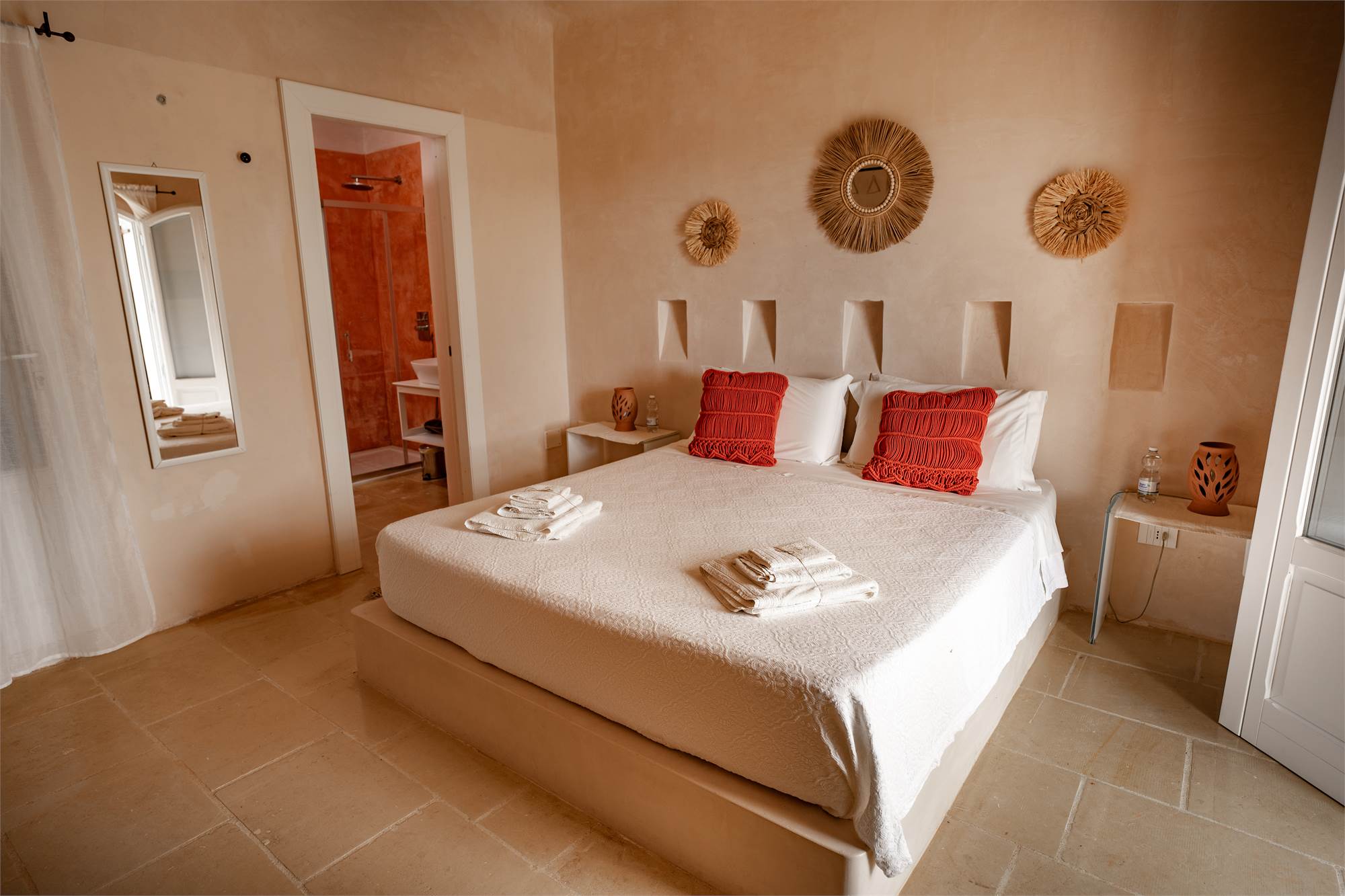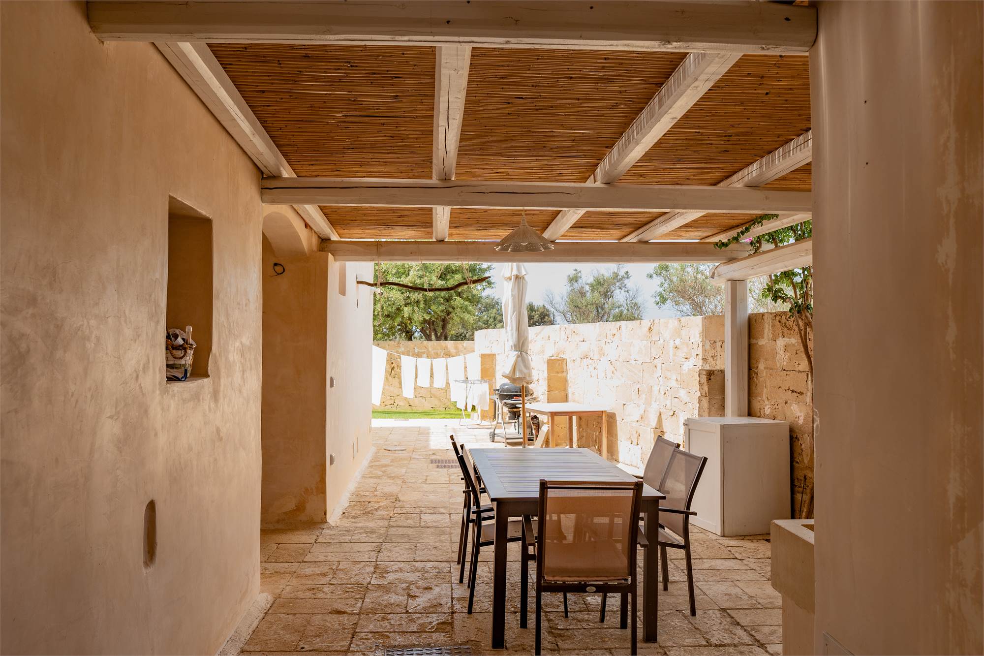 Situata in una zona tranquilla e pittoresca del Salento, la masseria garantisce privacy e serenità, diventando veramente "la quiete dell'anima". Gli ampi spazi esterni, arricchiti da angoli dedicati al relax, sottolineano la magia di questa proprietà dai tratti storici. Le nicchie, i complementi d'arredo in pietra leccese e le tipiche volte a stella e botte in carparo contribuiscono a creare un'atmosfera unica.