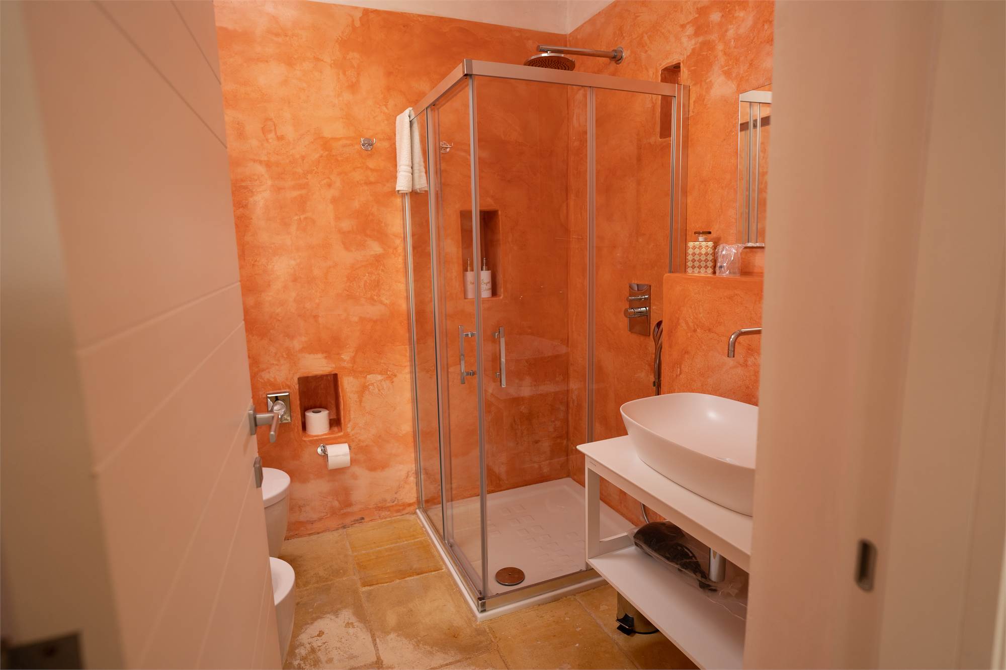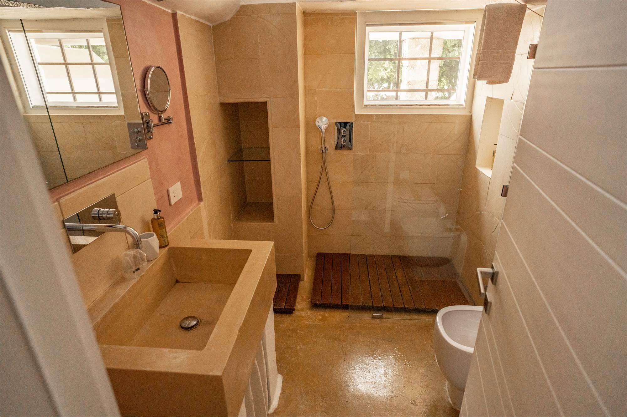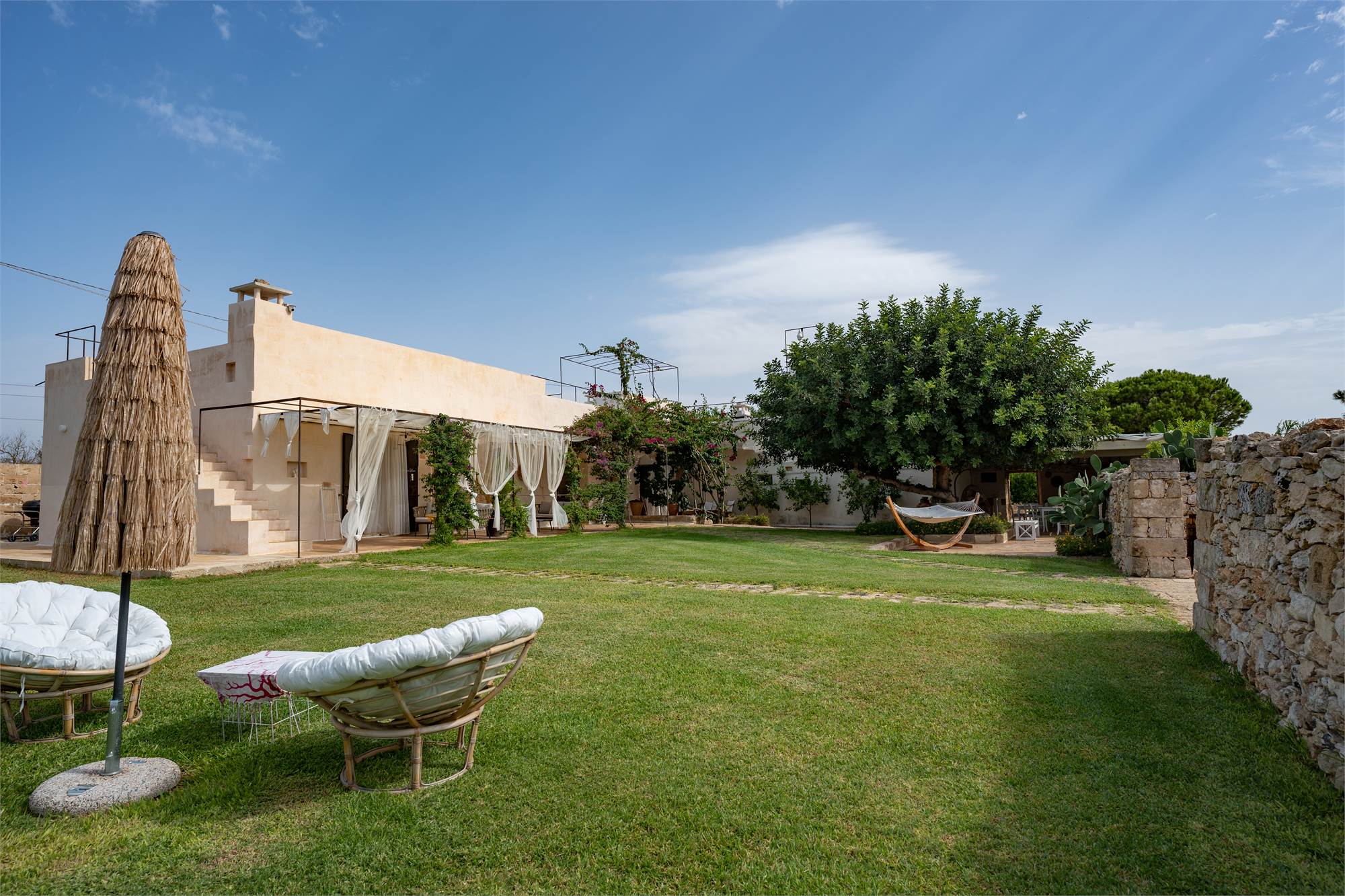 Frutto di una raffinata ristrutturazione, la masseria accoglie i suoi ospiti con sette camere da letto, ognuna dotata di bagno privato, due bagni di servizio, un elegante soggiorno interno e una cucina professionale moderna.