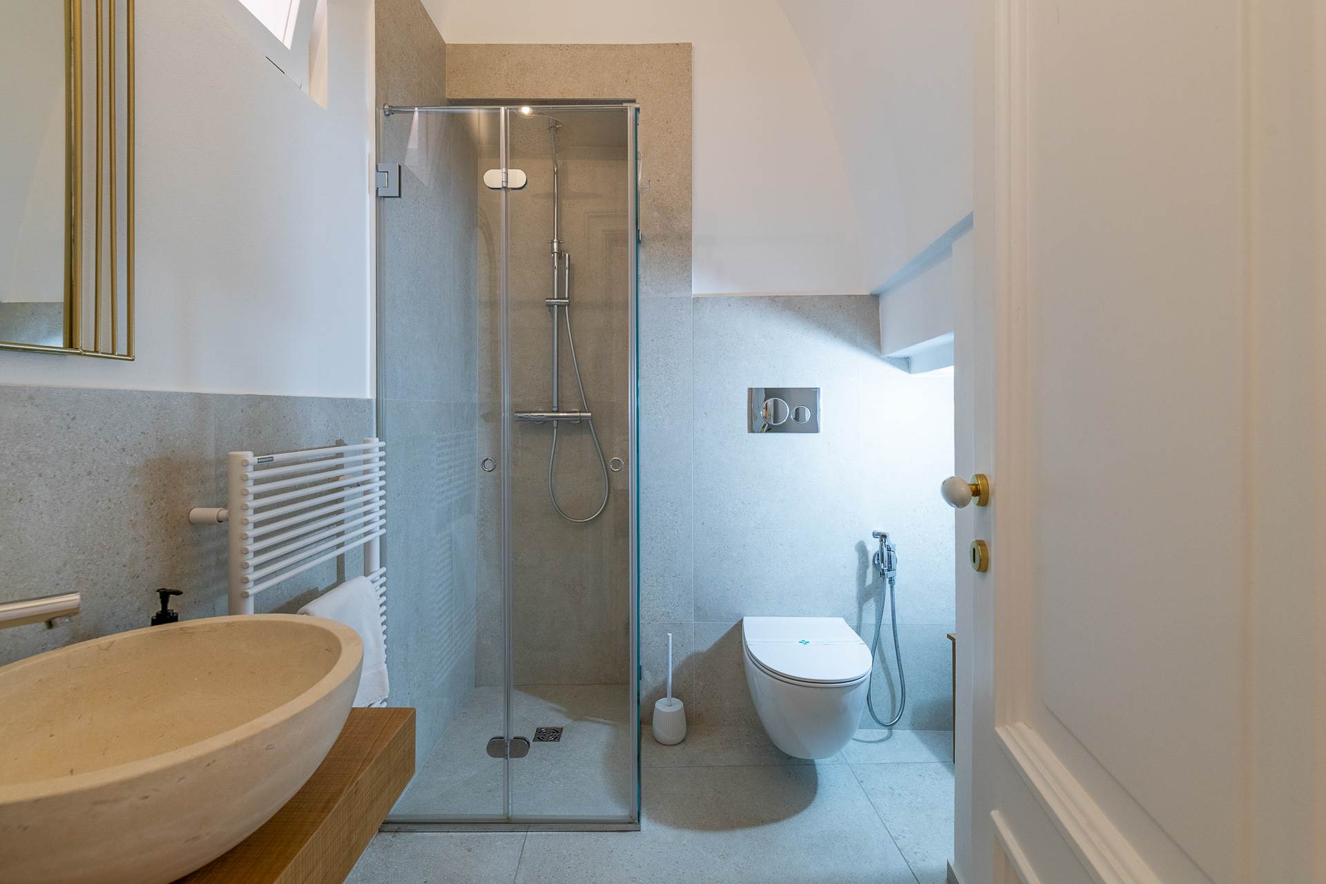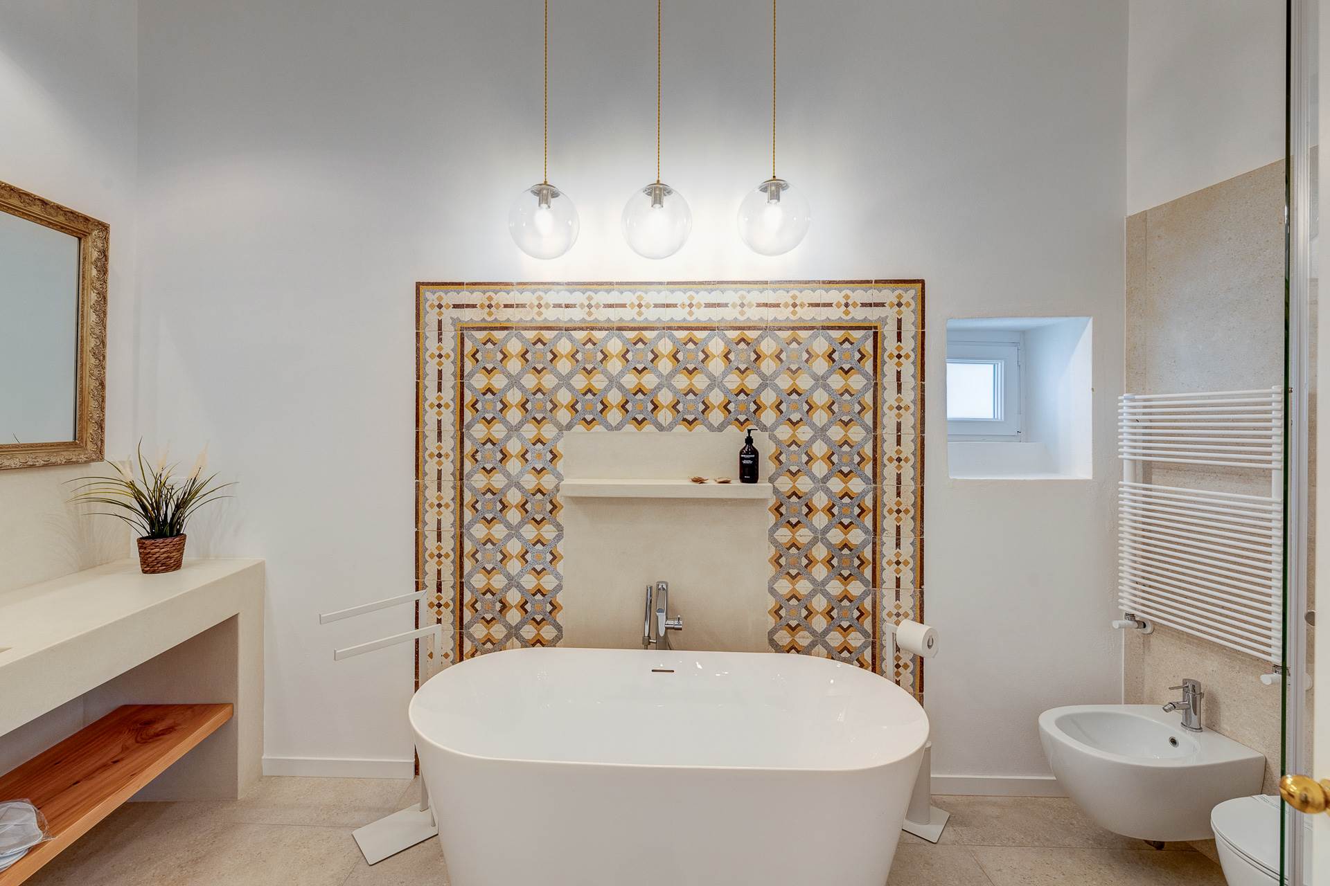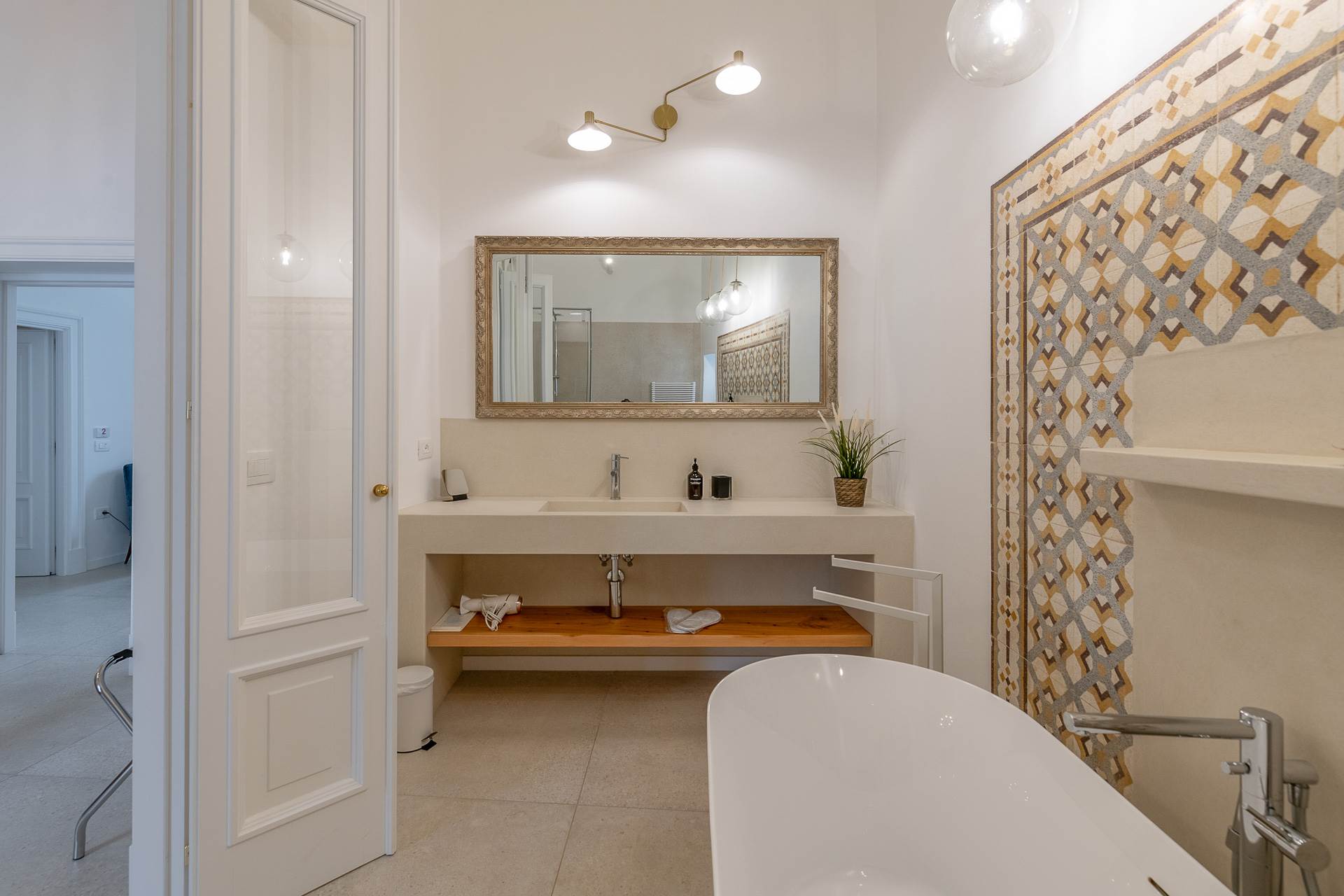 Il bagno privato nella stanza principale è arricchito da una vasca moderna, aggiungendo un tocco di comfort e contemporaneità alla residenza.