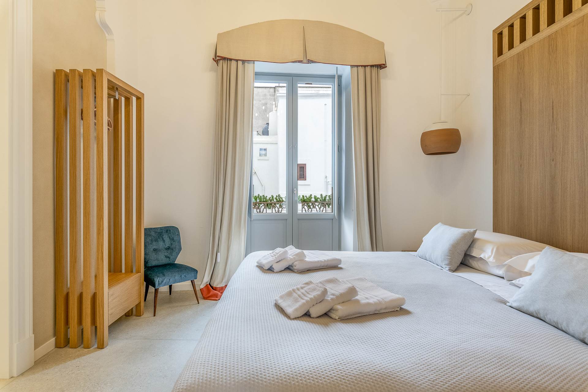 Salendo al primo piano attraverso una scala agevole, si trova un piccolo salottino con balcone che introduce a due stanze da letto.