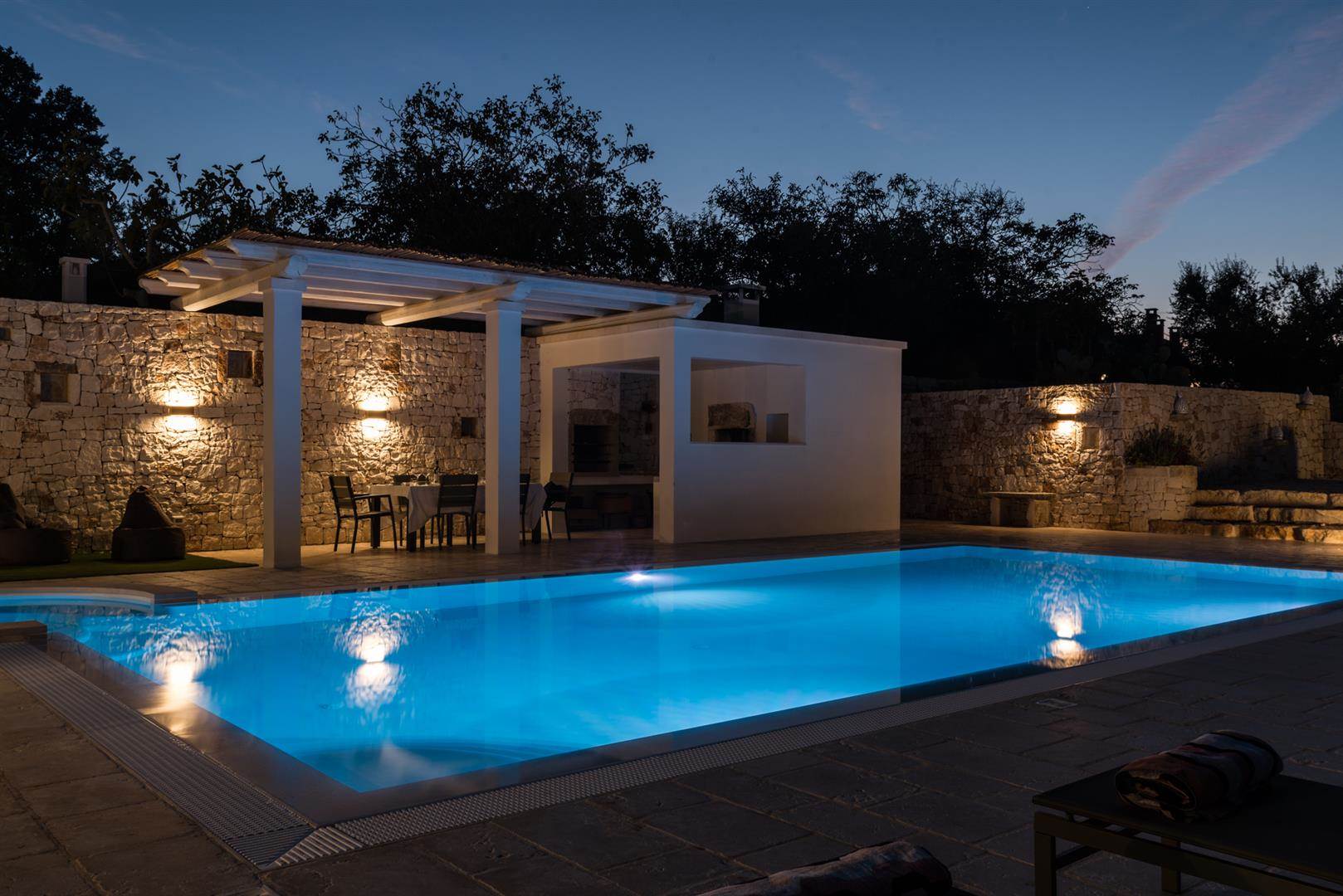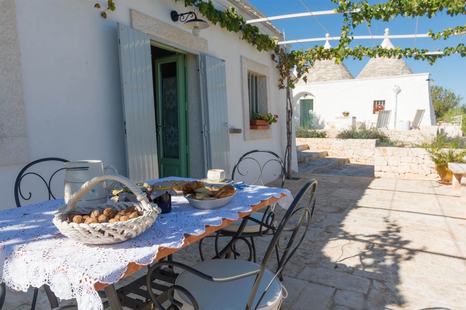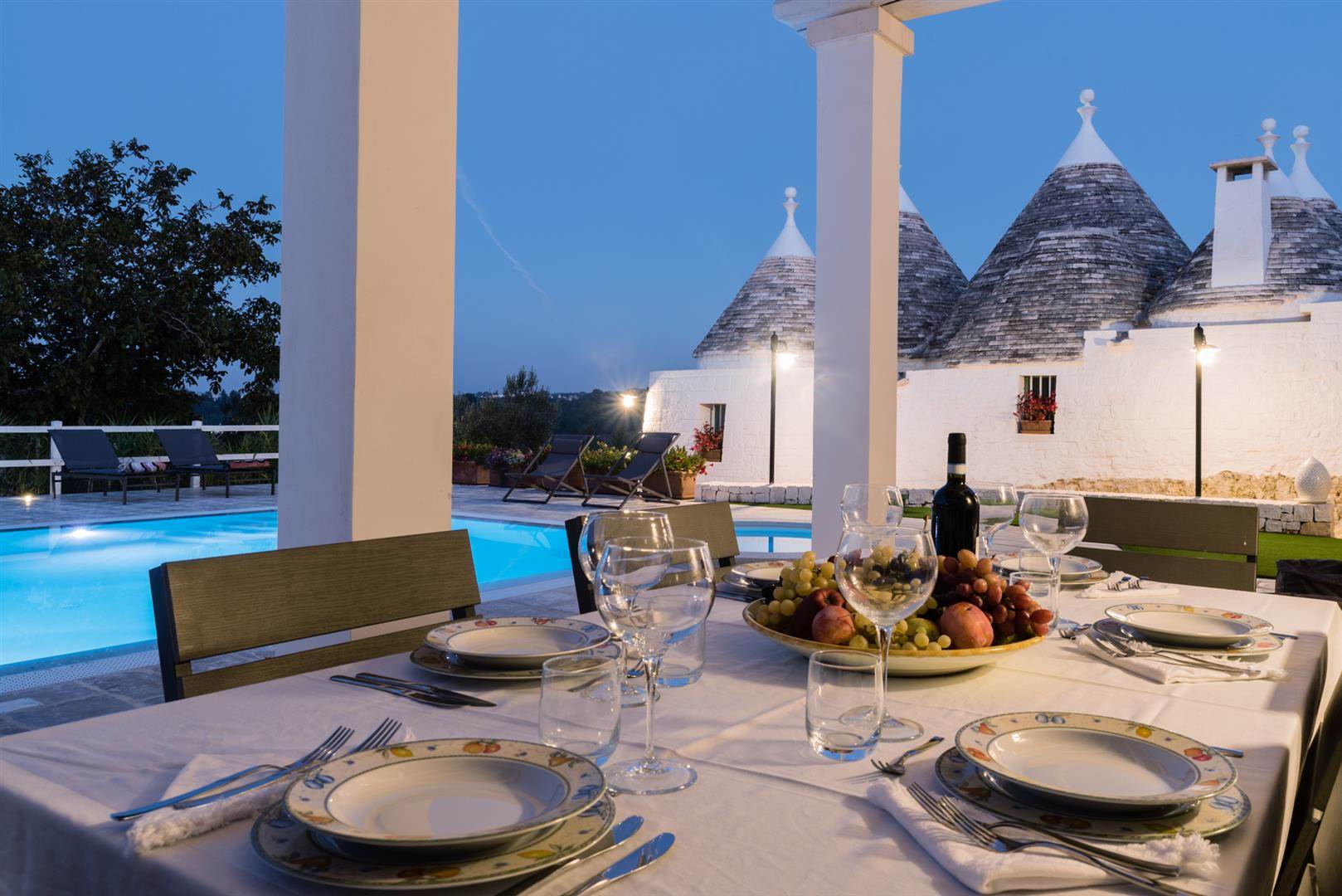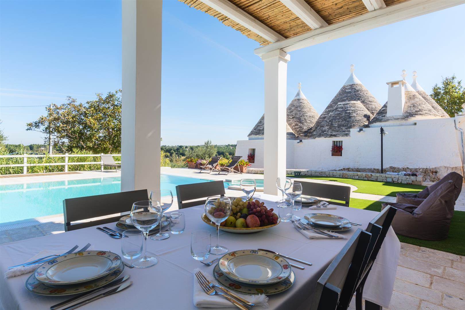 Trullo Il Fragno è composto da una zona esterna molto ampia con una piscina a dir poco spettacolare, a bordo piscina sono stati posizionati i lettini dove ci si potrà stendere per prendere il sole e proprio a lato della stessa uno splendido pergolato/veranda dove ci si potrà riparare durante le ore più calde e magari sorseggiare un calice di vino contemplando il tramonto oppure cenare dopo aver preparato una deliziosa grigliata grazie alla presenza di un BBQ esterno con un piano di appoggio dove ci si potrà dilettare nella preparazione. Oltre a questa zona, è presente un'altra area esterna attrezzata con tavolo e sedie, dalla quale si ha la splendida vista sulla valle e dove sarà bellissimo consumare le colazioni all'alba.