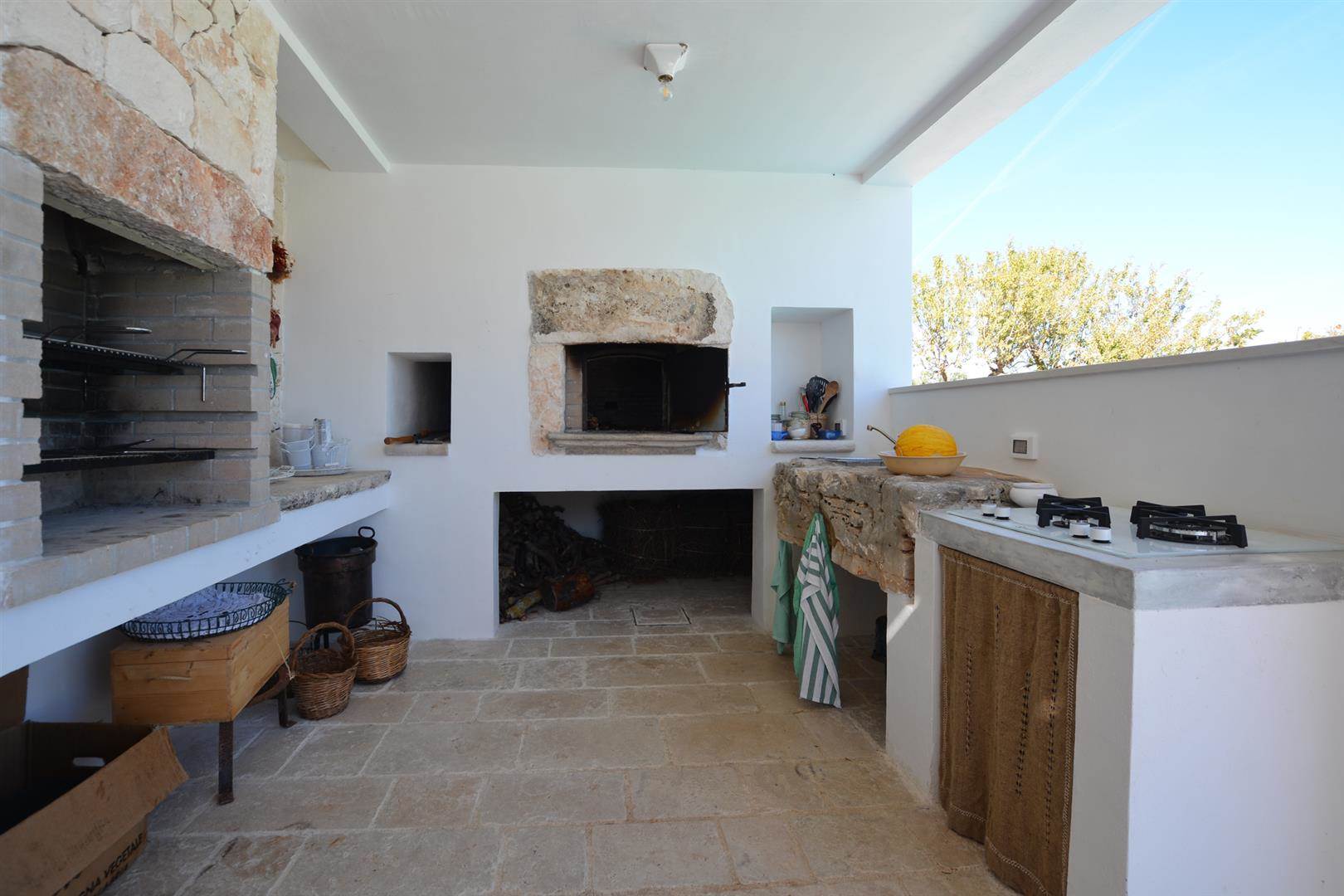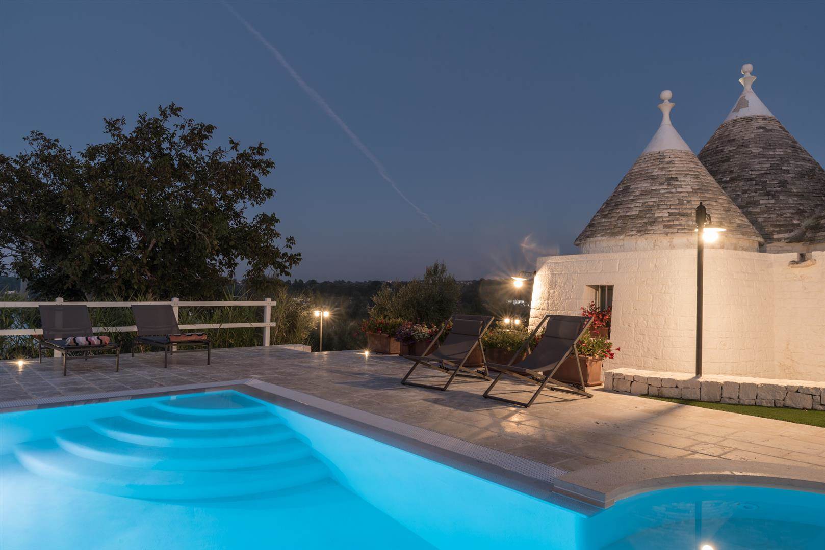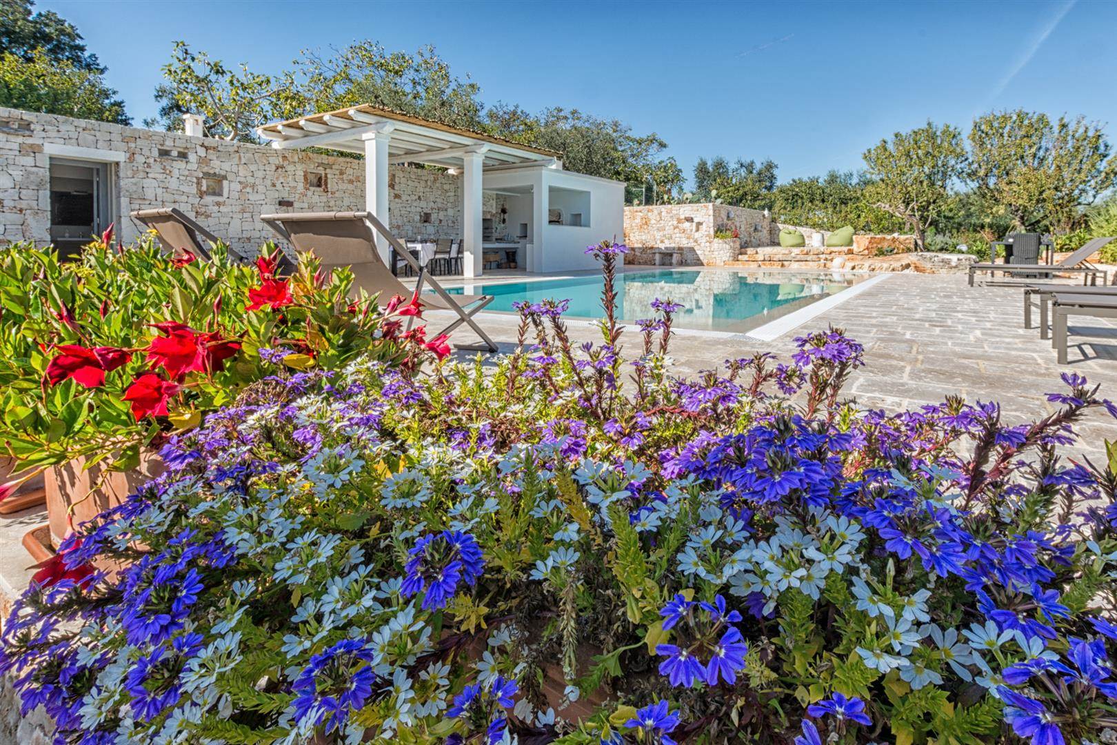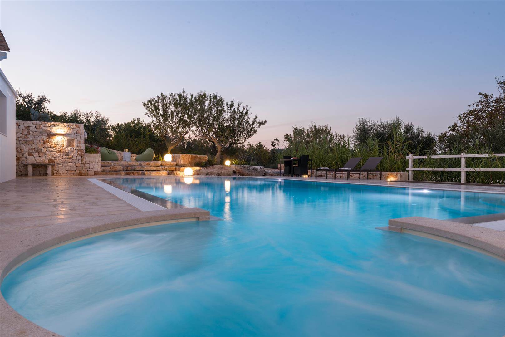 Trullo Il Fragno è composto da una zona esterna molto ampia con una piscina a dir poco spettacolare, a bordo piscina sono stati posizionati i lettini dove ci si potrà stendere per prendere il sole e proprio a lato della stessa uno splendido pergolato/veranda dove ci si potrà riparare durante le ore più calde e magari sorseggiare un calice di vino contemplando il tramonto oppure cenare dopo aver preparato una deliziosa grigliata grazie alla presenza di un BBQ esterno con un piano di appoggio dove ci si potrà dilettare nella preparazione. Oltre a questa zona, è presente un'altra area esterna attrezzata con tavolo e sedie, dalla quale si ha la splendida vista sulla valle e dove sarà bellissimo consumare le colazioni all'alba.