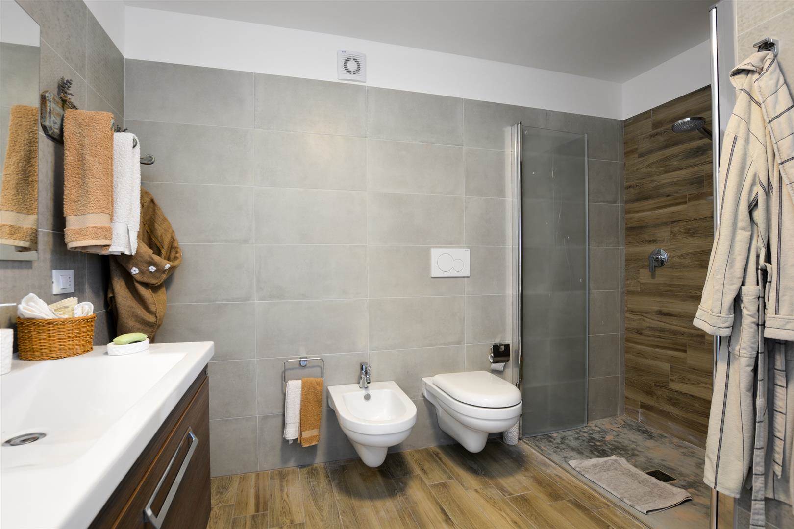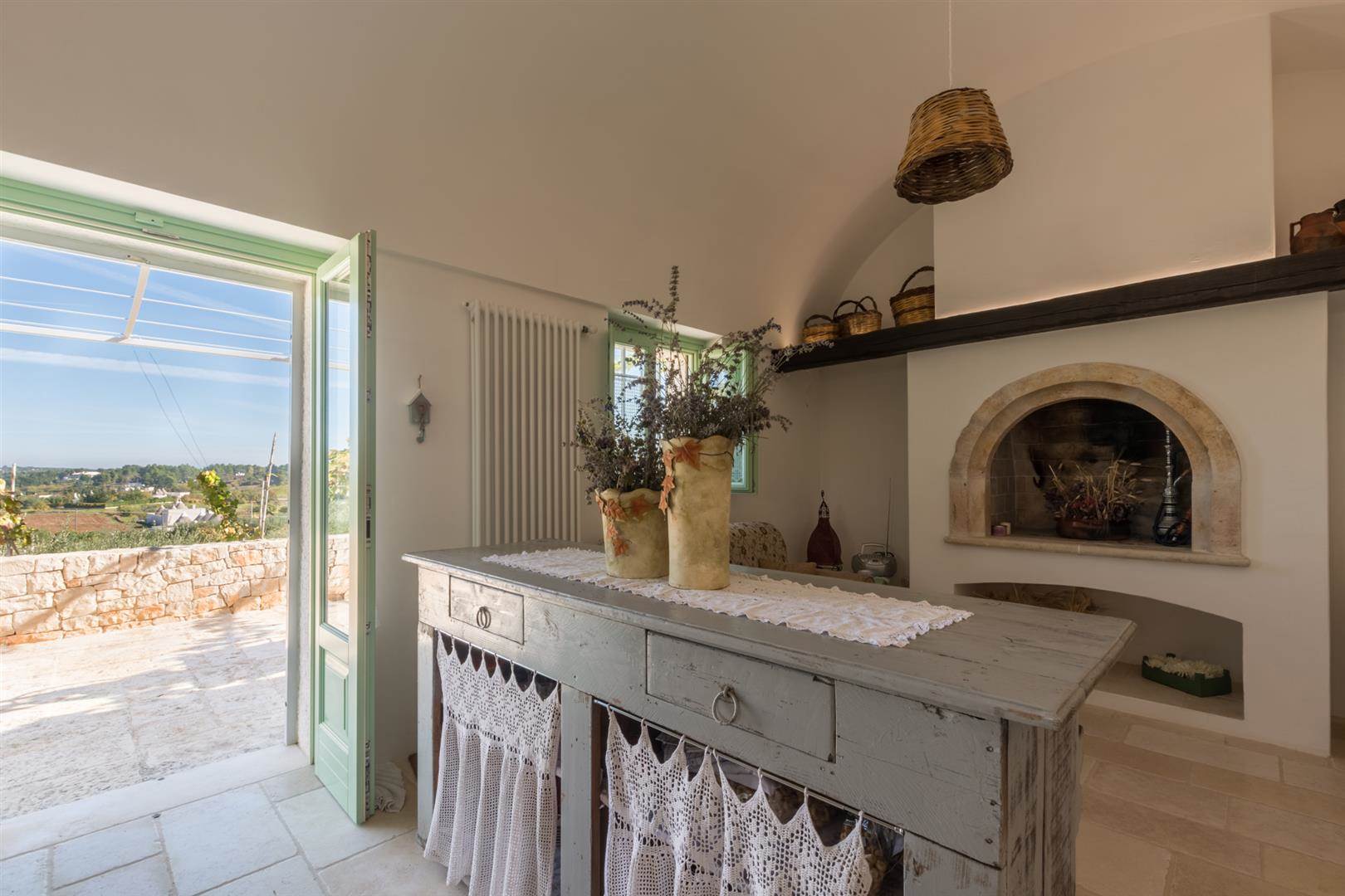 Entrando nella prima stanza si troverà la cucina, davvero graziosa in stile country, si tratta di una cucina attrezzata e zona sala pranzo dove c'è un tavolo per poter pranzare, da questa zona si passa alla piccola zona living dove c'è il camino e una seduta in muratura sulla quale sono adagiati dei cuscini, proprio a fianco a questa stanza c'è un'altra zona living con divano e TV.