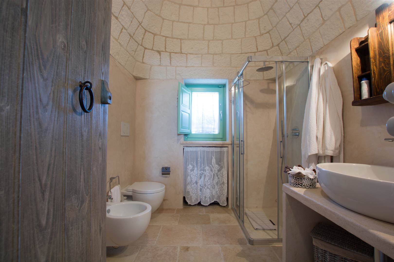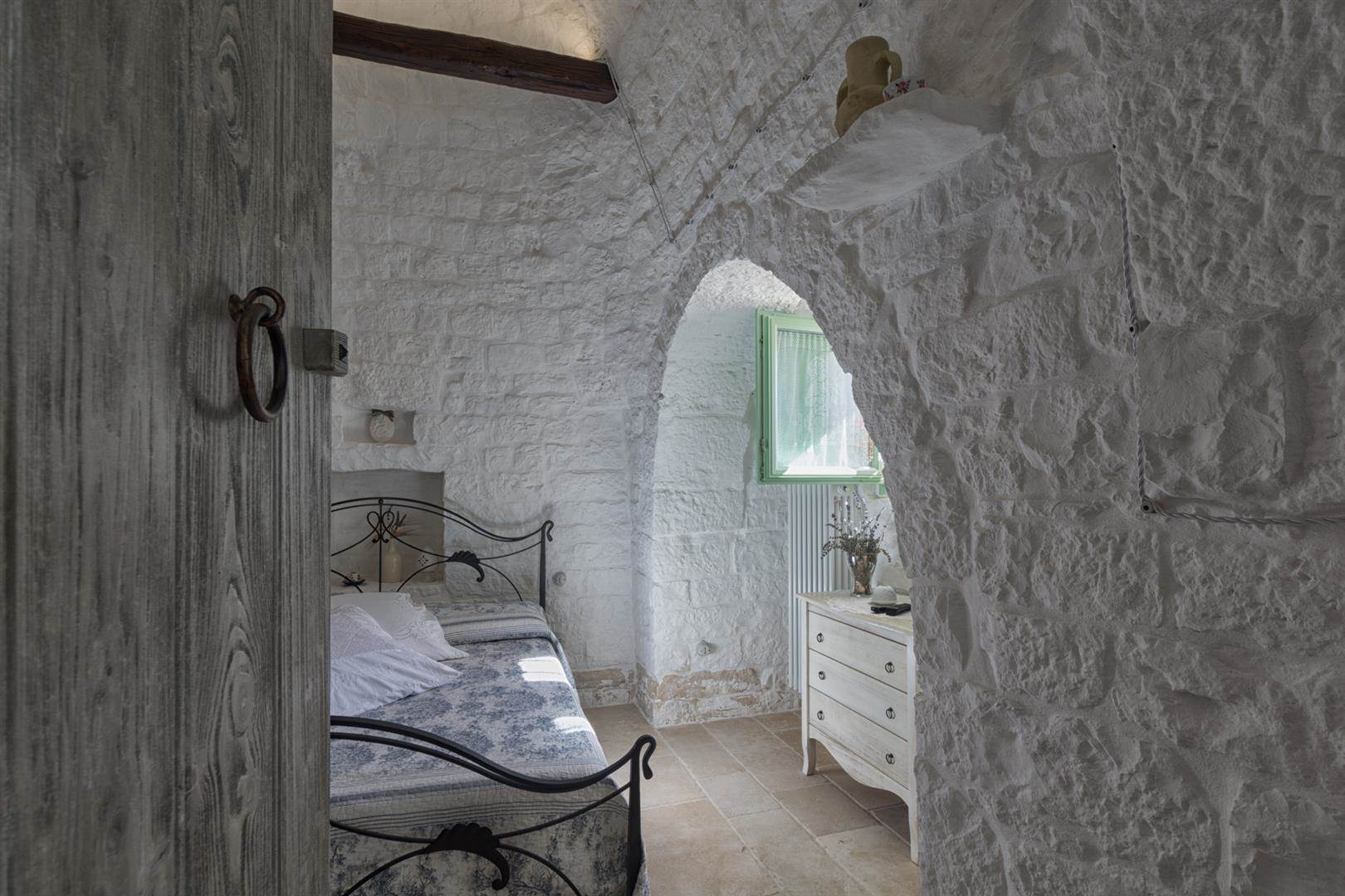 Trullo Il Fragno è composto da tre camere da letto matrimoniali molto luminose grazie alle finestre che permettono la vista sulla campagna circostante, ma ciò che le rende uniche sono le volte con pietra a vista che danno un tocco caratteristico, unico e speciale a questi ambienti. I bagni sono in tutto 5, di cui uno si trova all'esterno; i bagni sono composti da WC, bidet, lavabo e doccia.