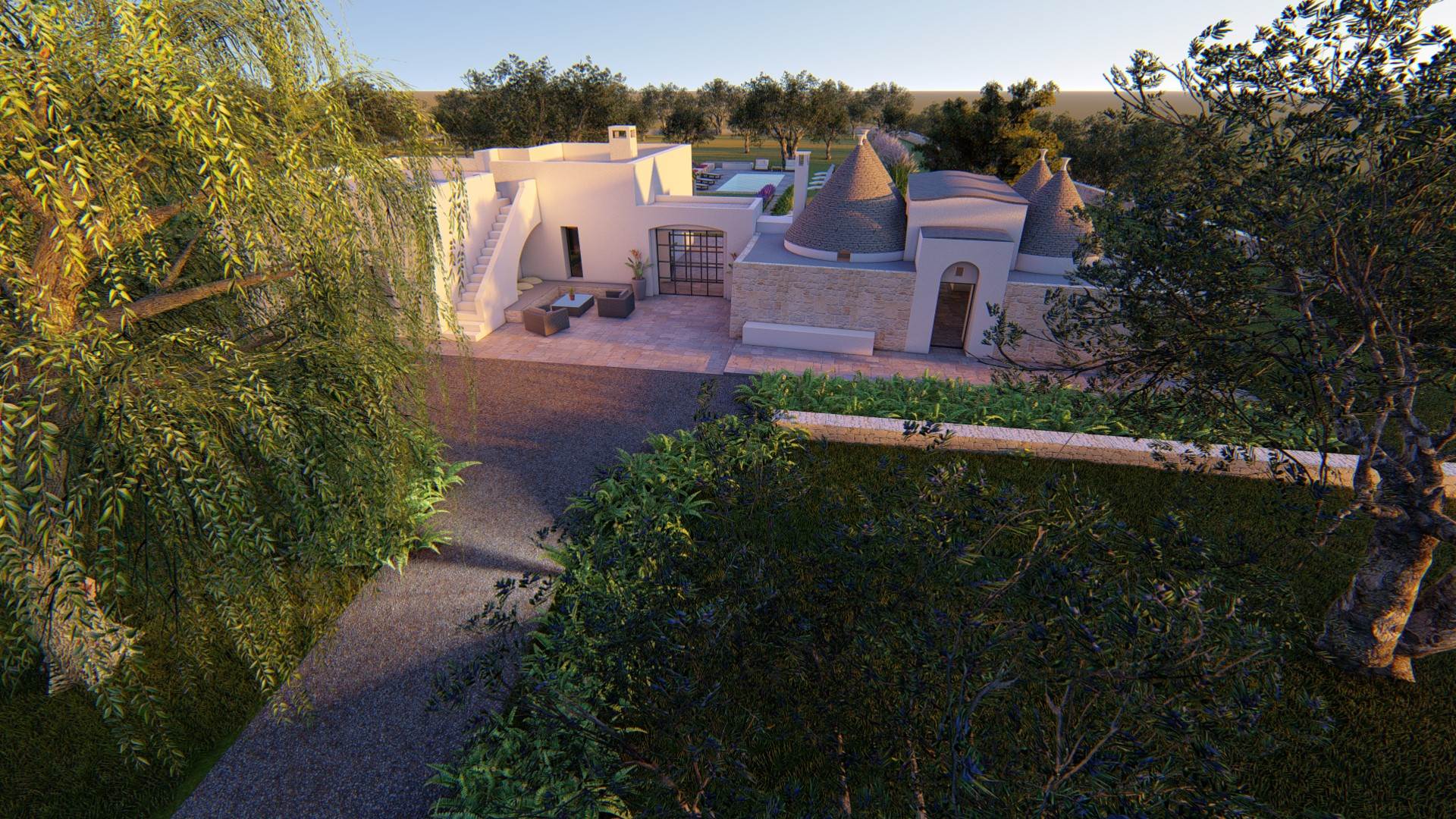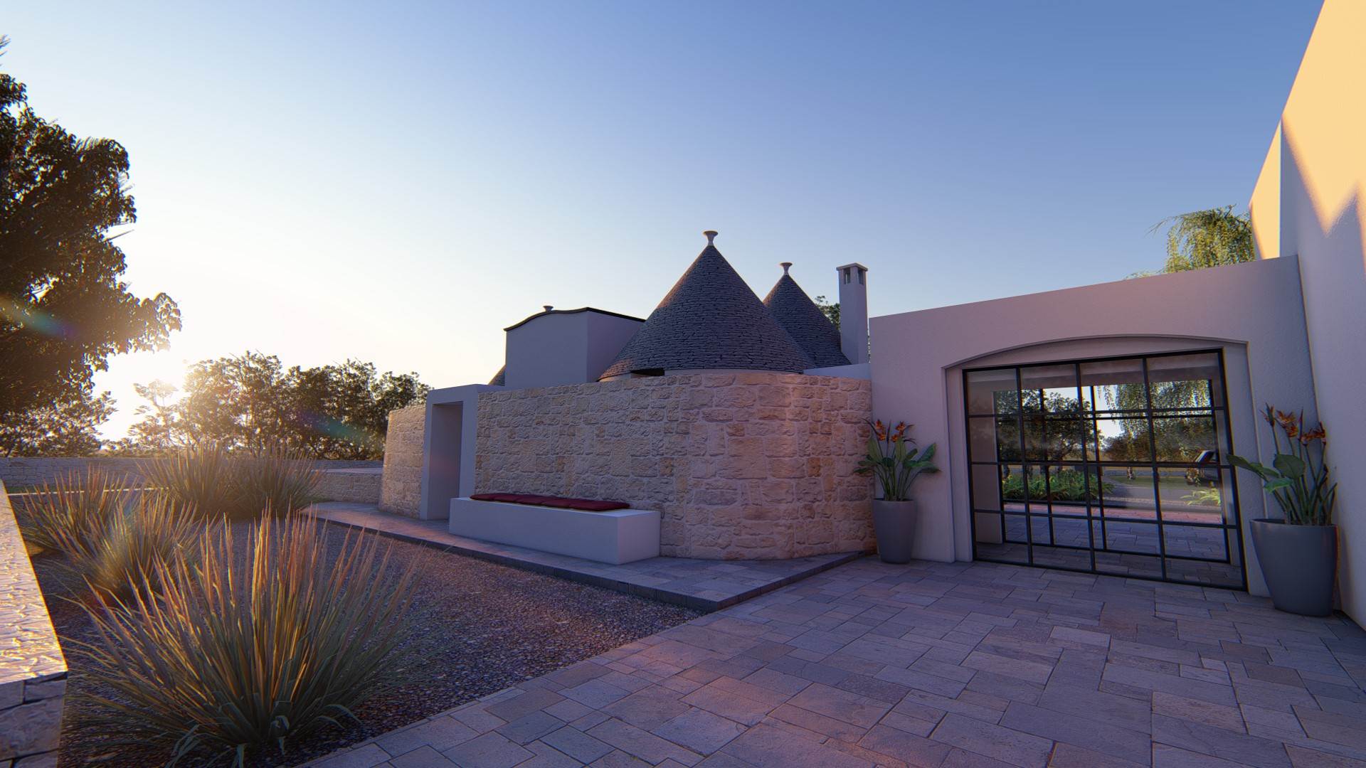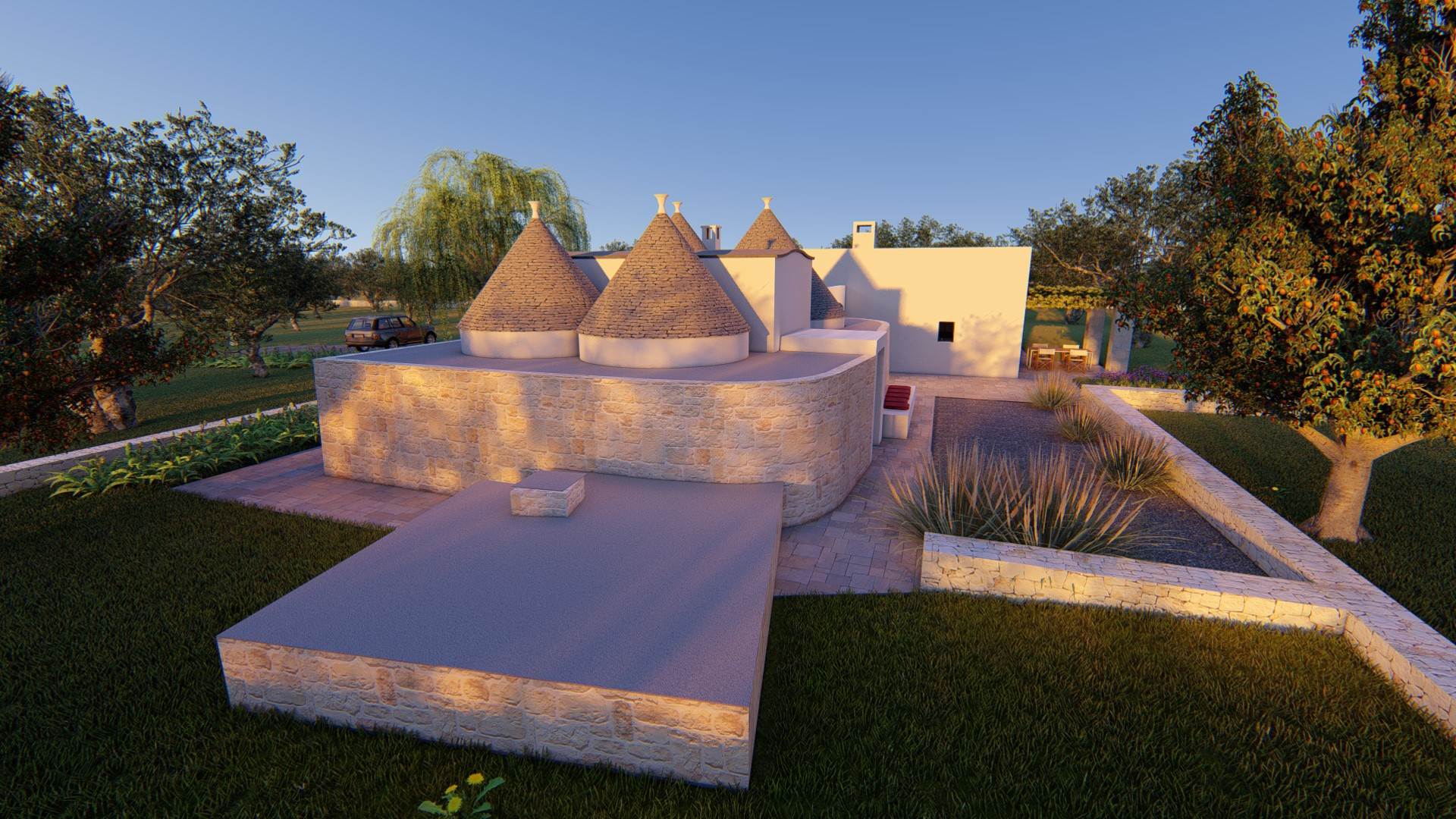 Il progetto di ristrutturazione prevede un ampliamento e una trasformazione completa del trullo, che si trasformerà in una confortevole residenza composta da tre camere da letto, tre bagni, un accogliente soggiorno con cucina a vista e uno spazioso deposito/garage.