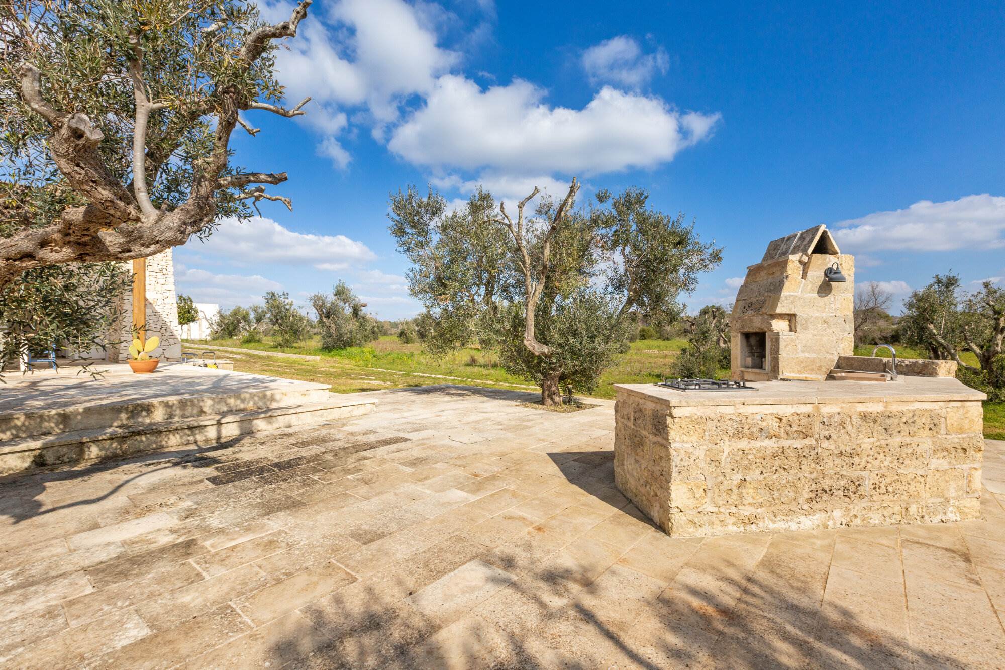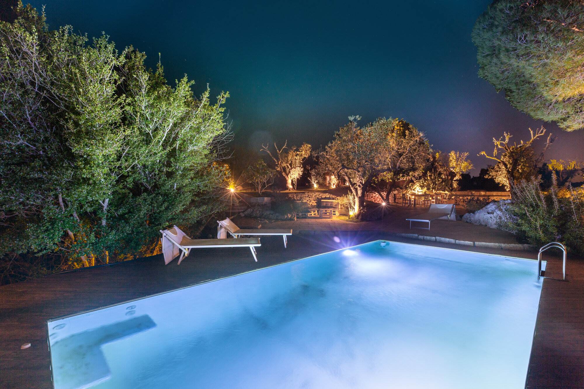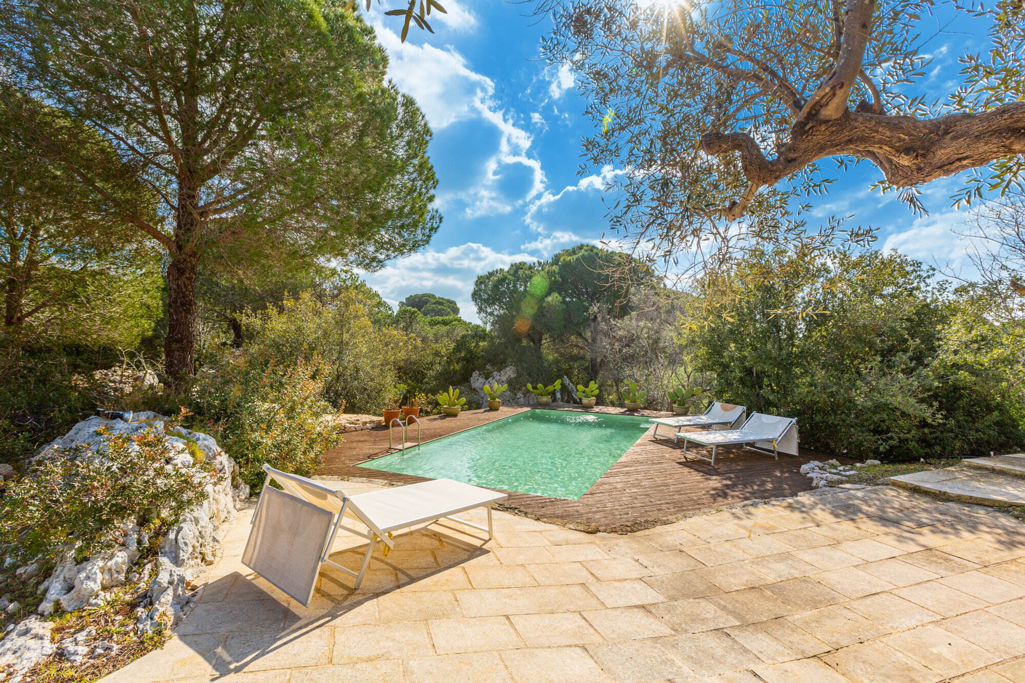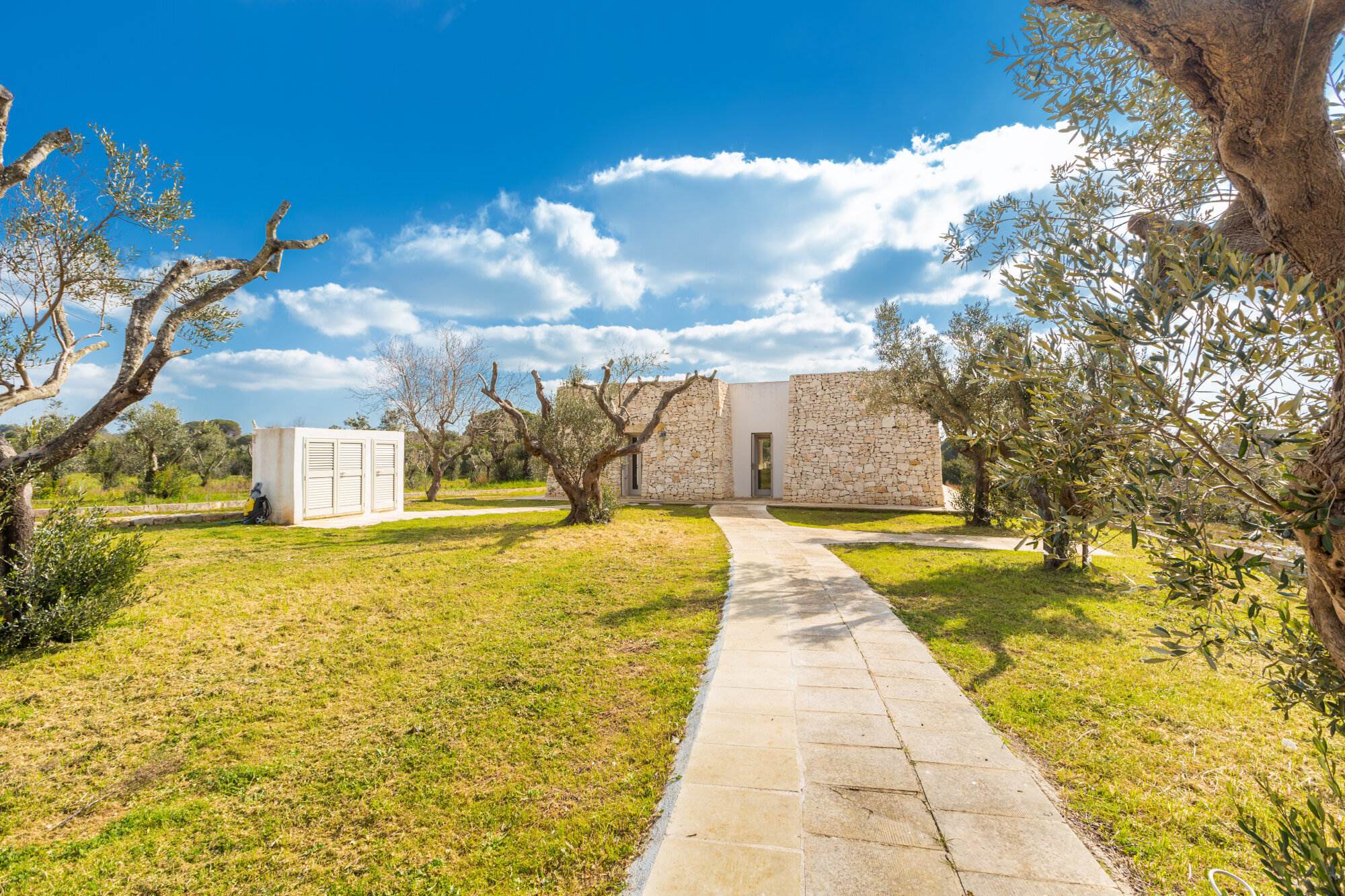 La villa si trova all'interno di un vasto uliveto secolare di 10.000 mq, arricchito da alberi di pino, mirto, nocciolo, fichi, rosmarino, mandorli, carrubi, querce e fichi d'india. Un orto coltivato produce generosamente delizie ogni anno. L'ambiente esterno è curato con la stessa attenzione ai dettagli e alla ricercatezza che caratterizza l'interno della villa.