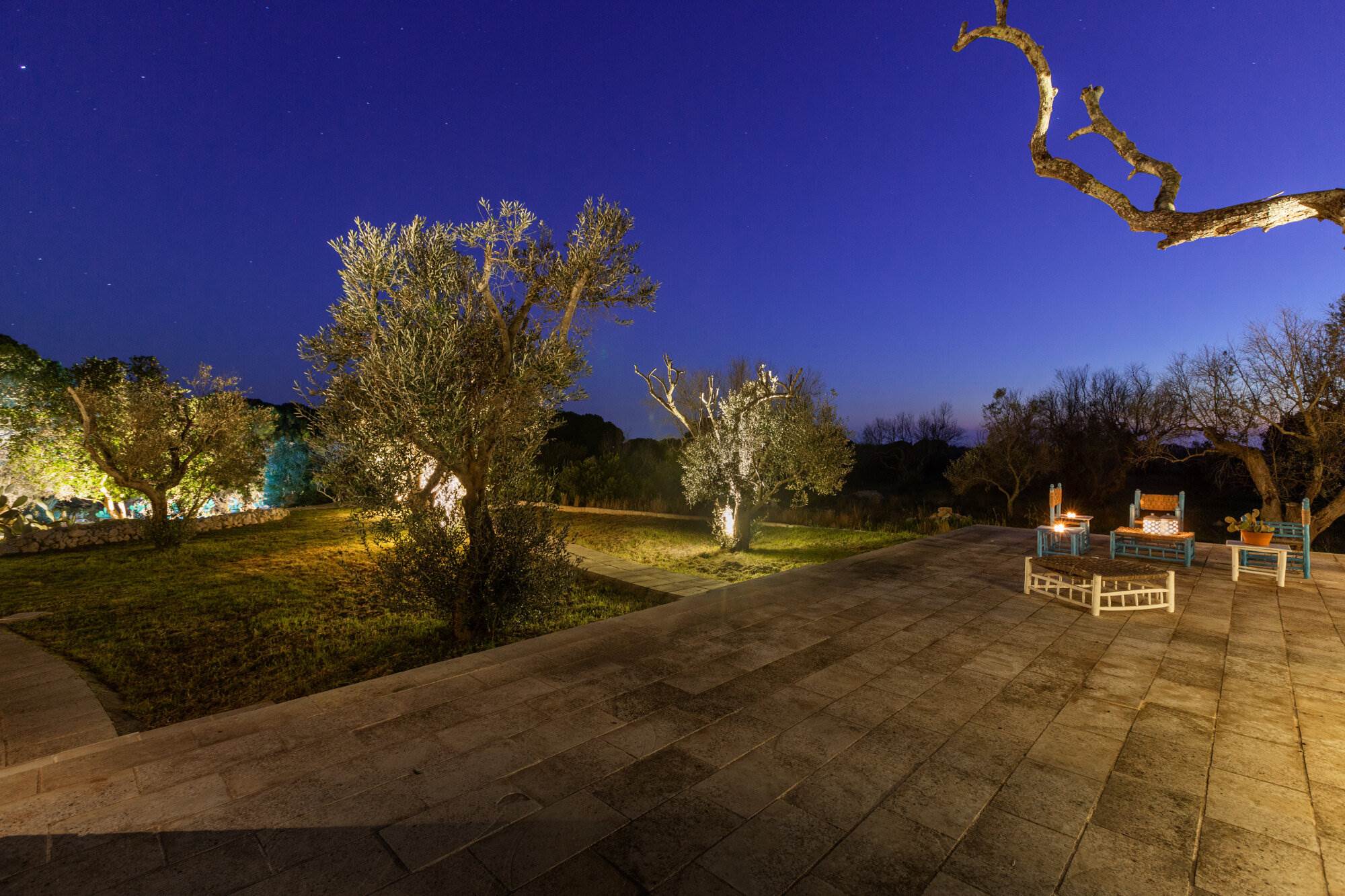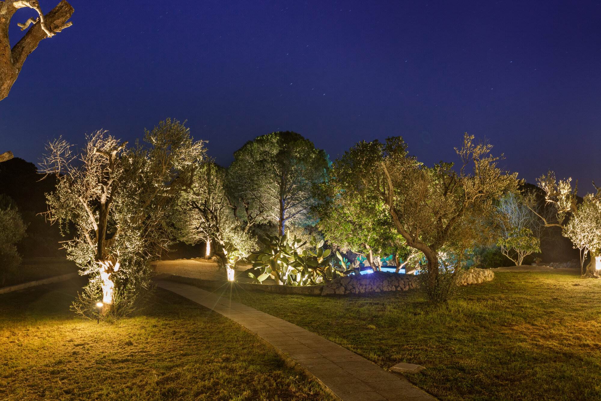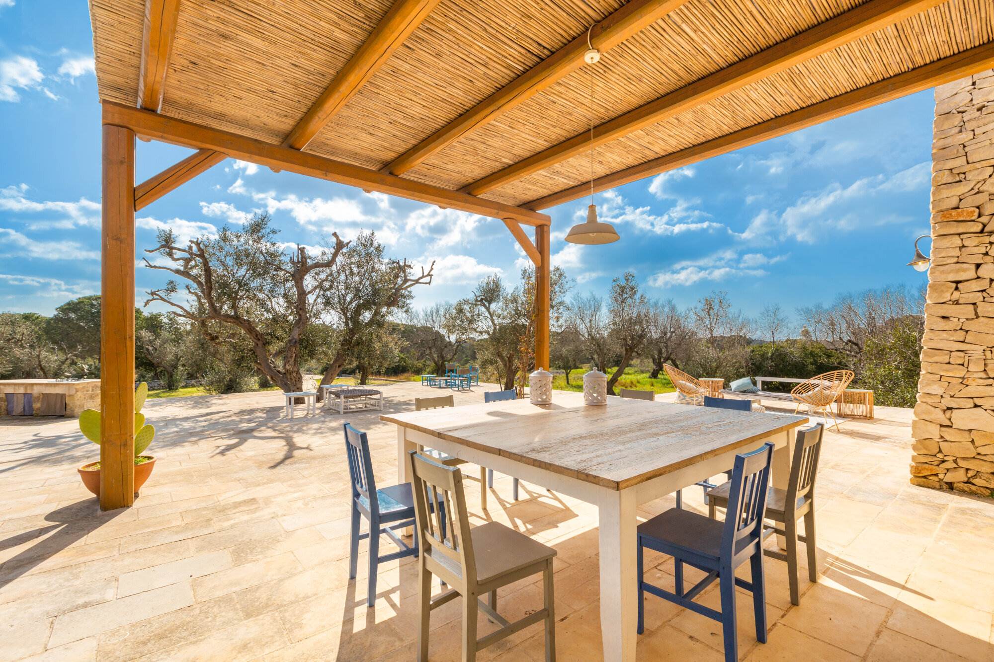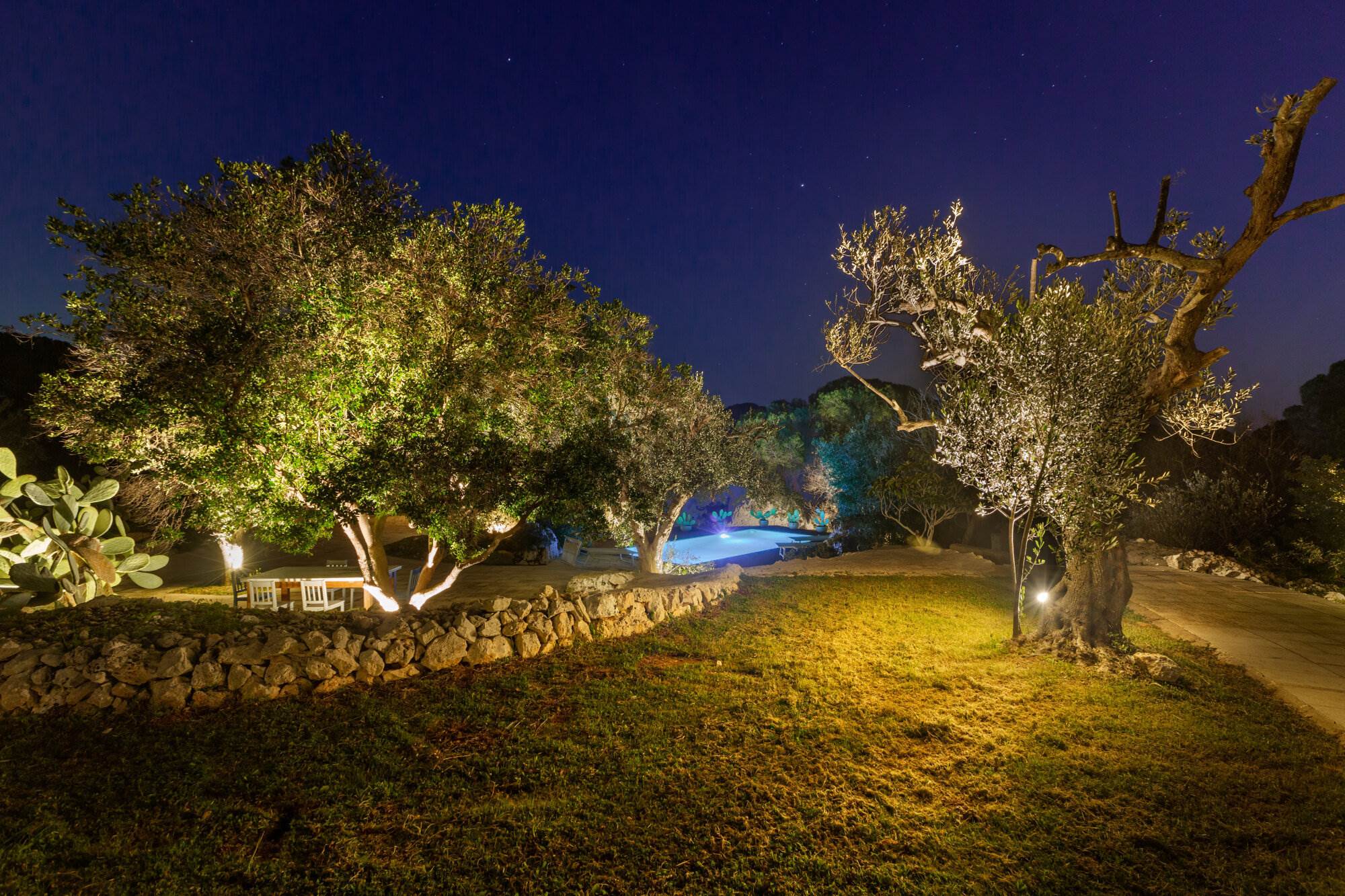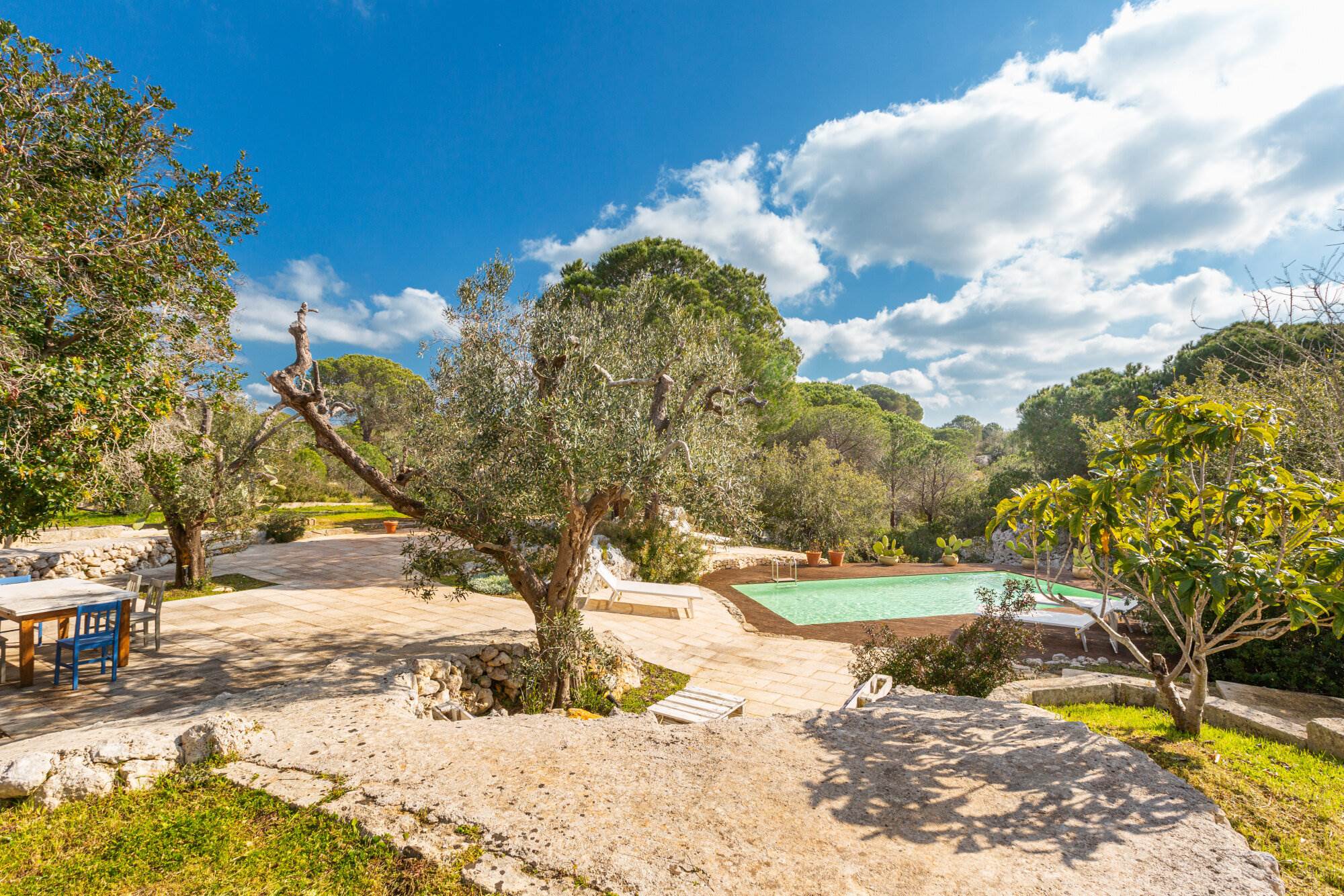 La villa si trova all'interno di un vasto uliveto secolare di 10.000 mq, arricchito da alberi di pino, mirto, nocciolo, fichi, rosmarino, mandorli, carrubi, querce e fichi d'india. Un orto coltivato produce generosamente delizie ogni anno. L'ambiente esterno è curato con la stessa attenzione ai dettagli e alla ricercatezza che caratterizza l'interno della villa.