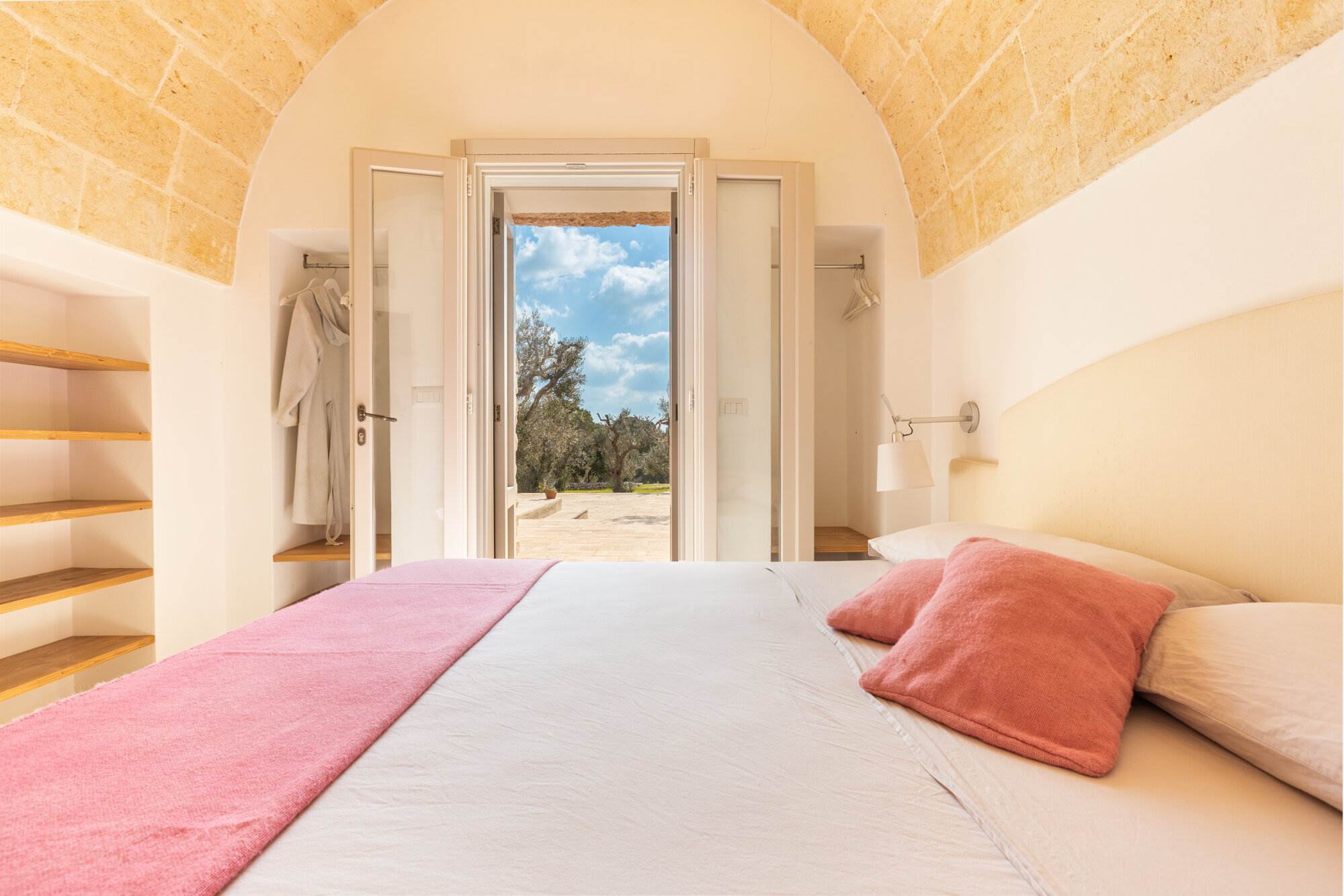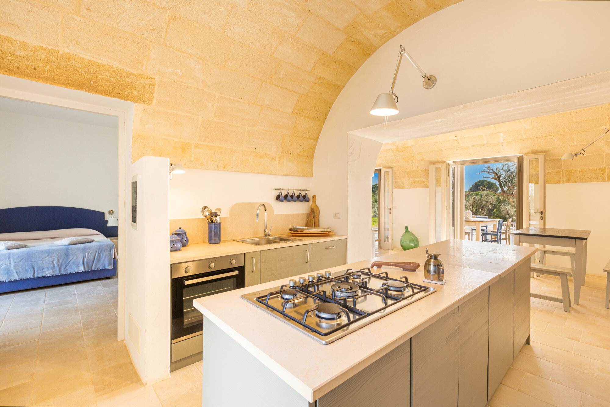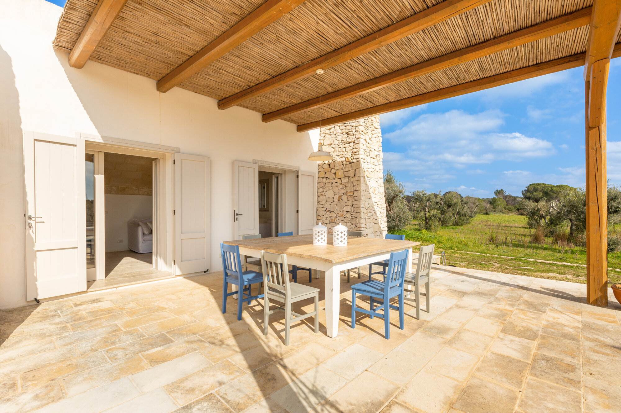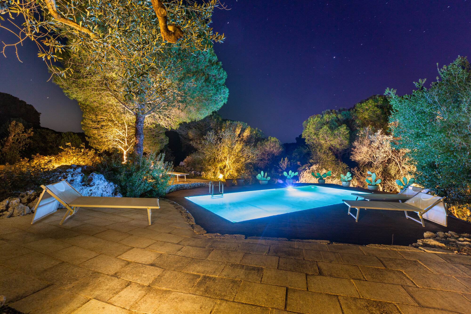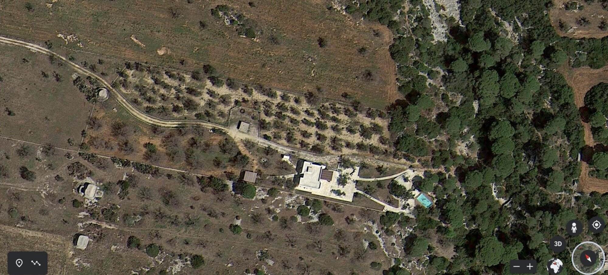 La villa si trova all'interno di un vasto uliveto secolare di 10.000 mq, arricchito da alberi di pino, mirto, nocciolo, fichi, rosmarino, mandorli, carrubi, querce e fichi d'india. Un orto coltivato produce generosamente delizie ogni anno. L'ambiente esterno è curato con la stessa attenzione ai dettagli e alla ricercatezza che caratterizza l'interno della villa.