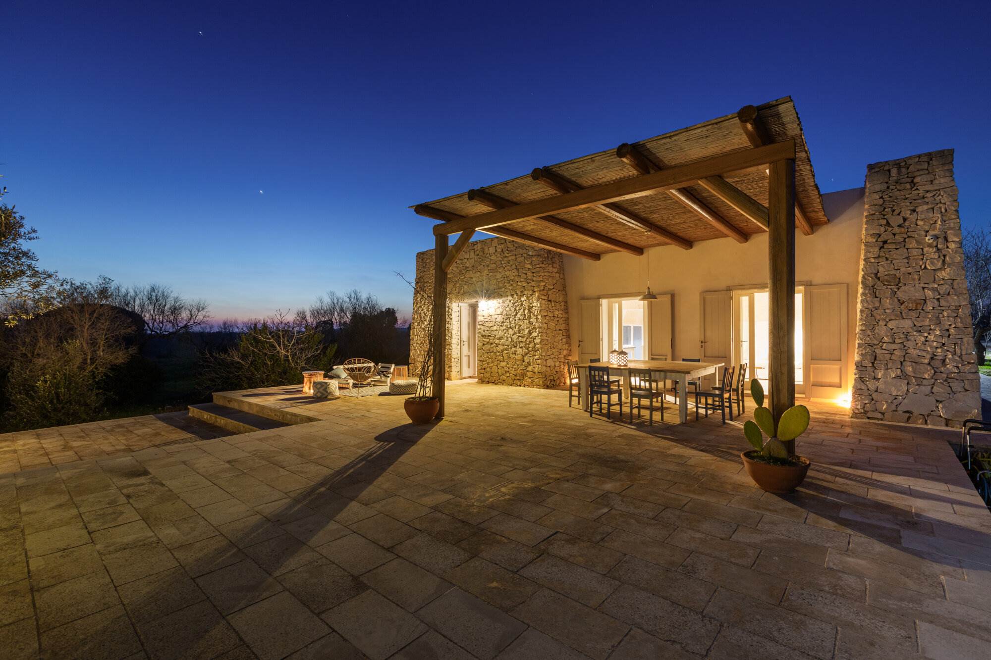 L'esterno della villa è altrettanto impressionante, con un pergolato terrazzato, arredi da esterno, chaise longue e una cucina in tufi antichi, attrezzata con lavello, piano cottura, piano di lavoro e forno barbecue, il tutto con vista sulla piscina. Quest'ultima è realizzata in teak e comprende un tavolo apribile, lettini extralarge, una zona salotto con comodi cuscini e persino una zona idromassaggio. Grazie al sistema di riscaldamento, la piscina può essere goduta in ogni stagione.